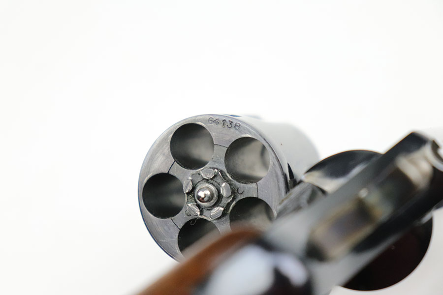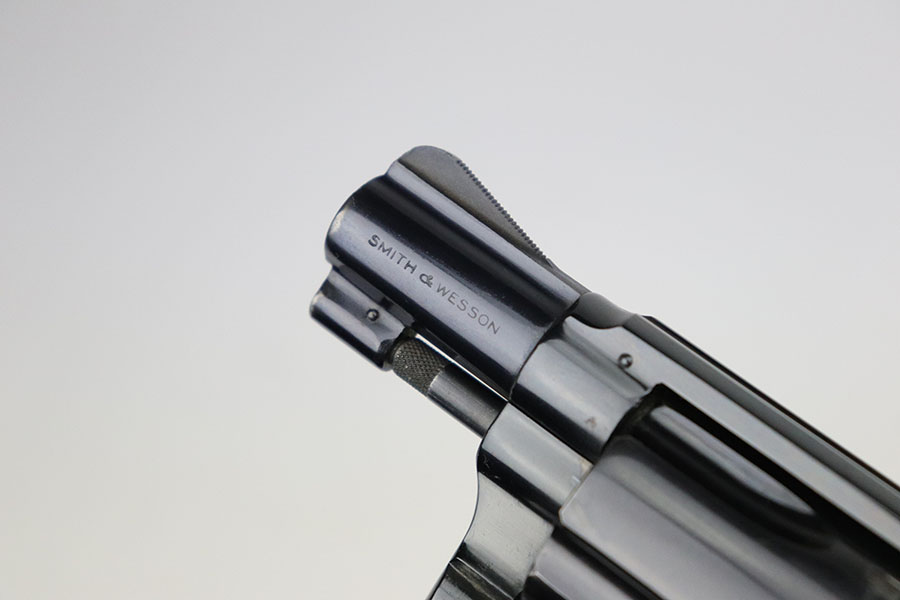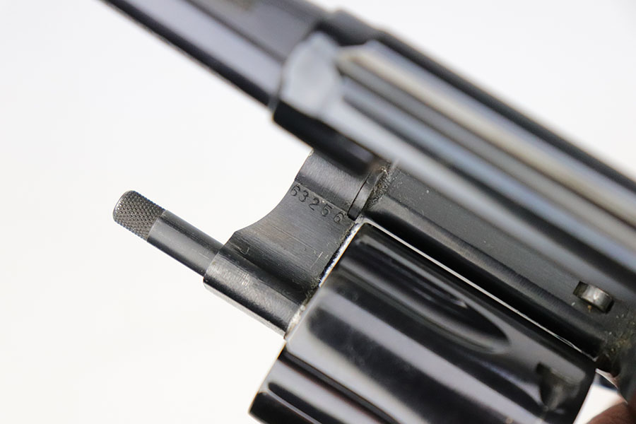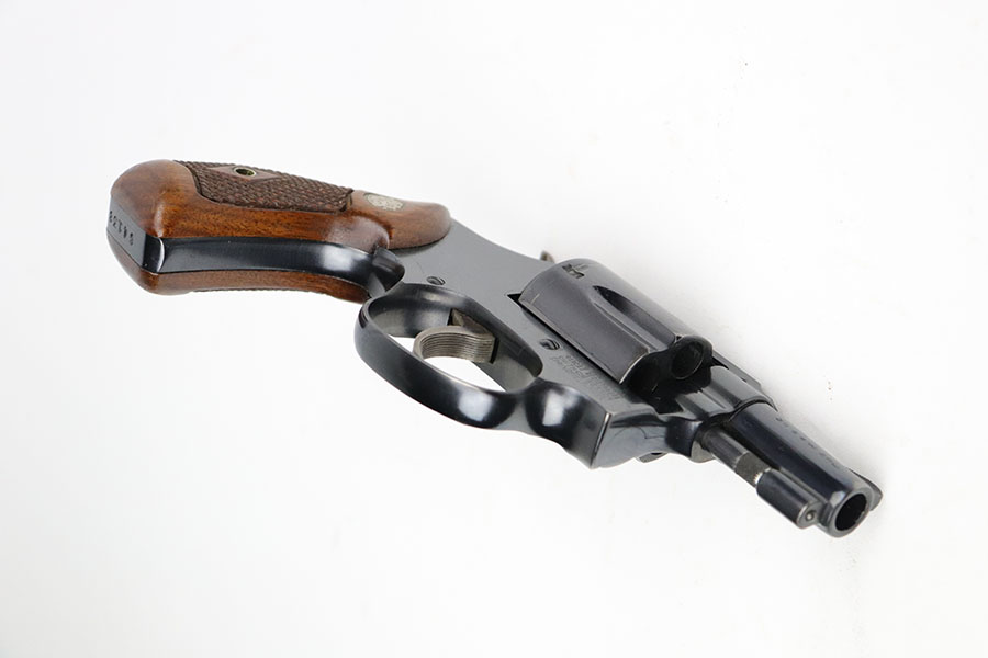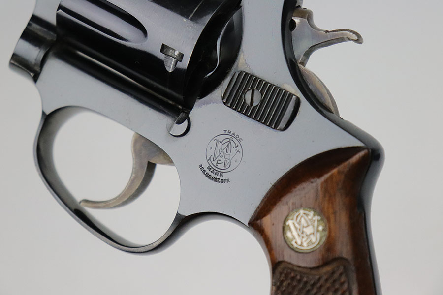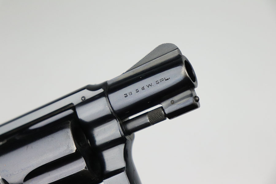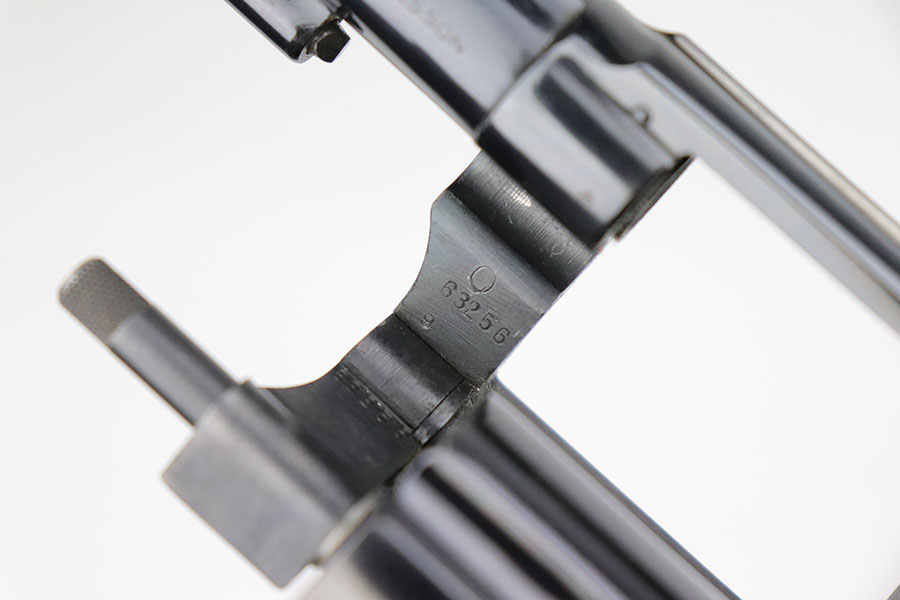 8/11/20 – This is a near-mint Smith & Wesson Model 36 in the original, matching box. Made in 1955, the revolver has 98-99% of the original blue with just a bit of muzzle wear and a roll mark on the cylinder. The Model 36 was designed in the era just after World War II, when Smith & Wesson stopped producing war materials and resumed normal production. For the Model 36, they sought to design a revolver that could fire the more powerful .38 special round in a small, concealable package. The new design was introduced at the International Association of Chiefs of Police convention in 1950, and was favorably received. A vote was held to name the new revolver, and the name “Chiefs Special” won. This one comes with the matching box and has a minty bore. Original grips are present and the right grip is numbered to the gun.