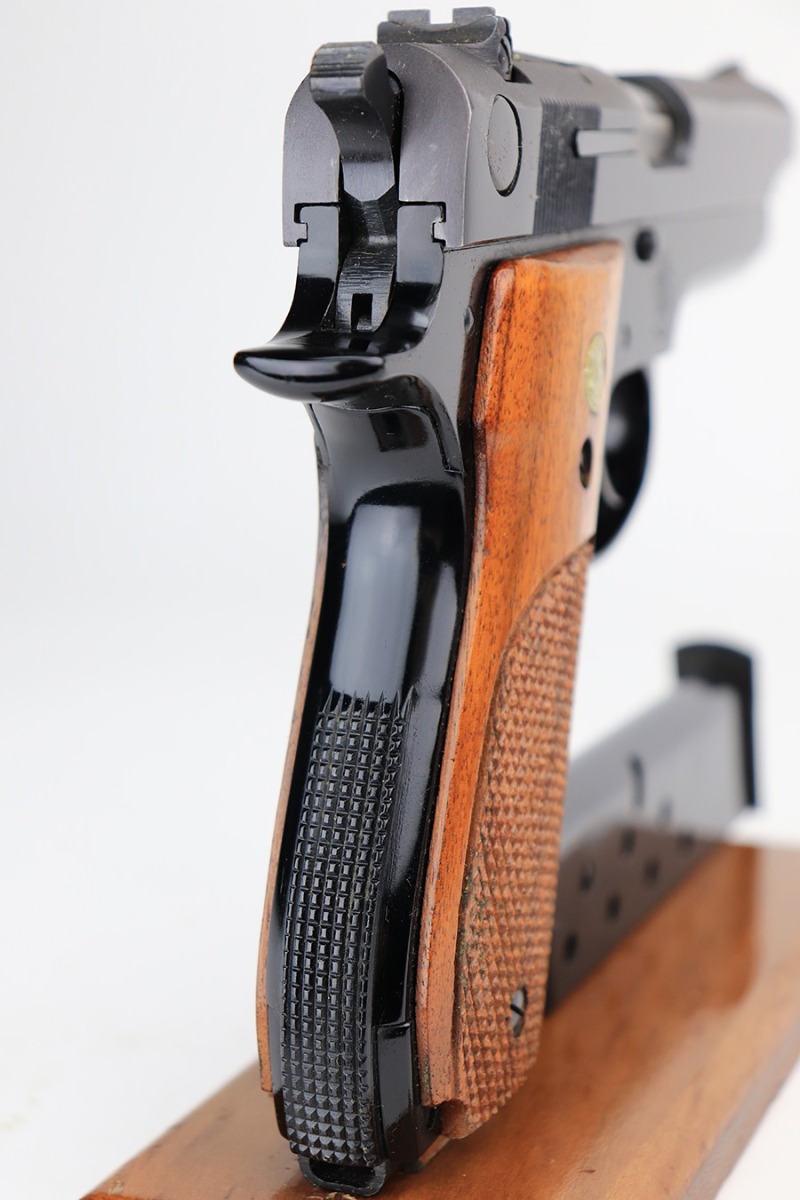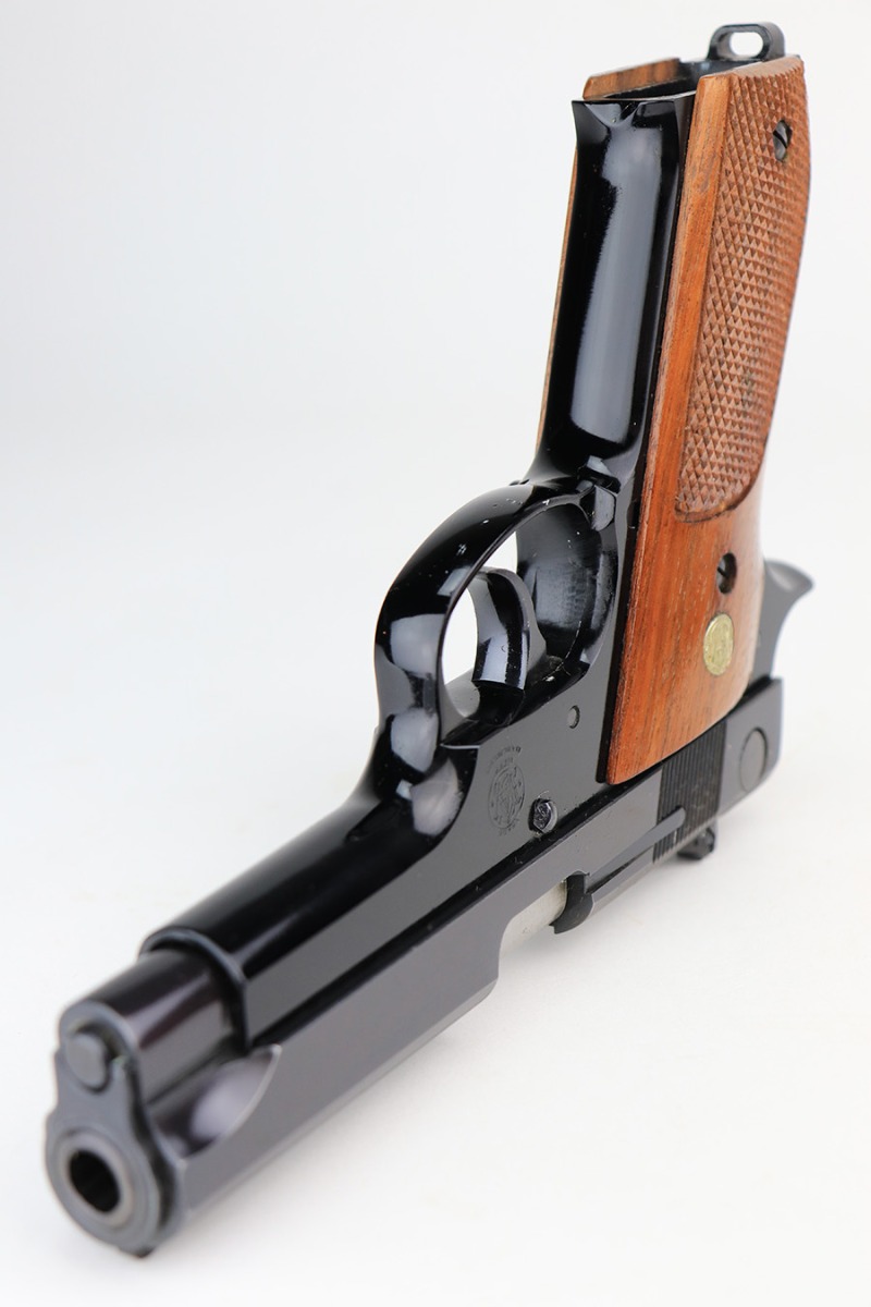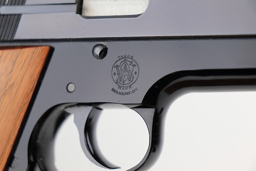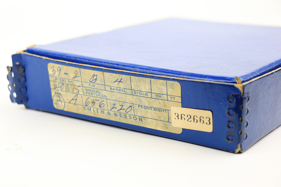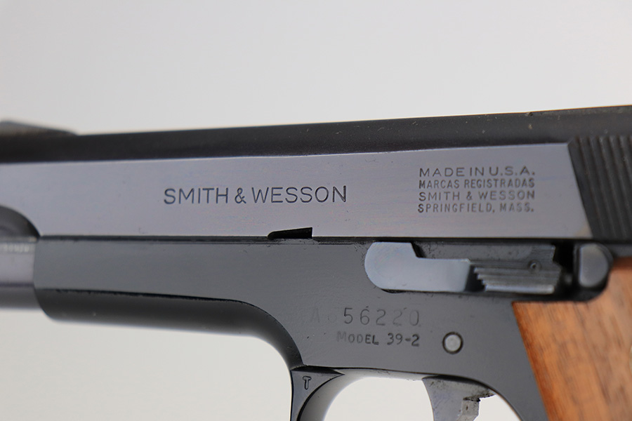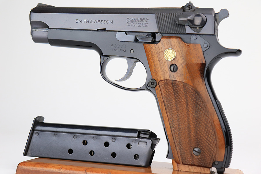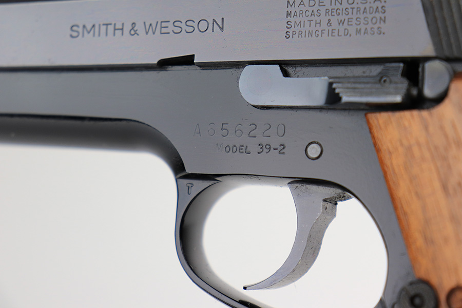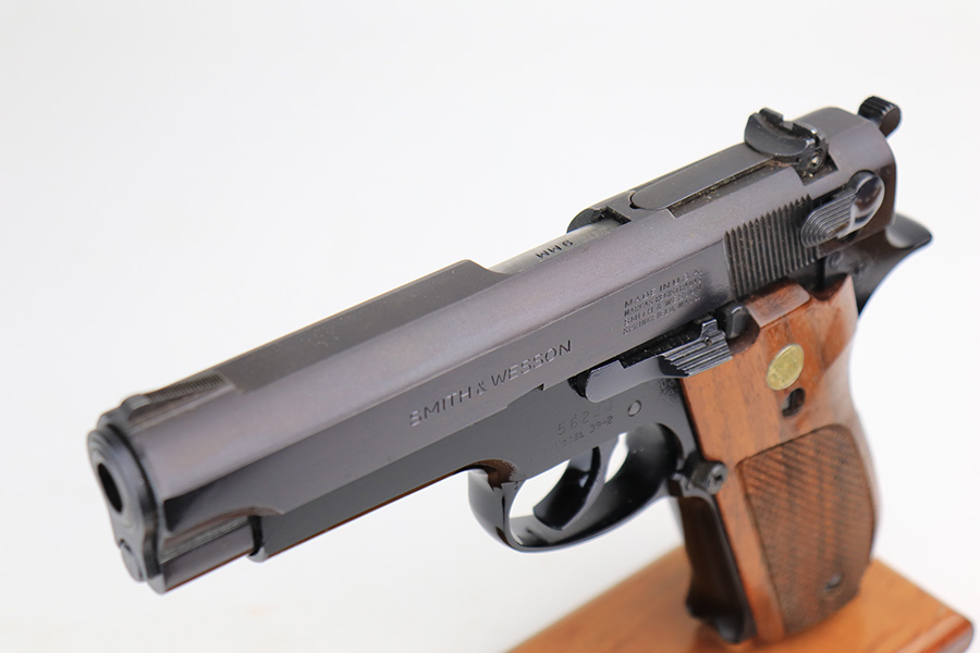 4/19/22 – This is a mint example of a Smith & Wesson Model 39-2 semi auto pistol manufactured in the 1980’s. The gun comes with the original matching-numbered box, owners manual, cleaning kit, and one proper magazine. This gun also has a lightweight aluminum frame. It is in like-new condition with almost no signs of wear except for a few tiny handling marks on the underside of the trigger guard. Comes with minty wood grips. The bore is mint.