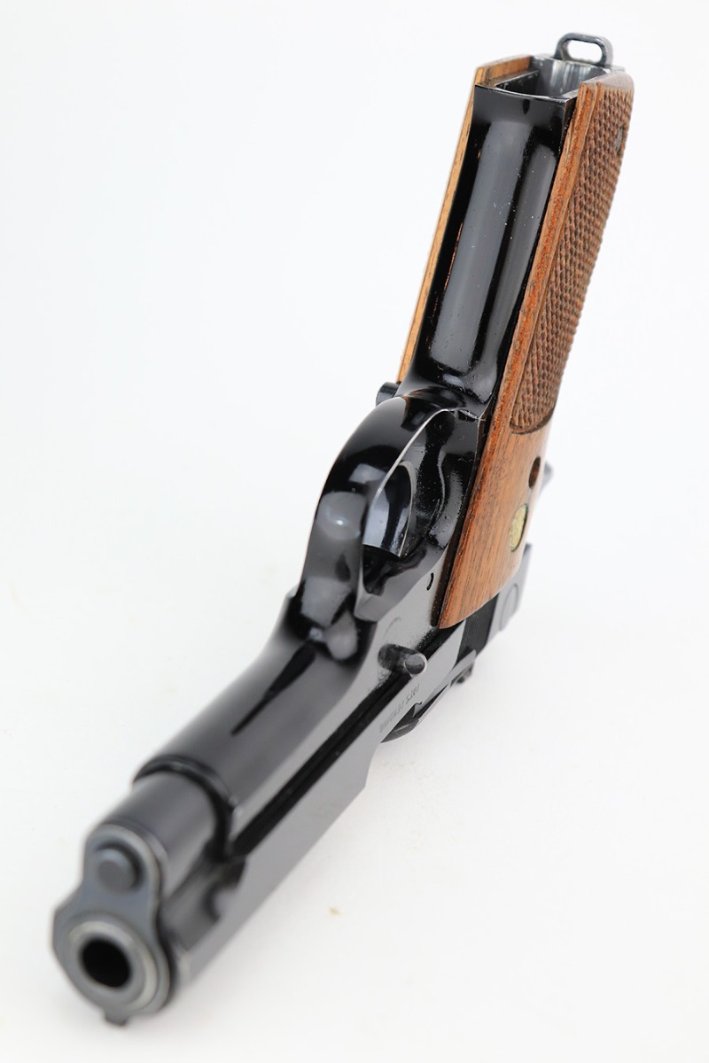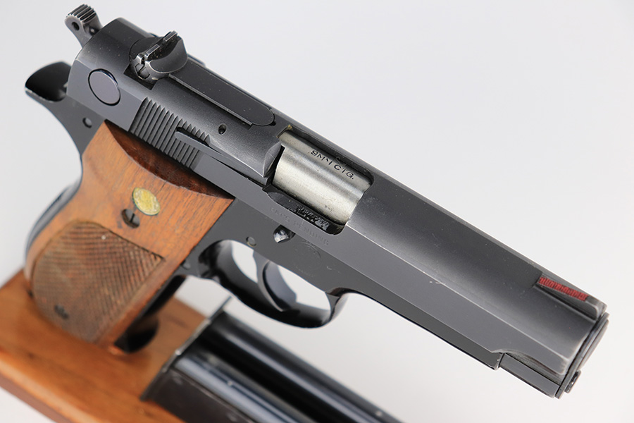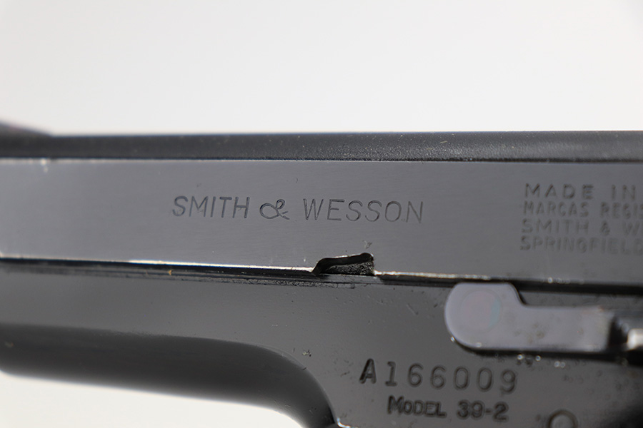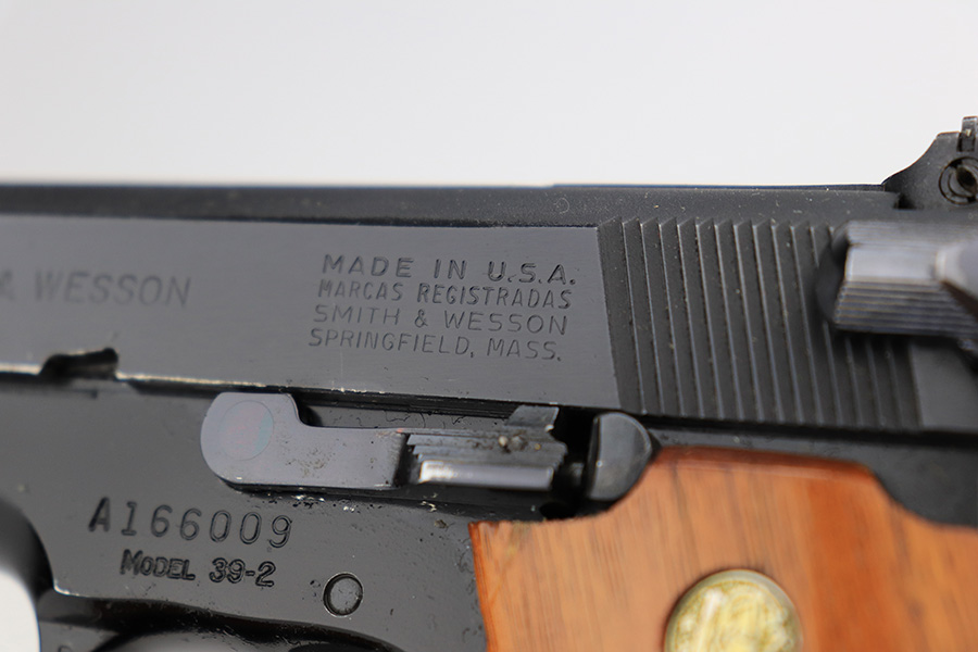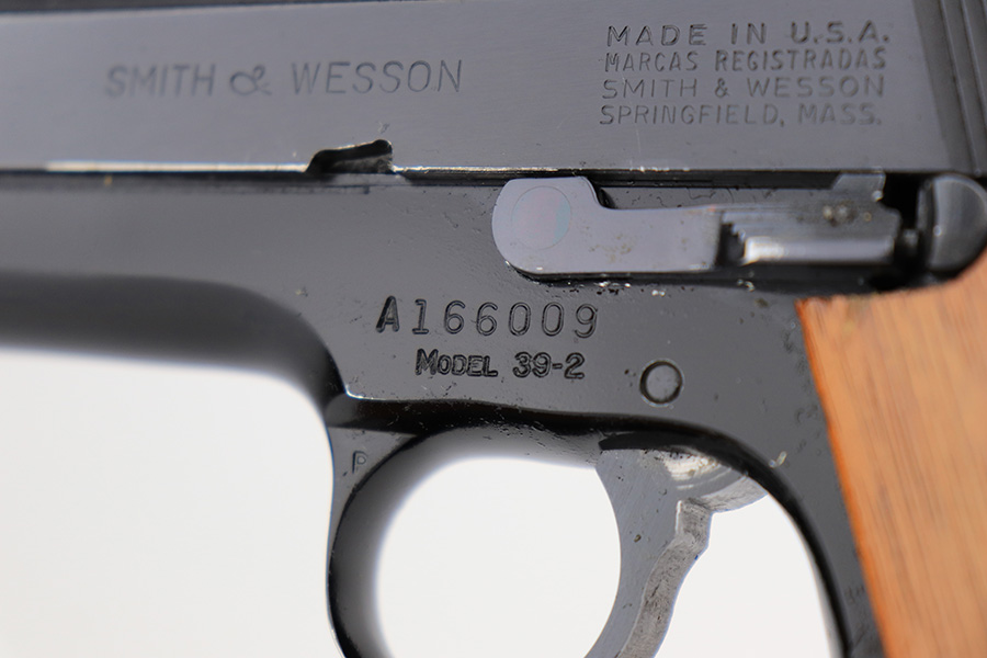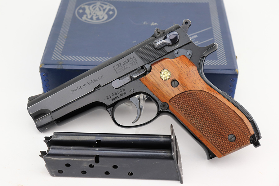 5/4/23 – This is a near-mint example of a Smith & Wesson Model 39-2 manufactured in the 1970’s and chambered in 9mm. It is all matching and comes with its original matching-numbered box, owners manual, and two proper magazines. The gun itself has retained nearly all of its original finish with just a hint of muzzle wear. Fitted with excellent wood grips. Mint bore.