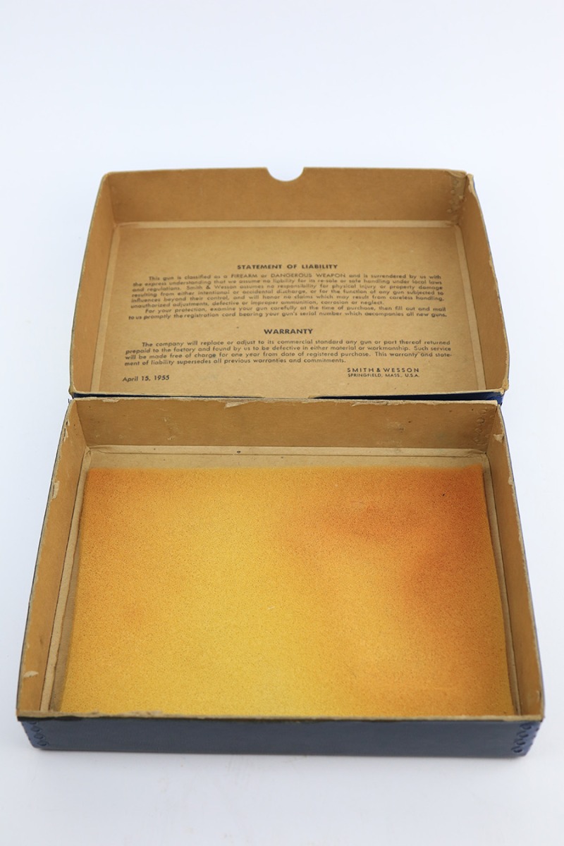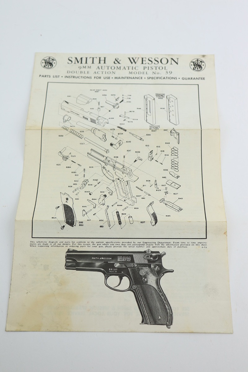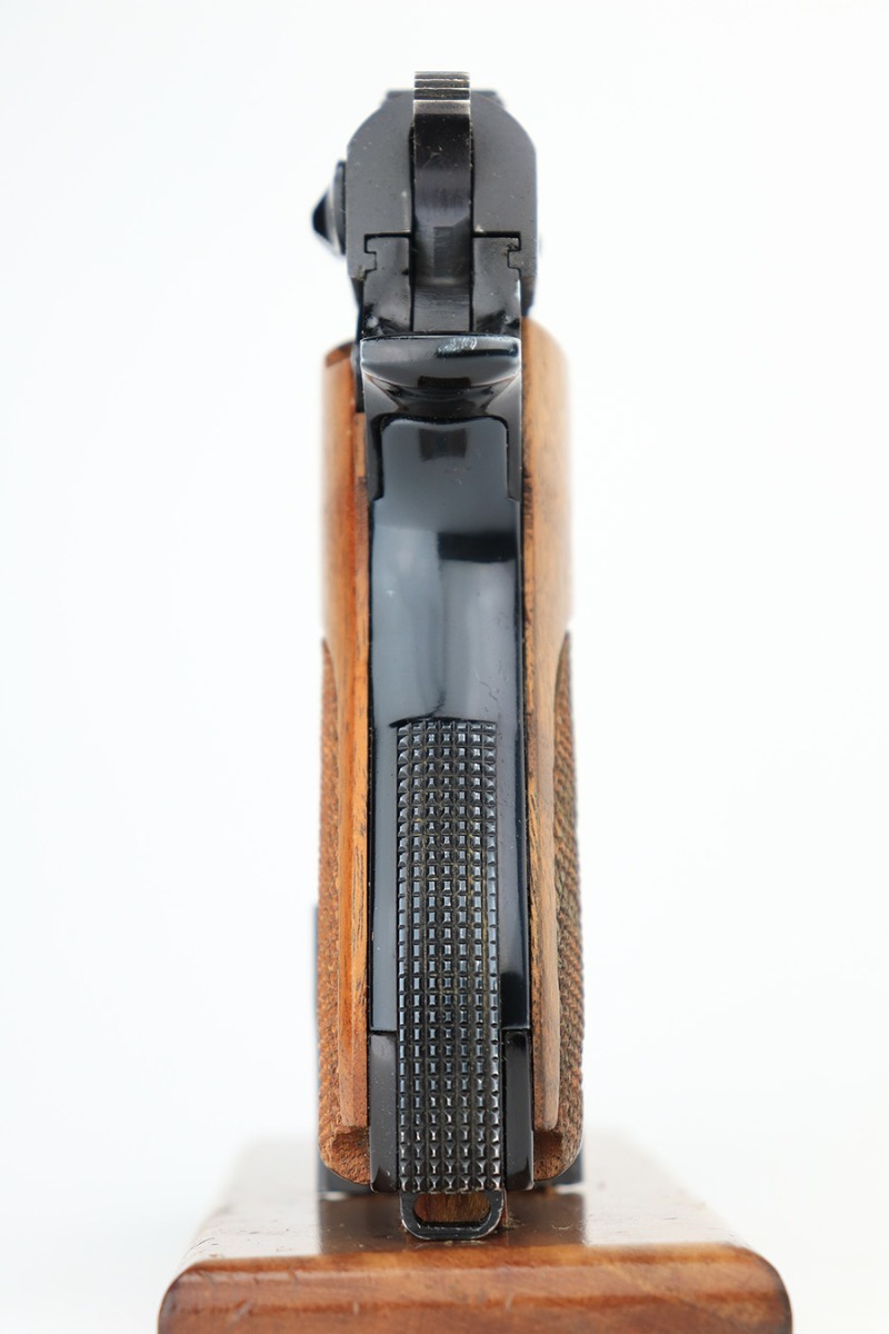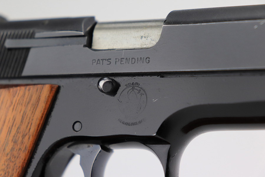 5/4/23 – This is a near-mint example of a Smith & Wesson Model 39-2 manufactured in the 1970’s and chambered in 9mm. It is all matching and comes with its original matching-numbered box, owners manual, and two proper magazines. The gun itself has retained nearly all of its original finish with just a hint of muzzle wear. Fitted with excellent wood grips. Mint bore.