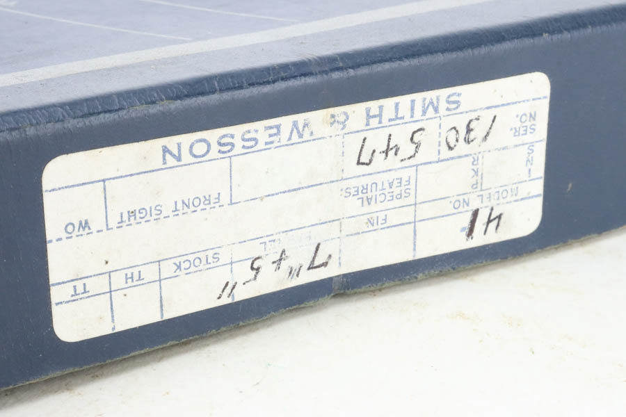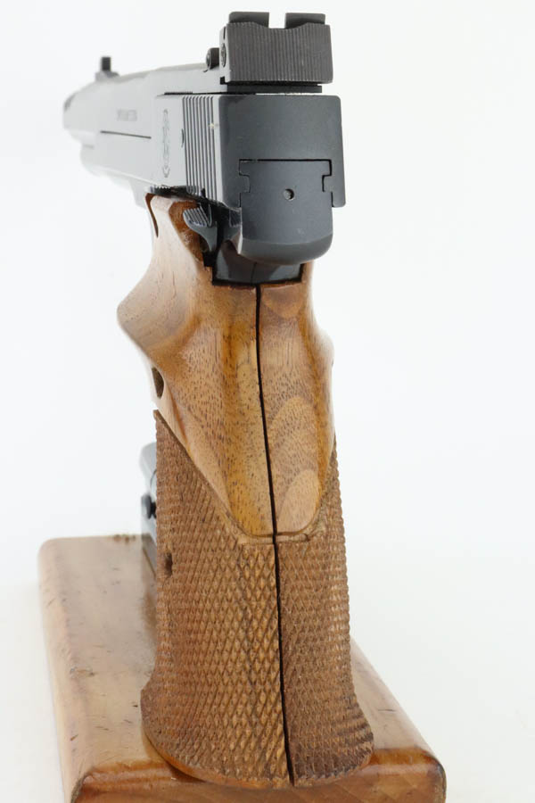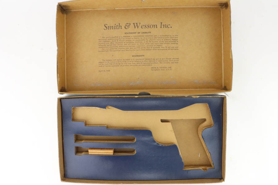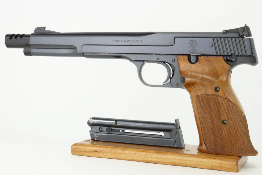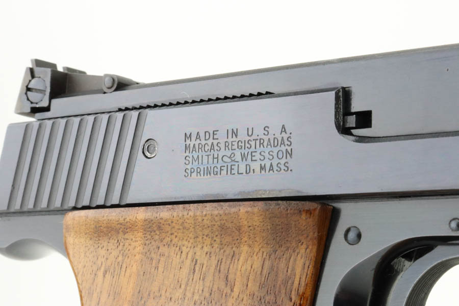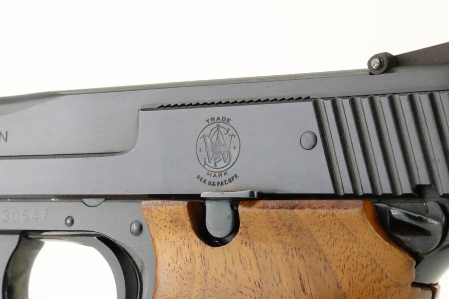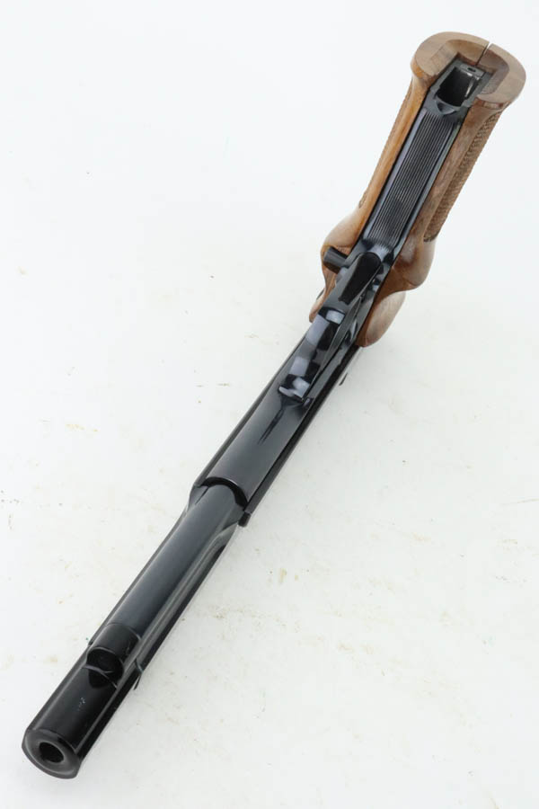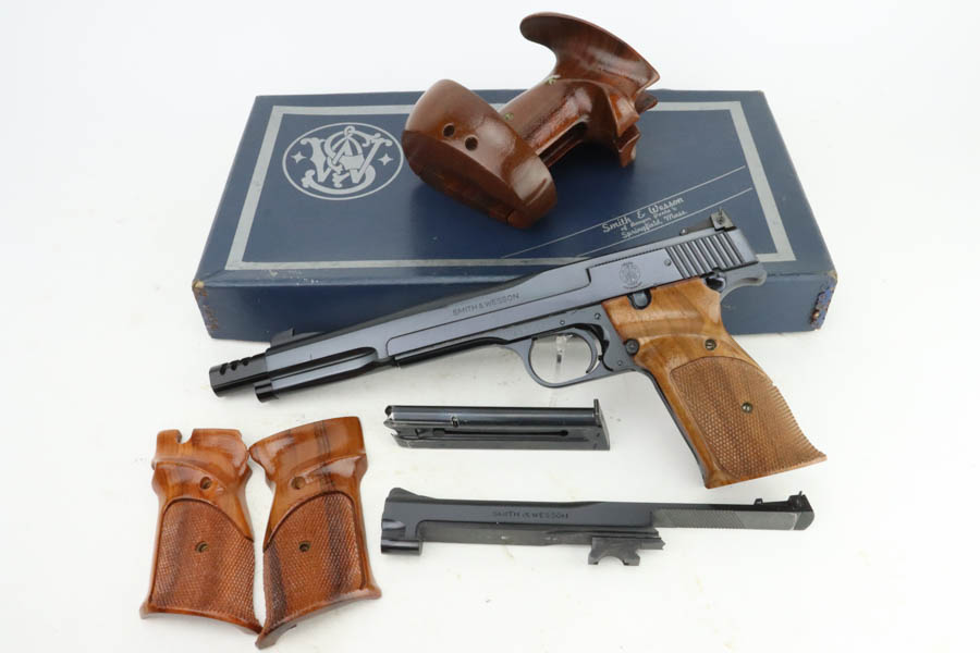 7/19/24 – This is a mint example of a Smith & Wesson Model 41, manufactured in about 1970 and chambered in .22 LR. It comes with its matching numbered box, a spare 5″ slide (the slide on the gun currently is 7″), one magazine, warranty card, a spare set of checkered wood grips, and a spare target-style wood grip. The gun is currently equipped with a muzzle attachment. It is in like-new condition with no signs of wear or use. Mint bore.