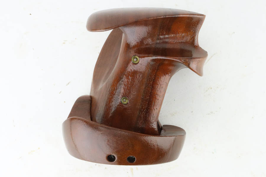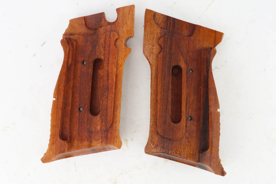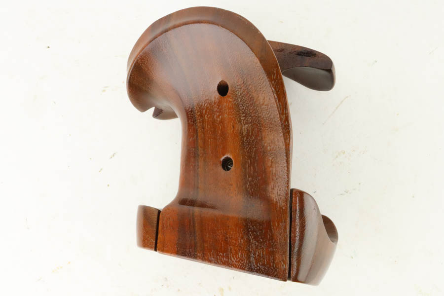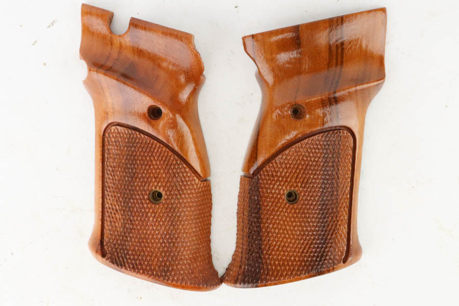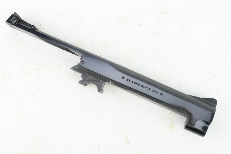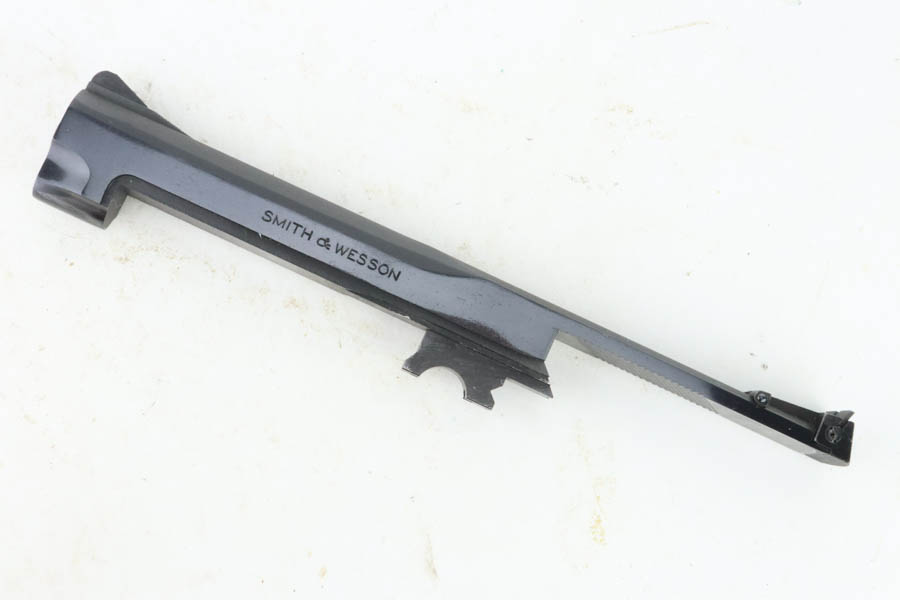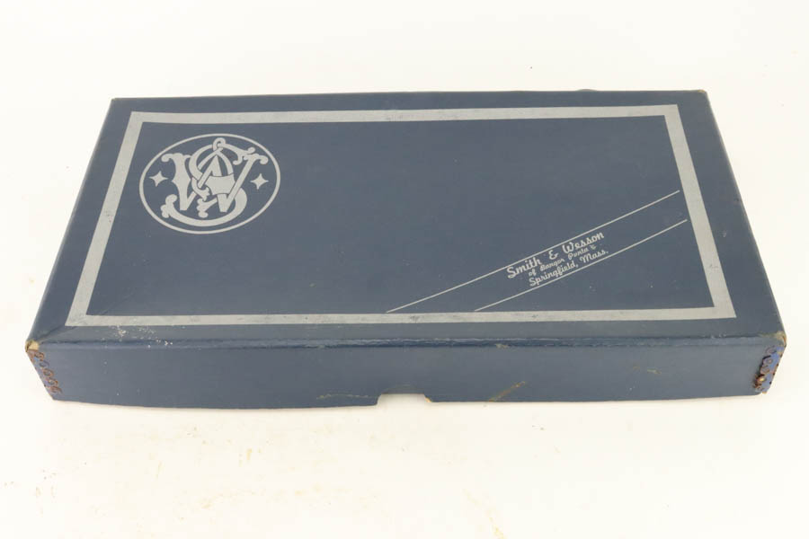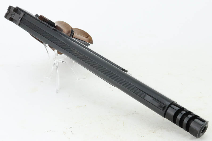 7/19/24 – This is a mint example of a Smith & Wesson Model 41, manufactured in about 1970 and chambered in .22 LR. It comes with its matching numbered box, a spare 5″ slide (the slide on the gun currently is 7″), one magazine, warranty card, a spare set of checkered wood grips, and a spare target-style wood grip. The gun is currently equipped with a muzzle attachment. It is in like-new condition with no signs of wear or use. Mint bore.