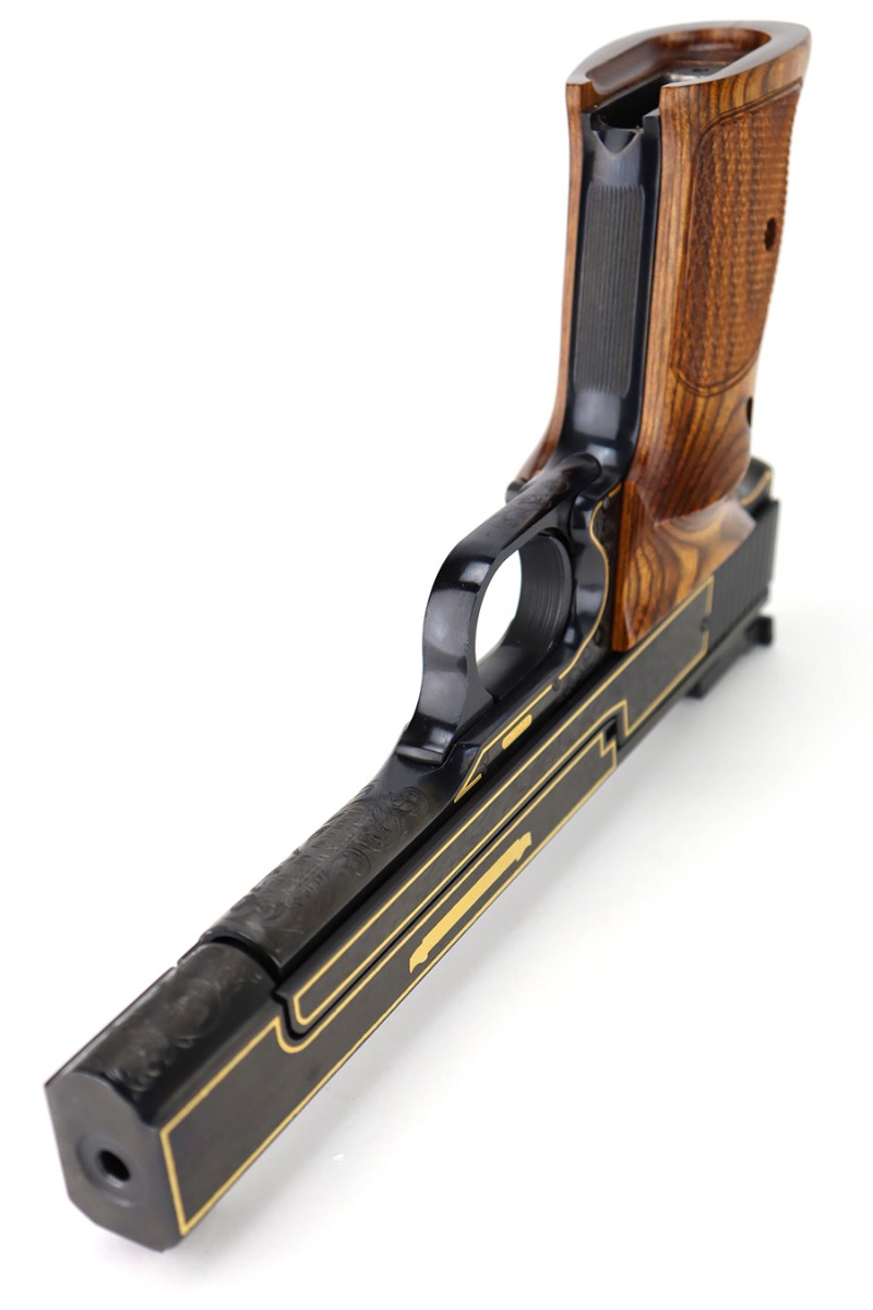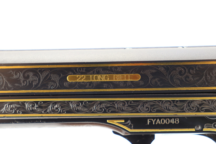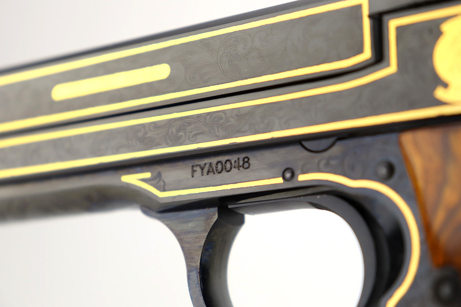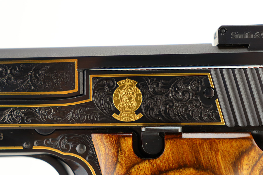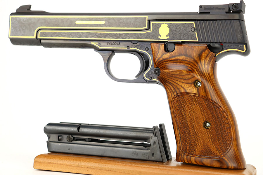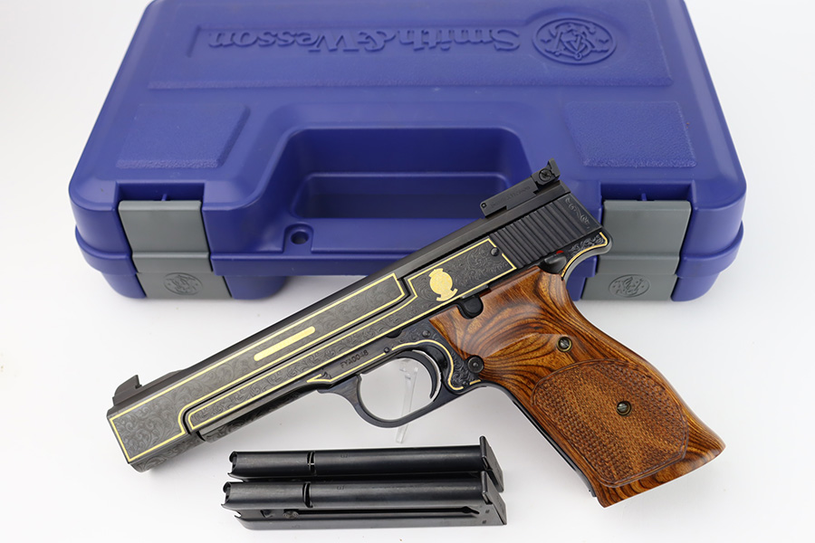 1/12/24 – This is a like-new example of a Smith & Wesson Model 41 50th Anniversary Commemorative. One of only 500 made in 2007. Comes with its original matching hard case, sales papers, owners manual, and two magazines. The gun itself is beautiful with factory engraving throughout and gold highlights. Like-new with no signs of wear. Excellent checkered wood grips. Mint bore. One of the magazines fits tight inside the gun and is a little tough to get in and out.