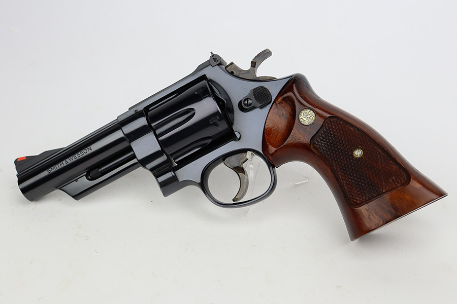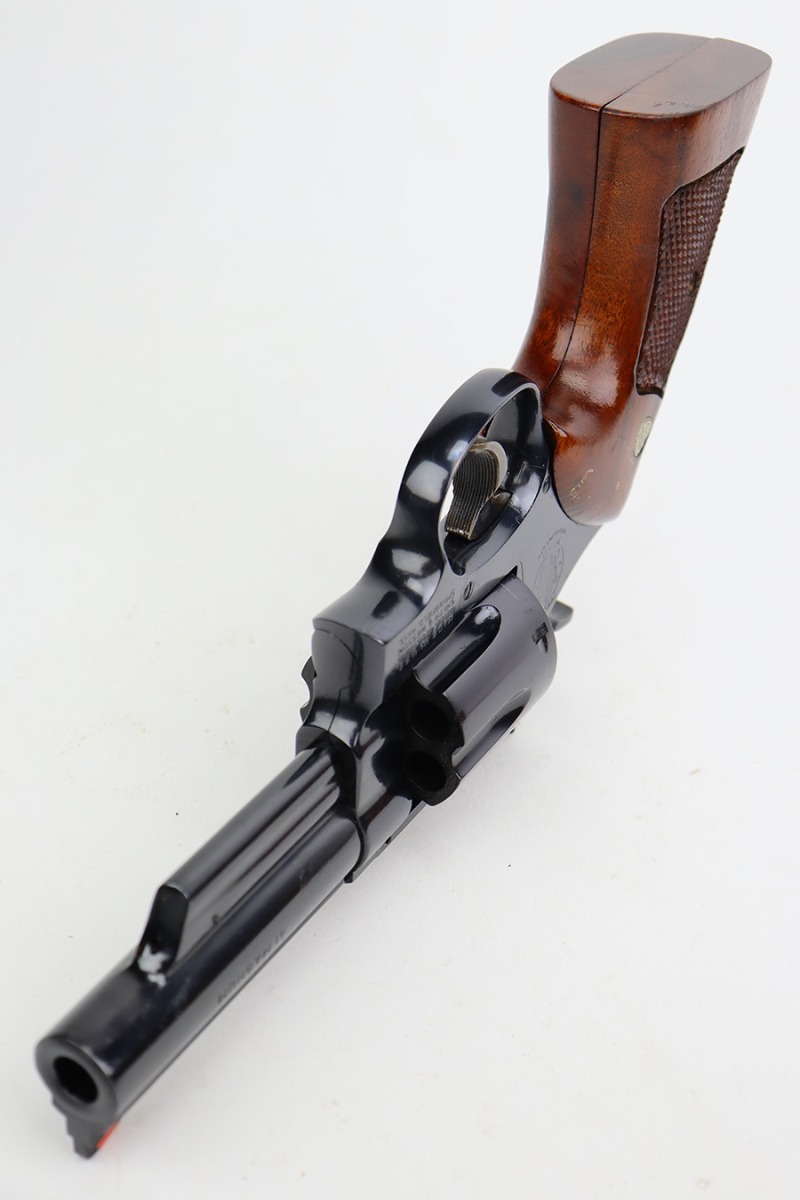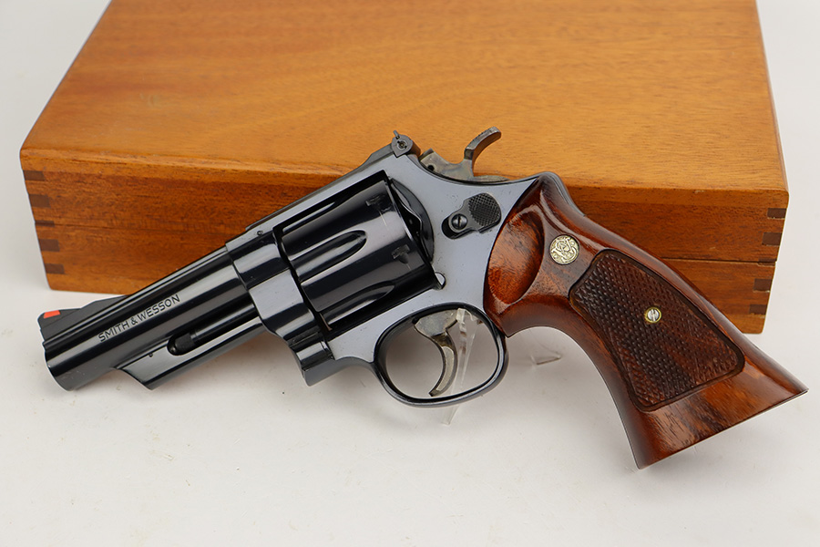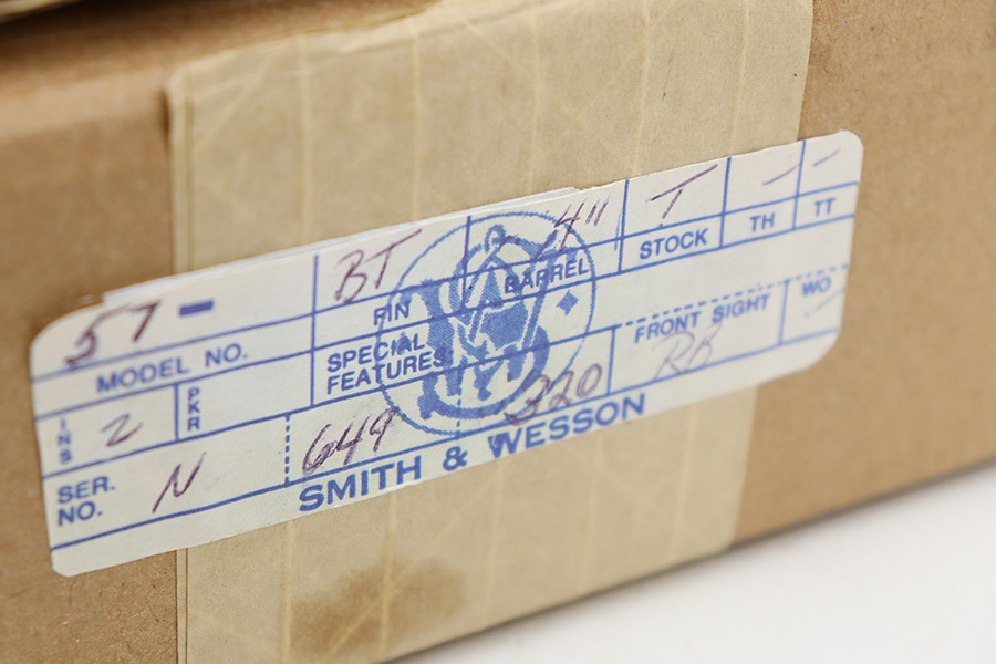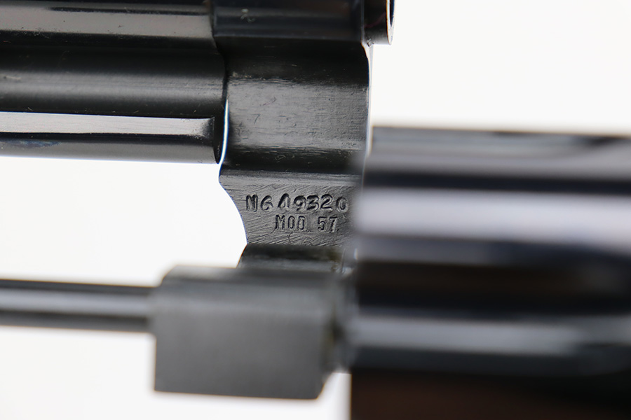 8/8/23 – This is a mint example of a Smith & Wesson Model 57 revolver, manufactured in 1980 and chambered in .41 Magnum. It is all matching and comes with its matching-numbered cardboard box, wood presentation case, multitool, and cleaning rod with brushes. The gun itself has retained essentially all of its original high polish finish with just an extremely light roll mark on the cylinder. Fitted with beautiful hand-checkered wood grips. Like-new bore.