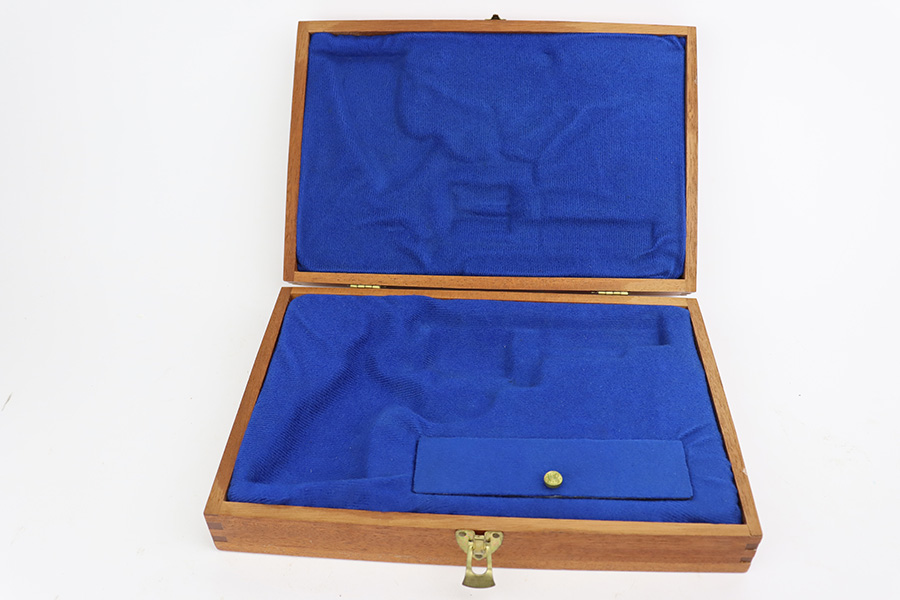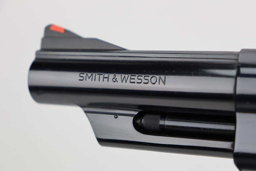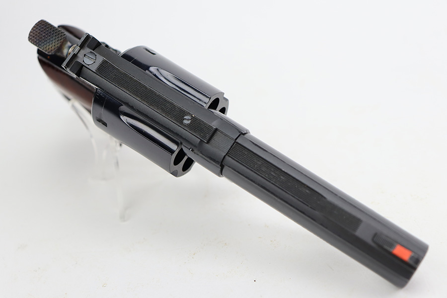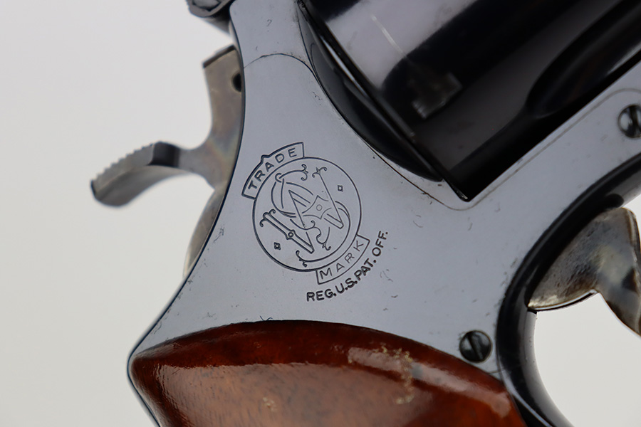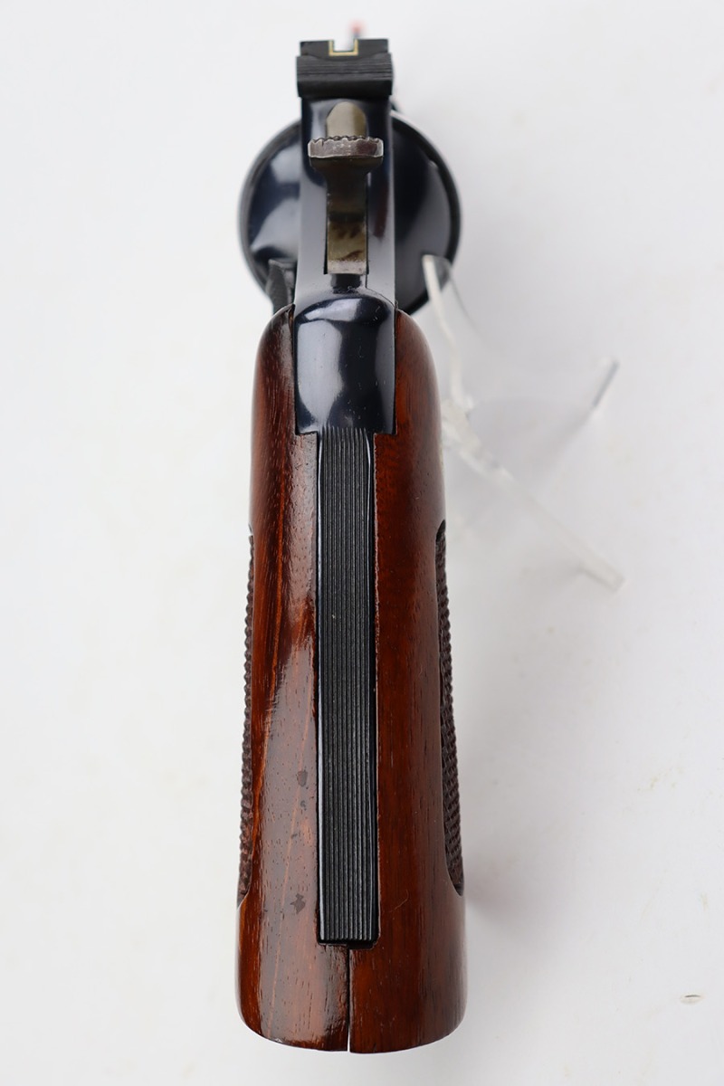 8/8/23 – This is a mint example of a Smith & Wesson Model 57 revolver, manufactured in 1980 and chambered in .41 Magnum. It is all matching and comes with its matching-numbered cardboard box, wood presentation case, multitool, and cleaning rod with brushes. The gun itself has retained essentially all of its original high polish finish with just an extremely light roll mark on the cylinder. Fitted with beautiful hand-checkered wood grips. Like-new bore.