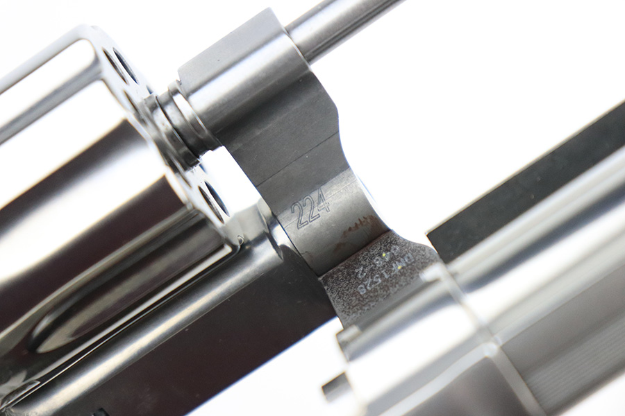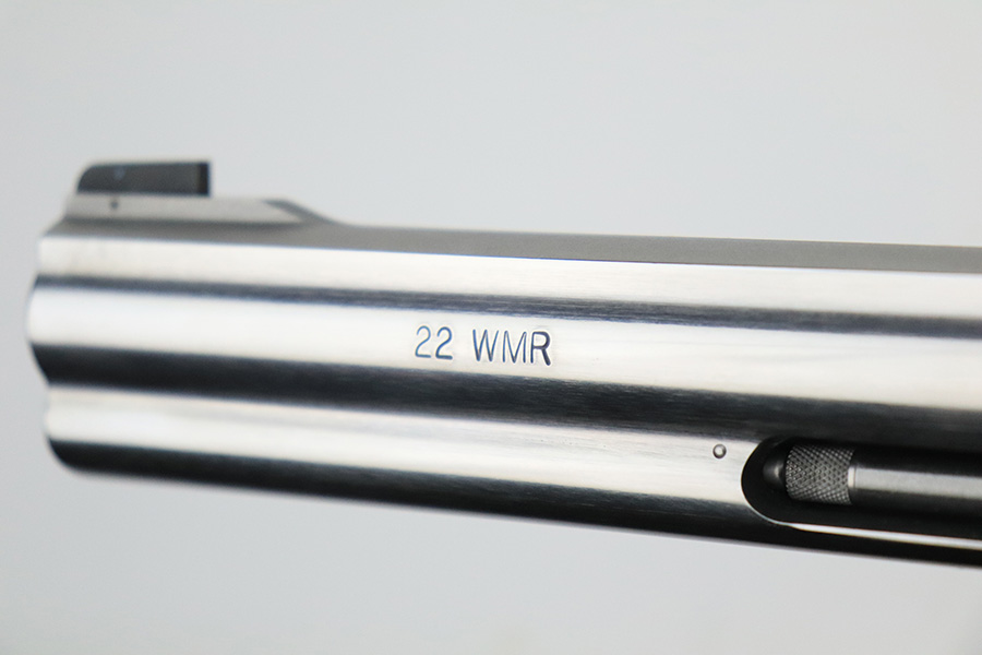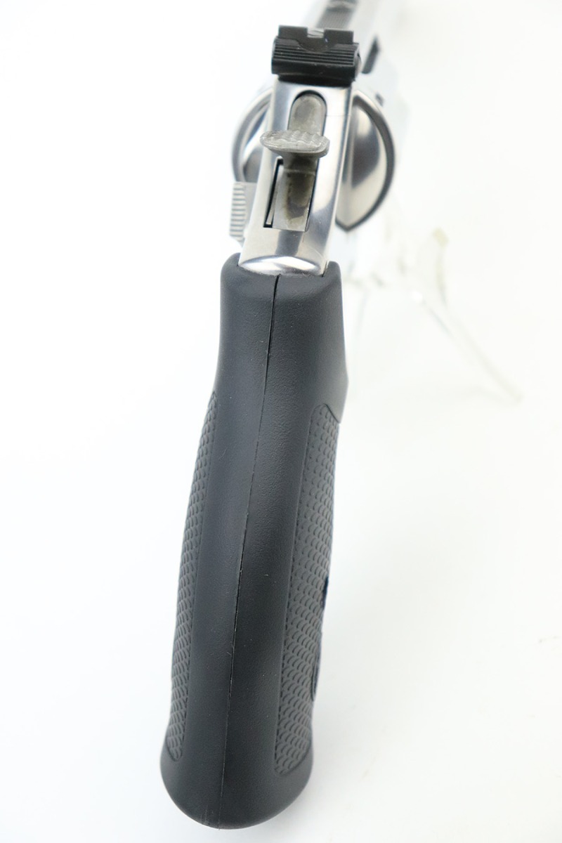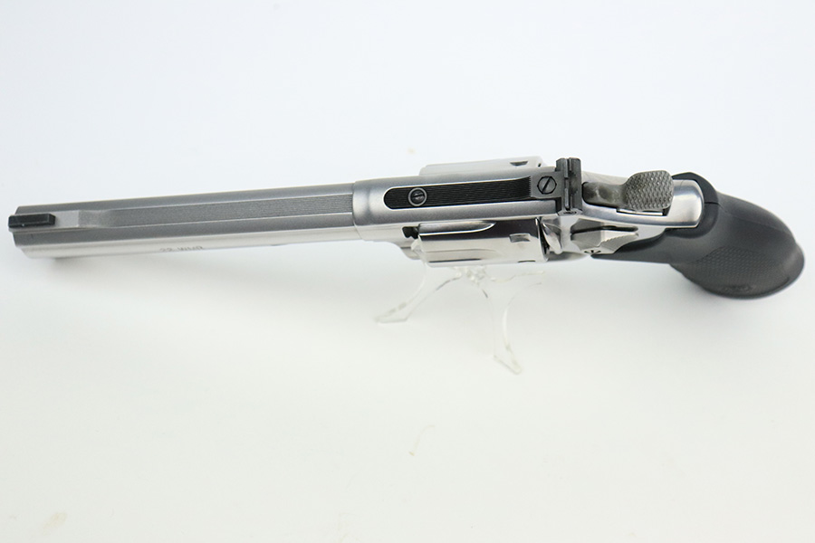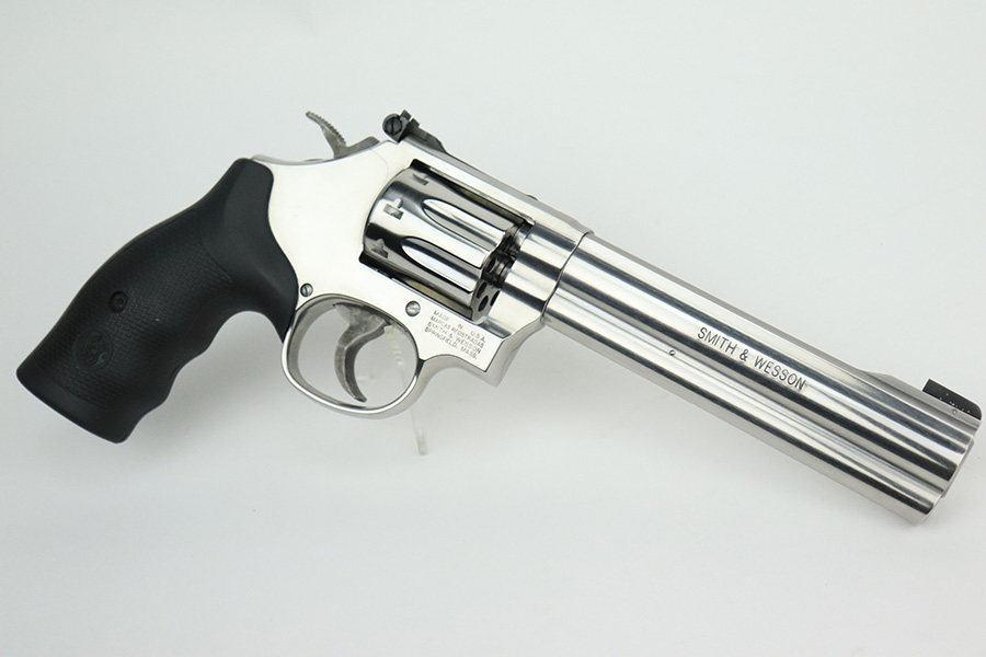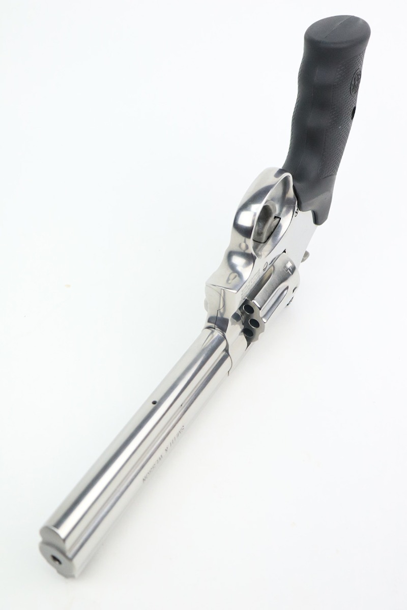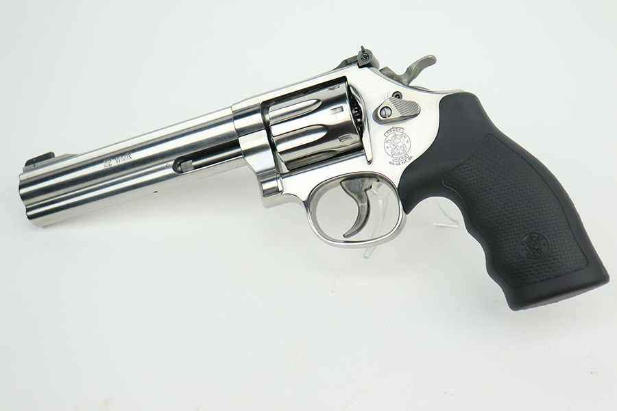 7/20/22 – This is a mint example of a Smith and Wesson Model 648-2 Revolver. It has a stainless finish, a 6″ barrel, and is chambered in .22 WMR. It comes with its original matching hard case, owners manual, and gun lock. It is in like-new condition with no obvious signs of wear or use except for a very light roll mark on the cylinder. Comes with a excellent black rubber grip. Mint bore. The cylinder is tight and the action is smooth.