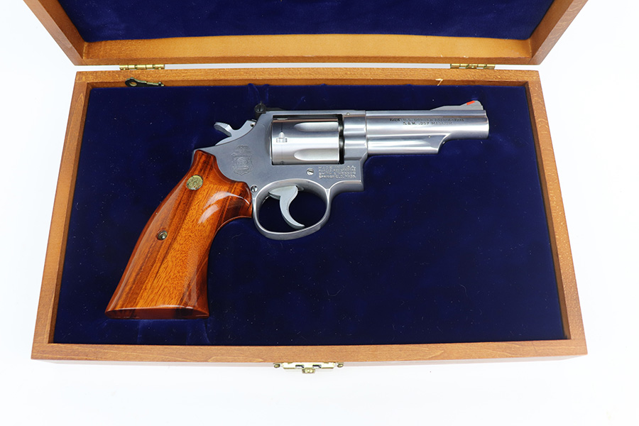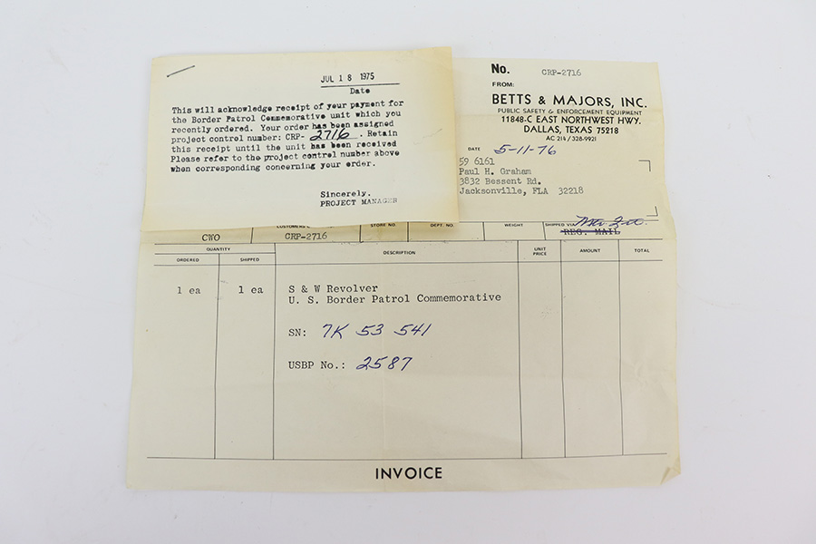 8/5/21 – This is an ANIB Smith & Wesson Model 66 in the original display case that is in near-mint condition. There’s a minor roll mark on the cylinder, and just a tiny hint of muzzle wear. Beautiful bore and grips, with 4in barrel. These guns were a special edition made available for purchase to Border Patrol agents, and this one has the original paperwork from the order by Walter Scott. Serial dates it to 1975, so FFL required.