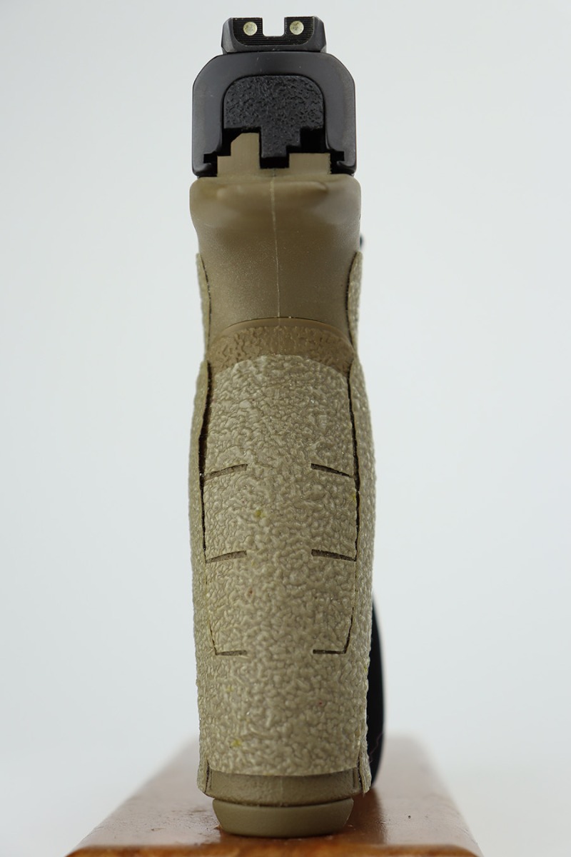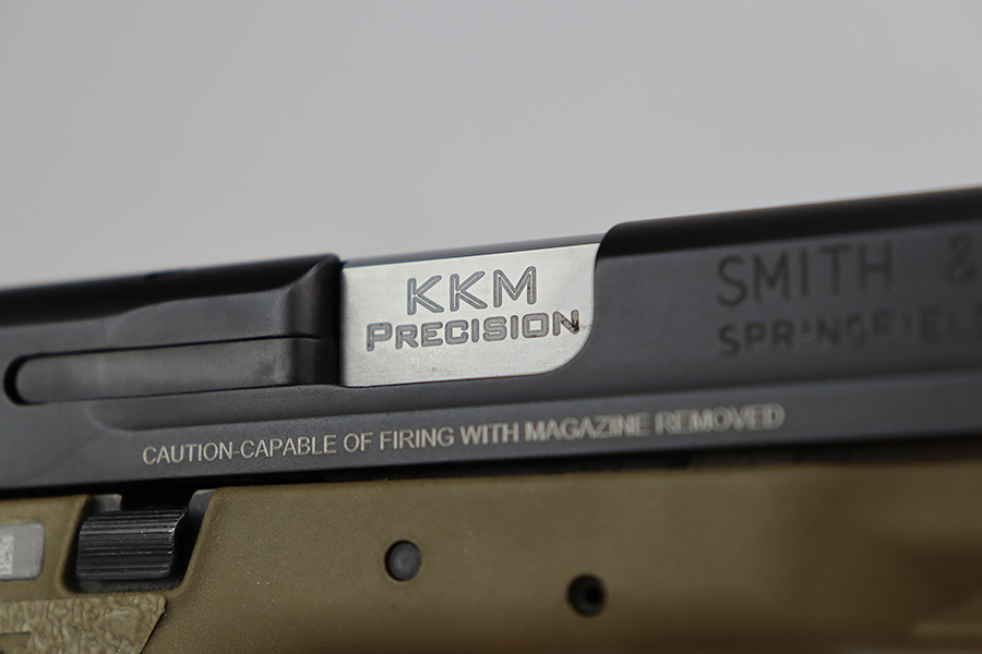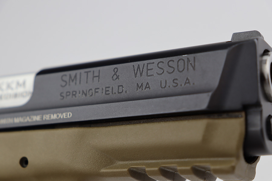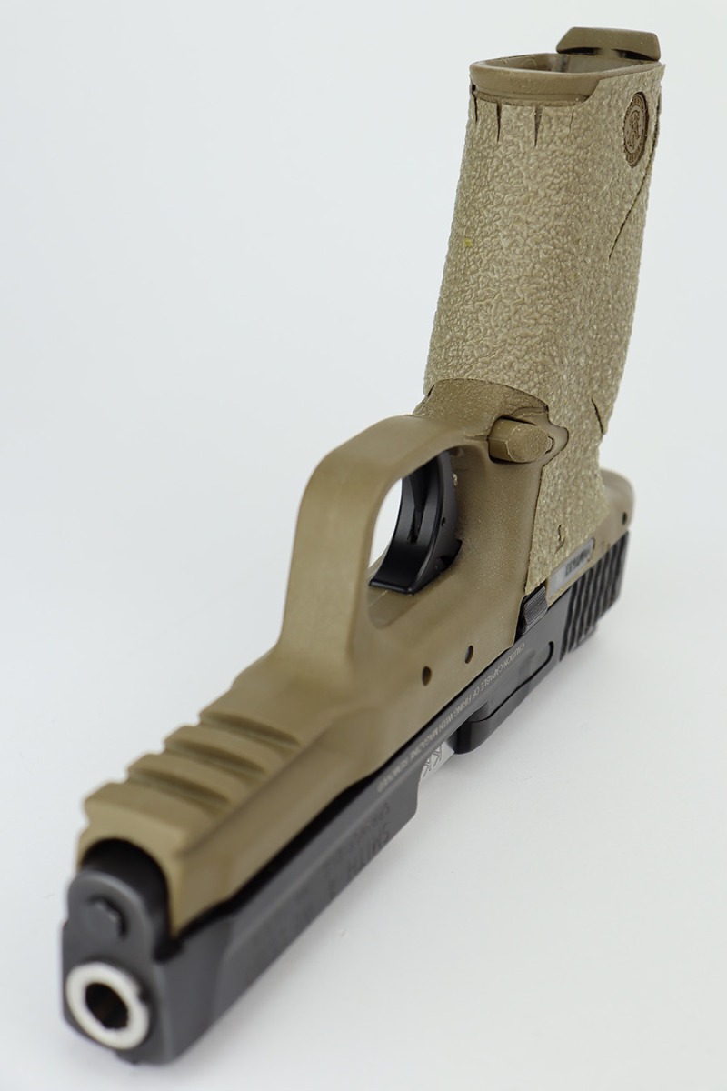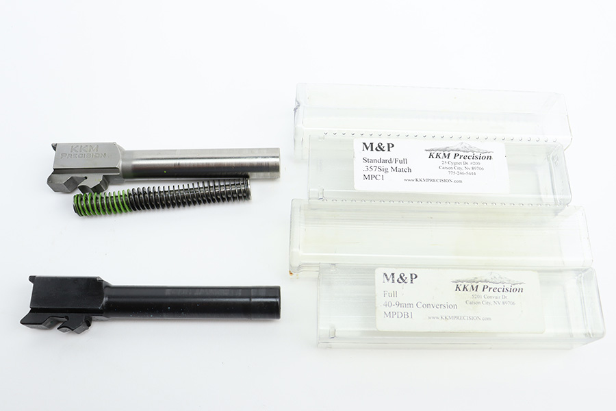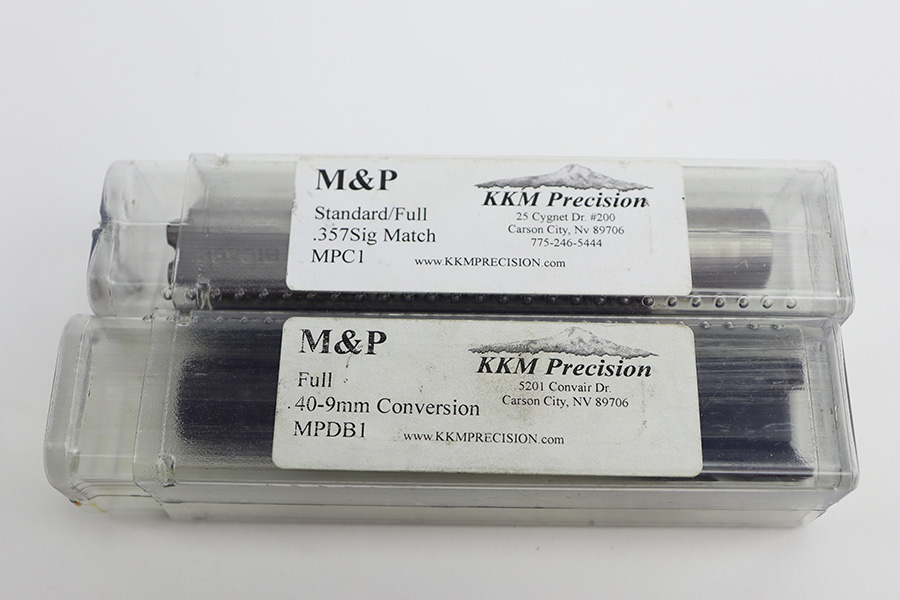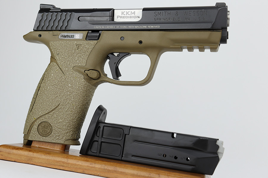 7/14/23 – This is a like-new example of a Smith & Wesson Model 40, chambered in .40 S&W. Blued slide with a really nice coyote-brown frame. Fitted with matching-colored Talon grip tape. Upgraded trigger. The gun comes with a KKW Precision .40 S&W to 9mm Luger conversion barrel, a KKW Precision .357 Sig Match barrel, and a spare recoil spring. It also comes with its original matching-numbered hard case, test fire casing, and one magazine. The gun itself shows no obvious signs of wear. Minty bore.