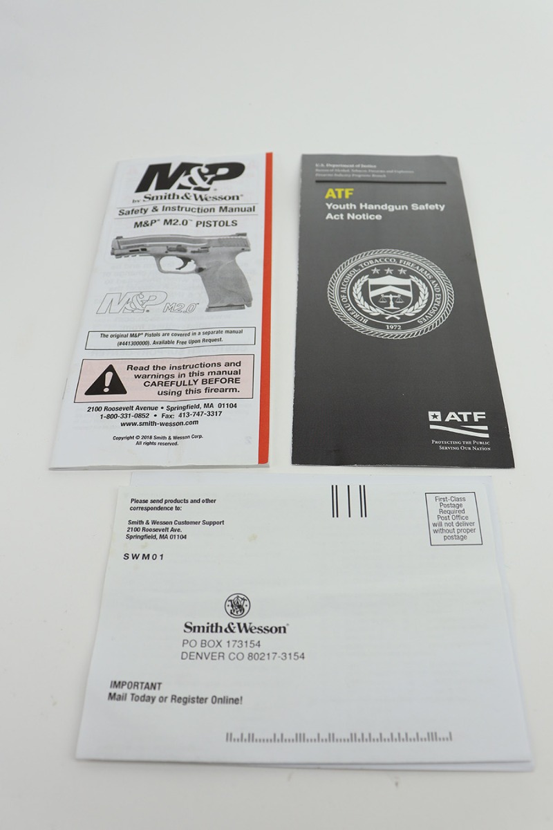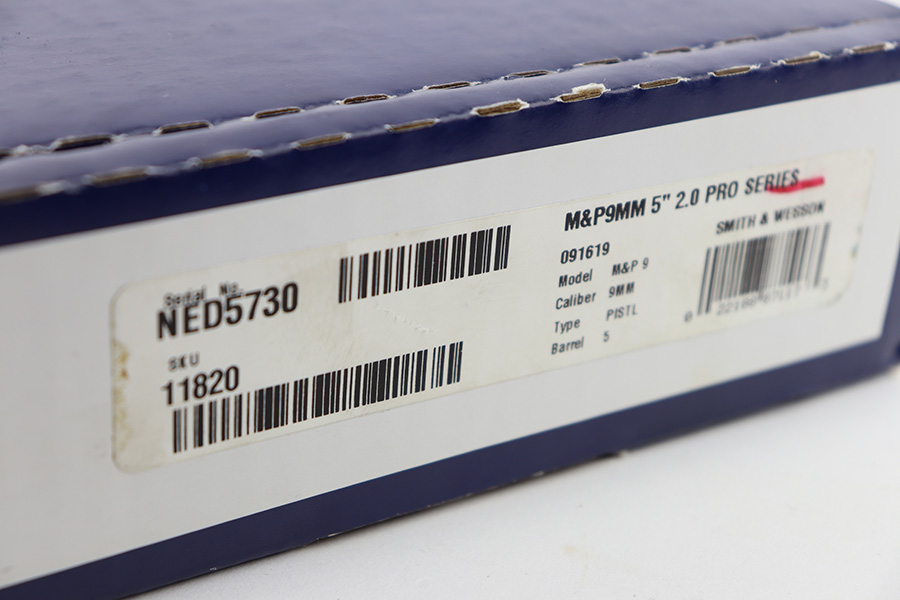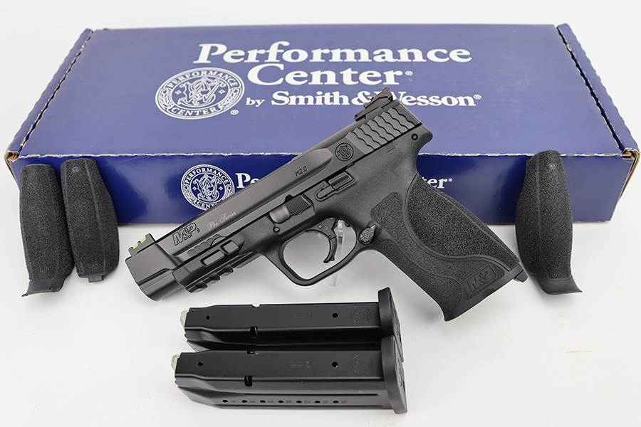 12/15/23 – This is a like-new Smith & Wesson M&P9 M2.0 Pro Series, chambered in 9mm. It has a really nice matte black finish and is fitted with black plastic grips. No sign of wear or use. Mint bore. It comes with its original matching-numbered box, owners manual, two magazines, gun lock, spare grip panels, and a cleaning kit.