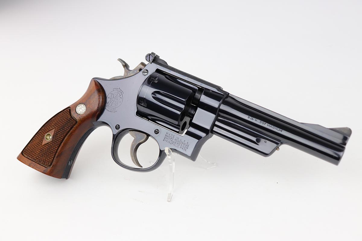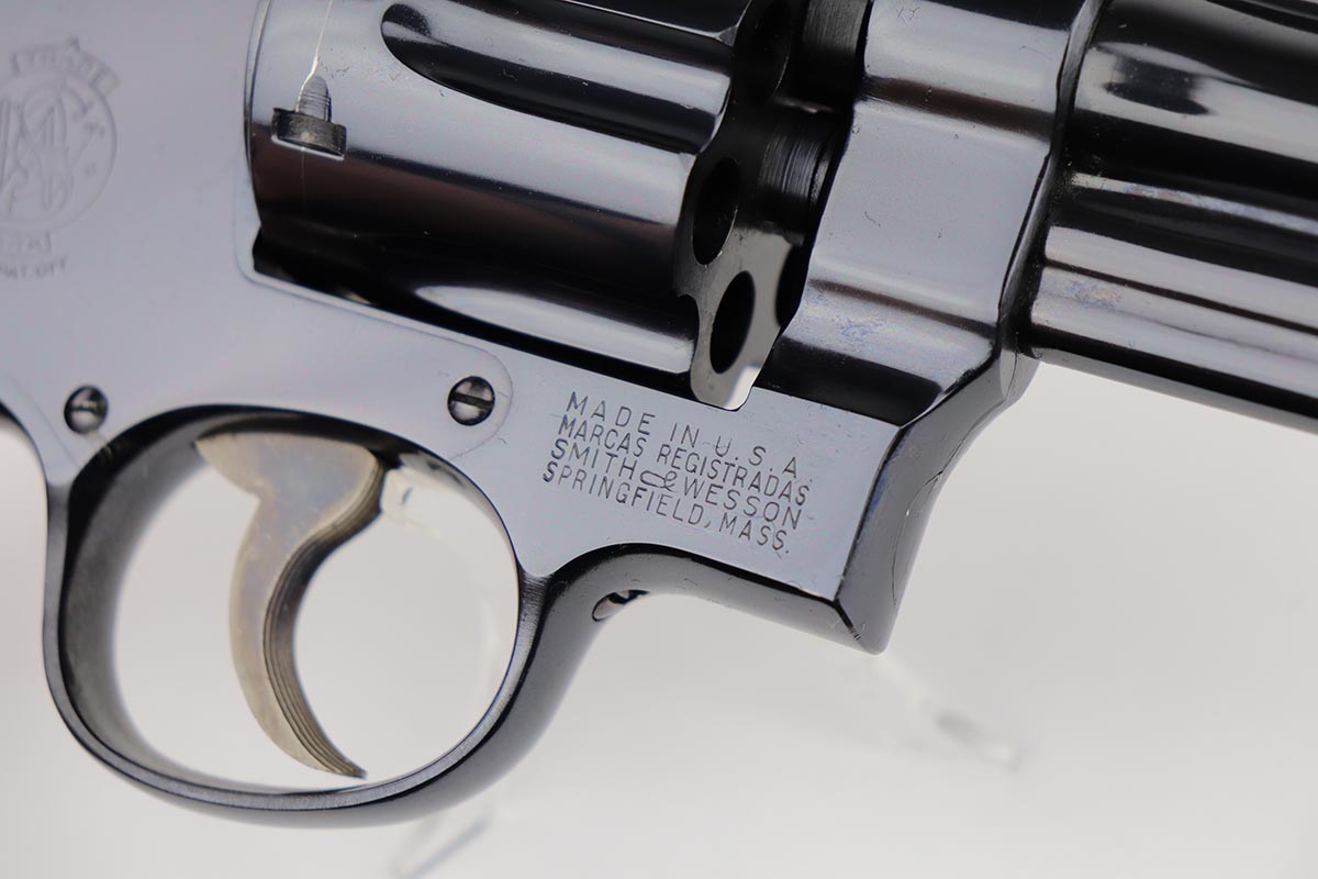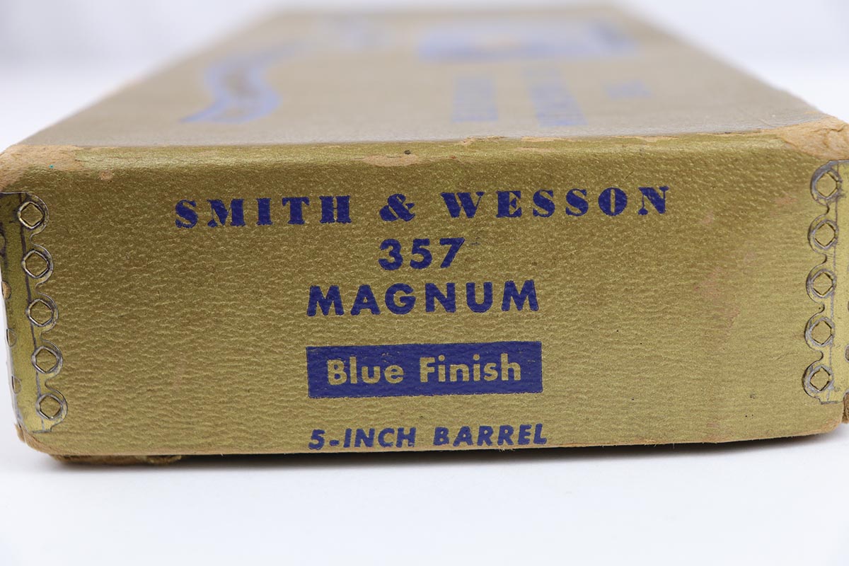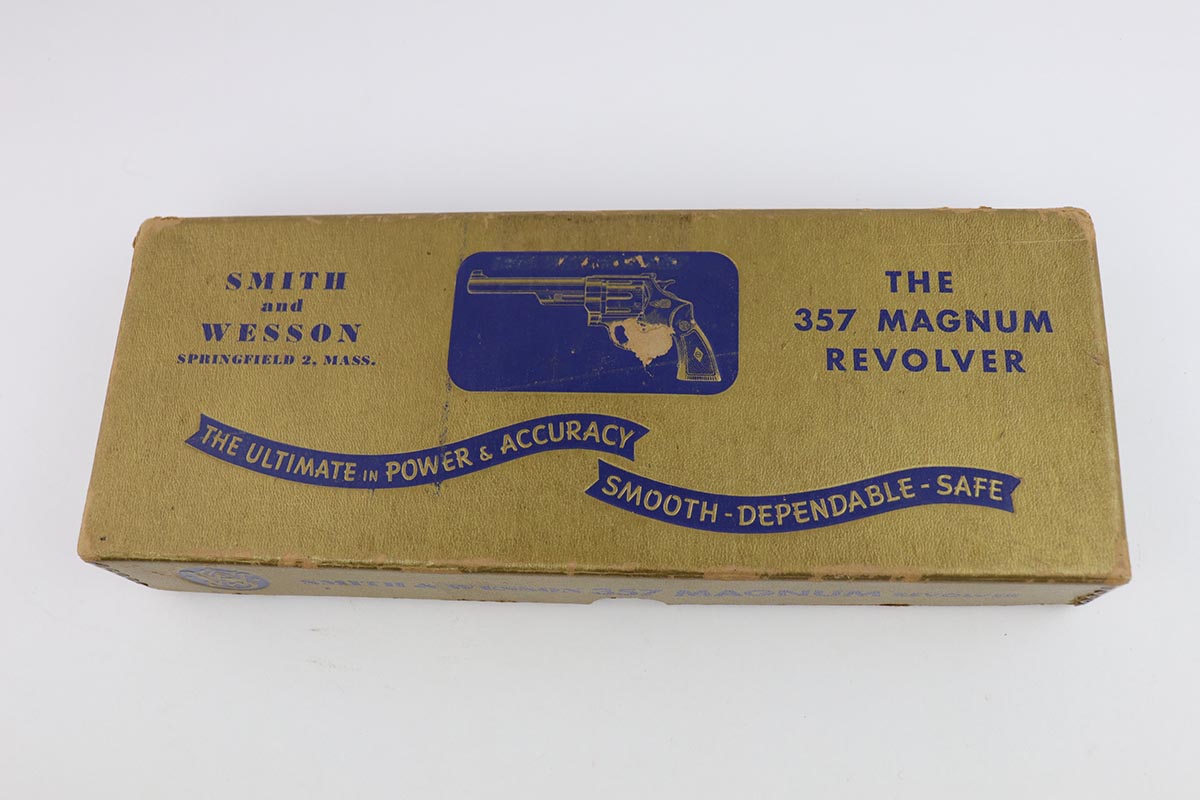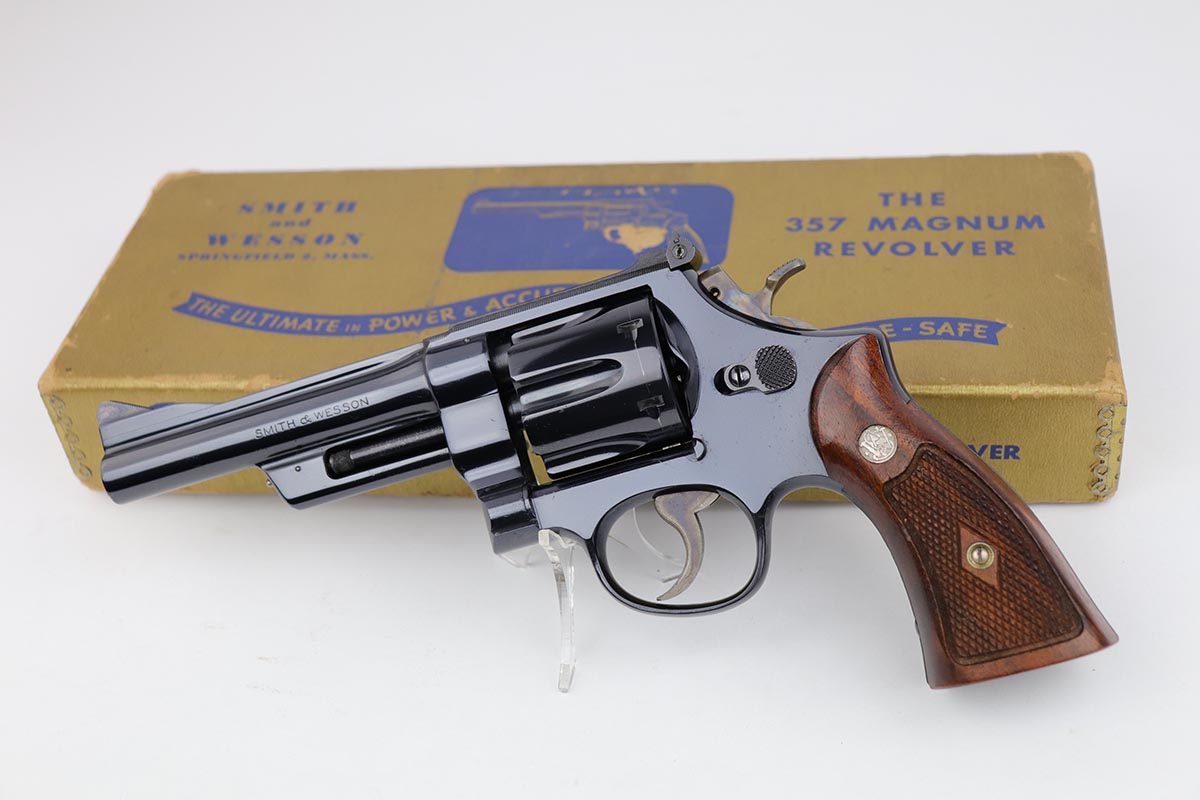 7/11/19 – This is a stunning example of an early S&W model Pre-27 revolver, chambered in .357 magnum, in its original matching box. The gun appears like new with just a very light cylinder ring present with no other wear evident. This is an early gun, made probably around 1951. It is all matching, including the barrel, cylinder, frame and grips. The gun has the rarely seen barrel length of 5 inches, and is the most difficult Pre-27 barrel length for a collector to acquire. Mint bore and grips. Beautiful, lustrous blue throughout. Original box is in equally nice condition and is numbered to the gun. Impossible to upgrade!