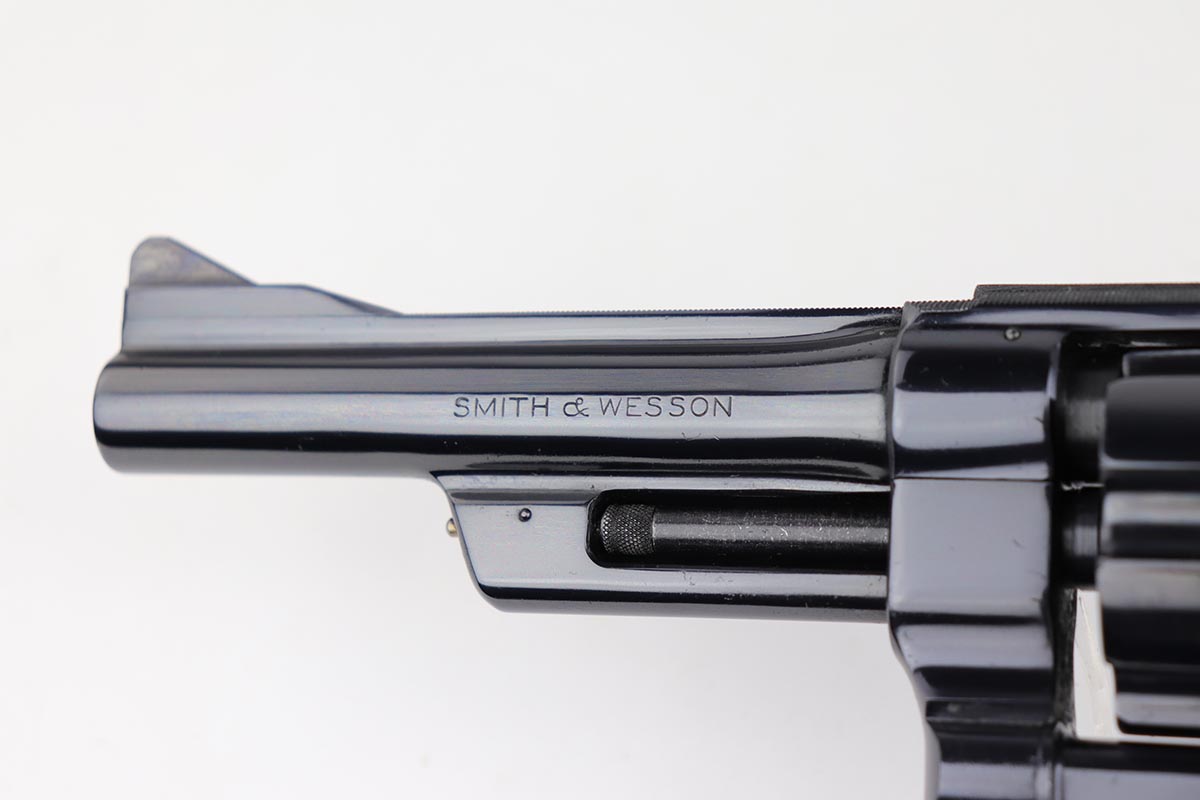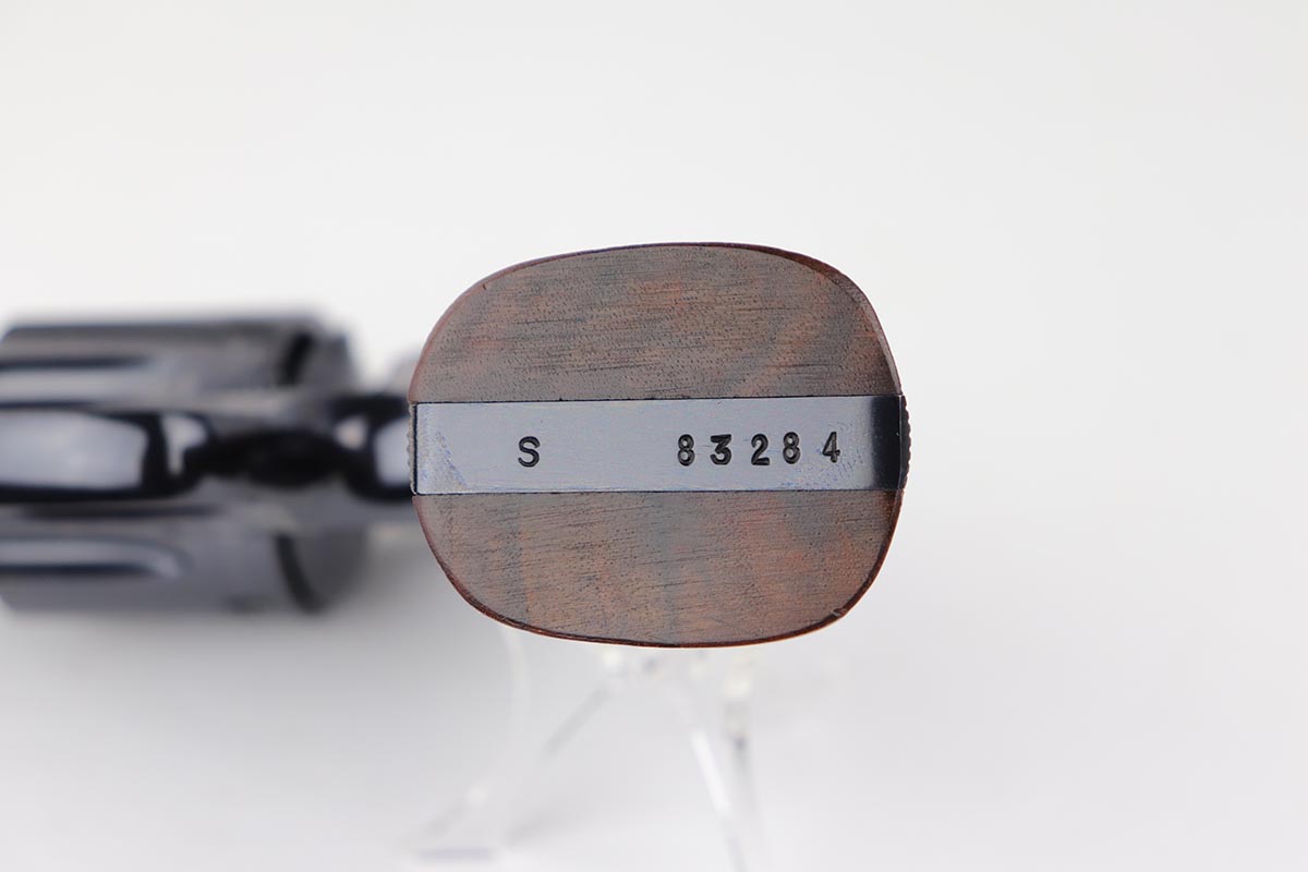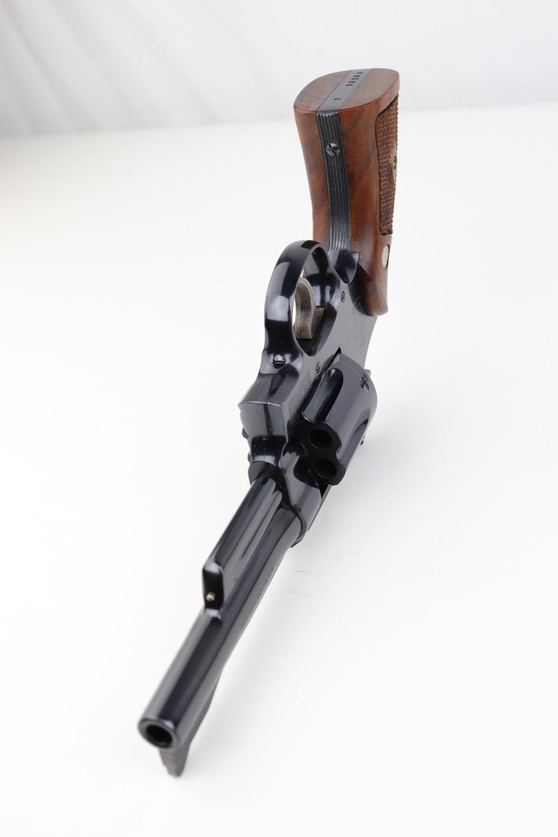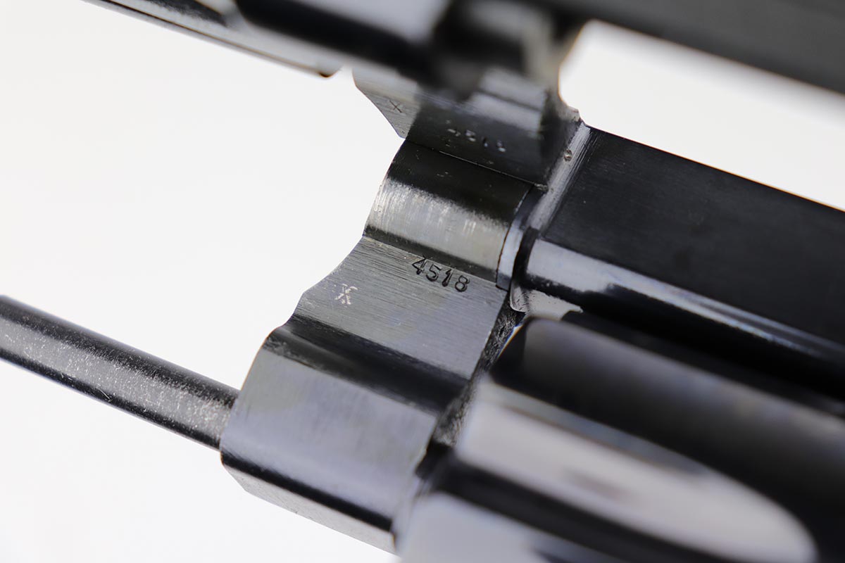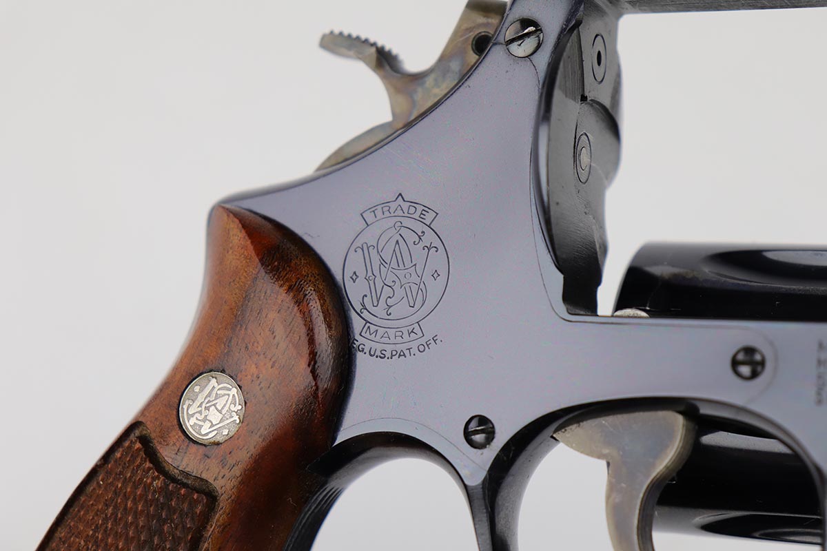 7/11/19 – This is a stunning example of an early S&W model Pre-27 revolver, chambered in .357 magnum, in its original matching box. The gun appears like new with just a very light cylinder ring present with no other wear evident. This is an early gun, made probably around 1951. It is all matching, including the barrel, cylinder, frame and grips. The gun has the rarely seen barrel length of 5 inches, and is the most difficult Pre-27 barrel length for a collector to acquire. Mint bore and grips. Beautiful, lustrous blue throughout. Original box is in equally nice condition and is numbered to the gun. Impossible to upgrade!
