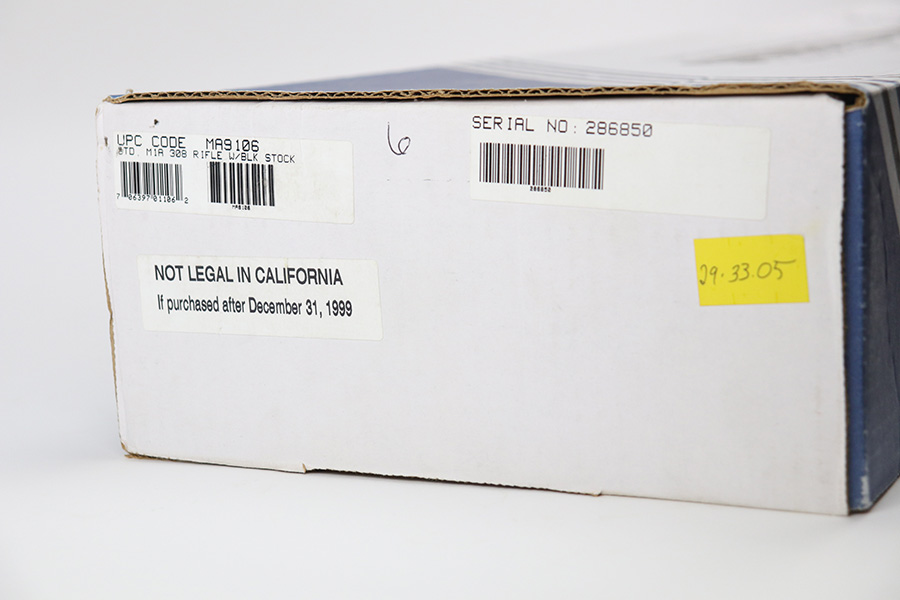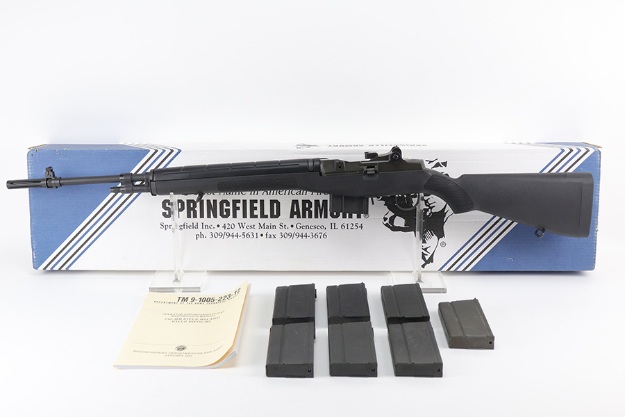10/22/21 – This is a mint Springfield Armory M1A in its original, matching box. This is a 2010s manufacture that our consignor bought new, and says he shot a single 20rd mag and put it back in the box. It’s in mint condition as the photos will show, with the synthetic black stock. It comes with 7 spare 20rd magazines (various makers), the original factory manual, and also the original factory inspection card which is serialized to the gun. FFL required.
