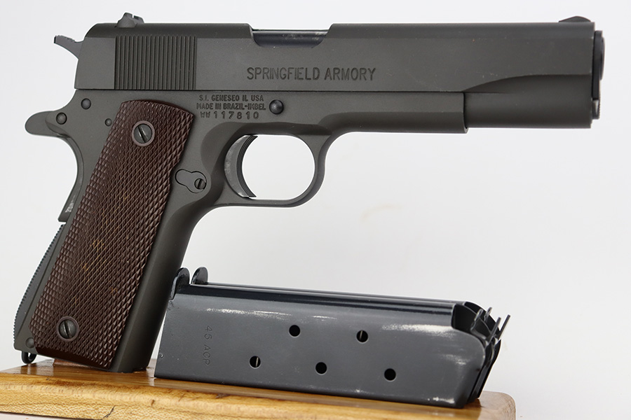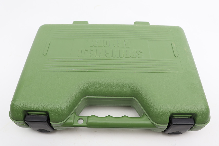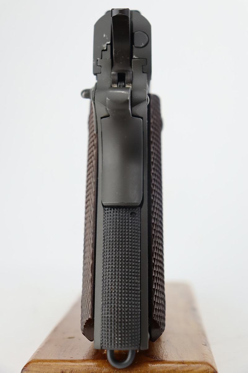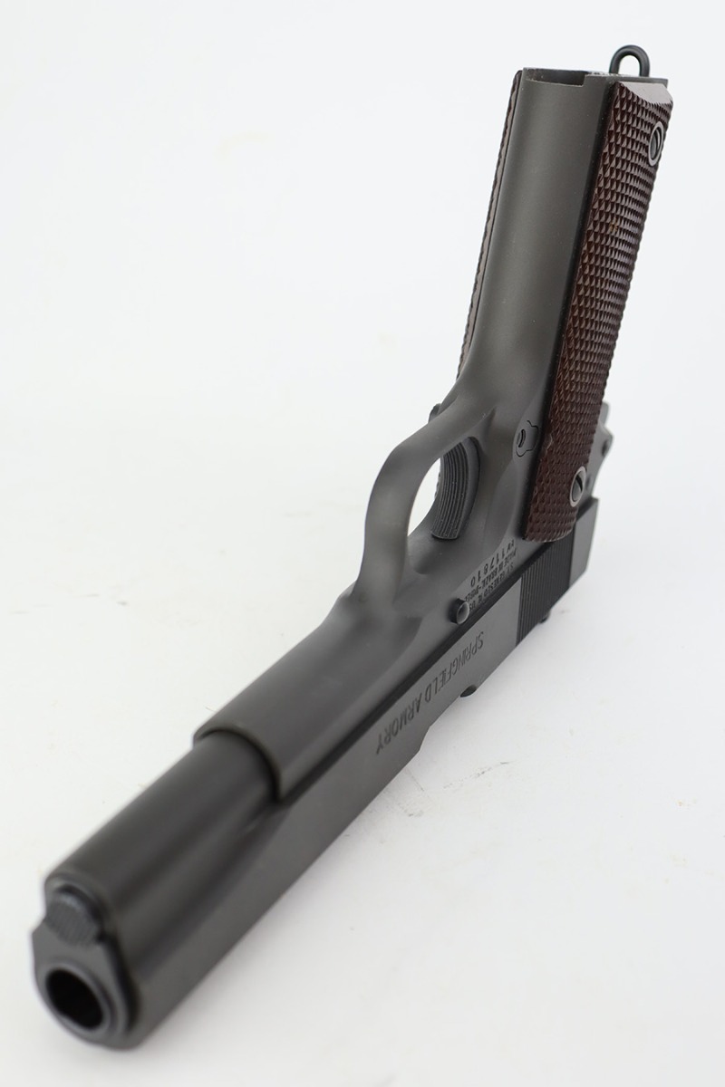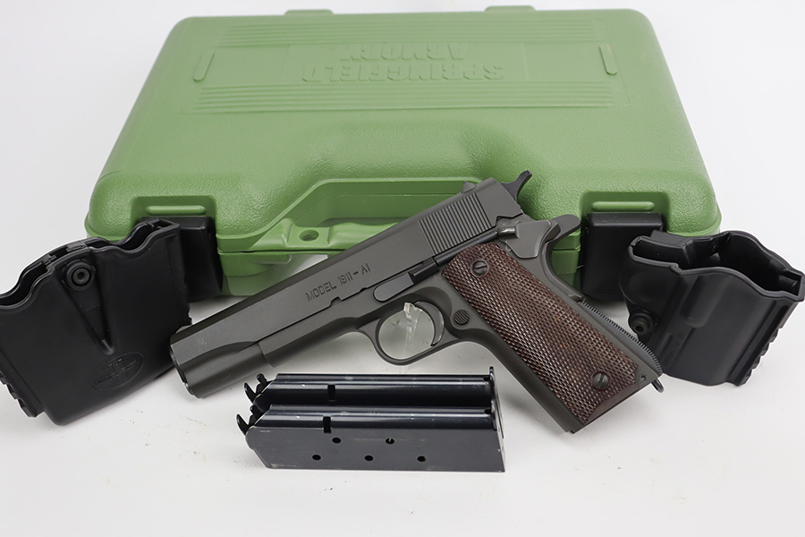 7/2/24 – This is a like-new example of a Springfield 1911-A1, a modern remake of the WW2 original. It comes with its original hard case (not numbered), a black composite holster, two magazines, a cleaning rod, a few small tools, and an owners manual. The gun has a parkerized finish, and there is virtually no sign of wear or use to speak of. Fitted with WW2-style reddish plastic grips. Mint bore.