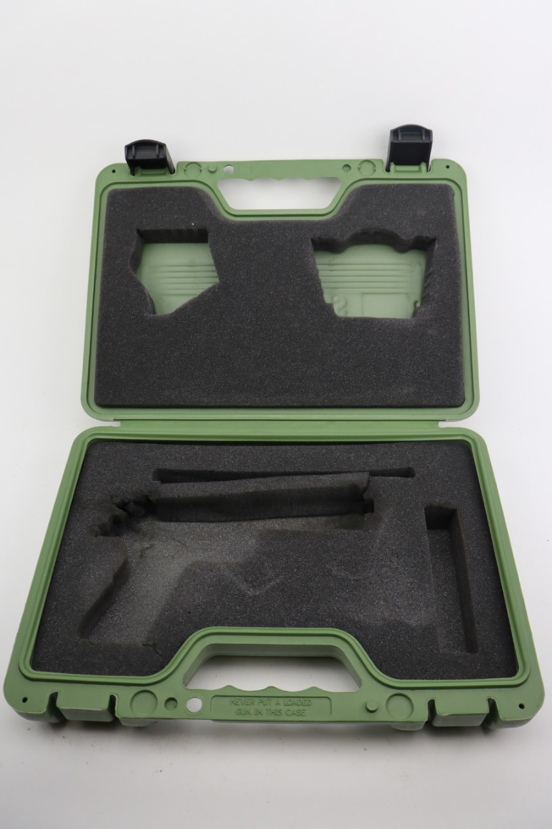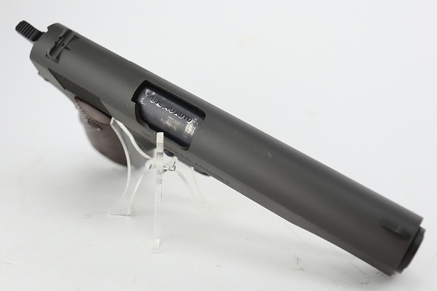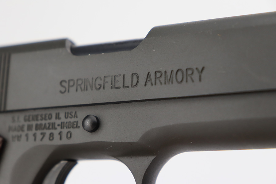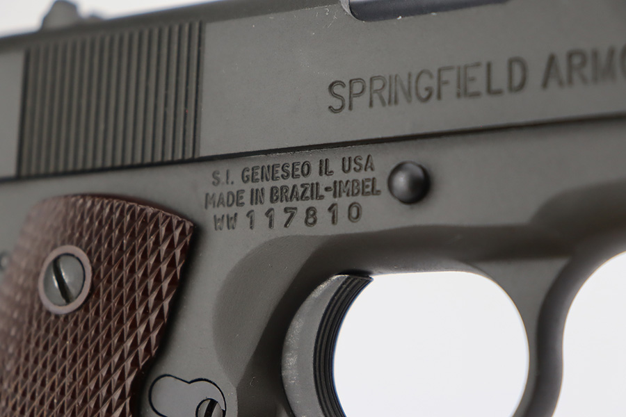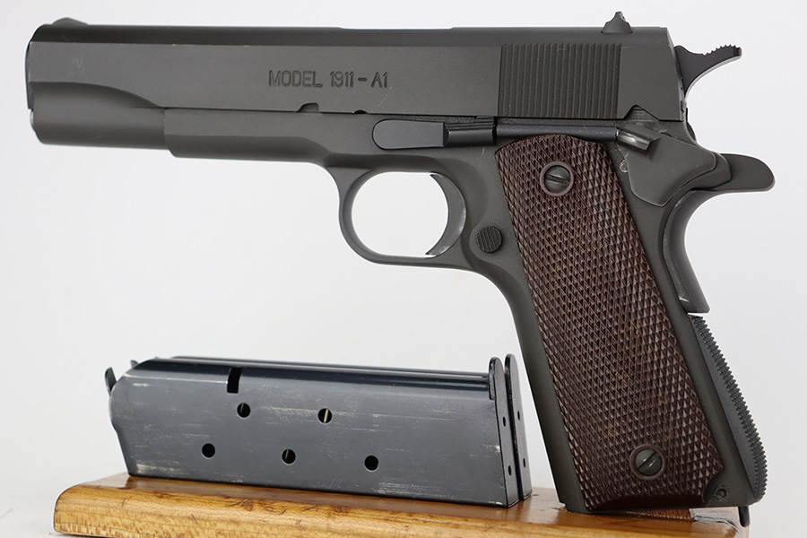 7/2/24 – This is a like-new example of a Springfield 1911-A1, a modern remake of the WW2 original. It comes with its original hard case (not numbered), a black composite holster, two magazines, a cleaning rod, a few small tools, and an owners manual. The gun has a parkerized finish, and there is virtually no sign of wear or use to speak of. Fitted with WW2-style reddish plastic grips. Mint bore.