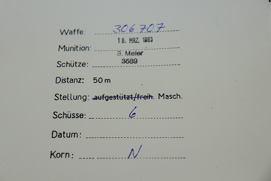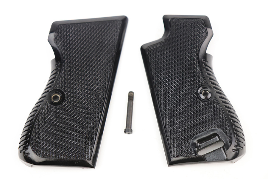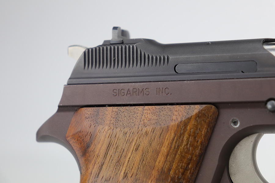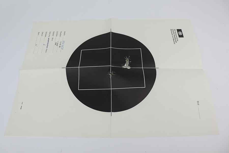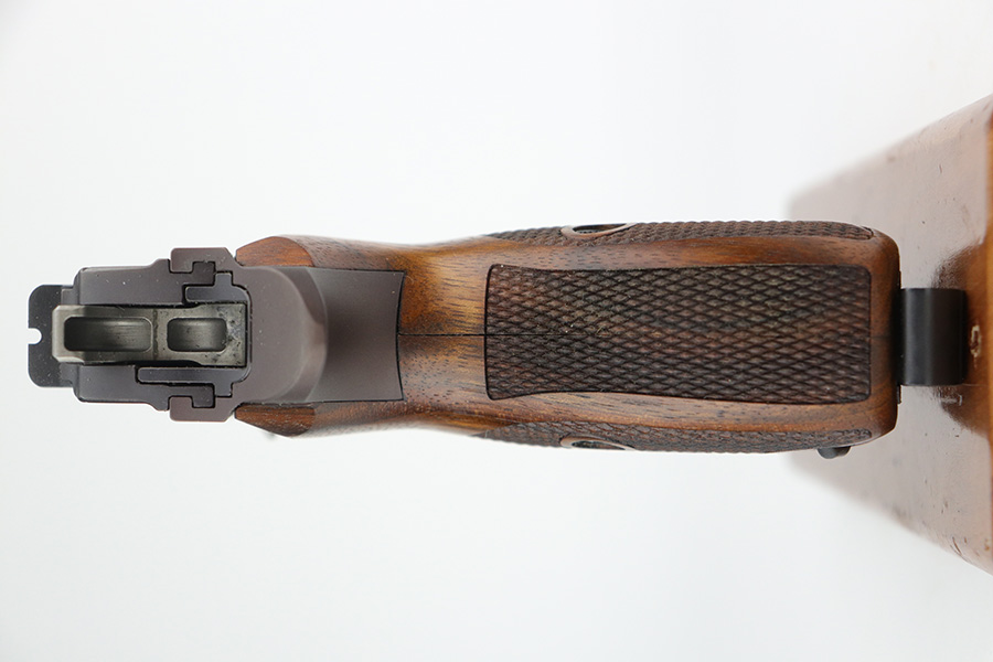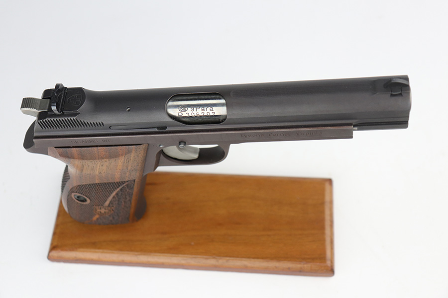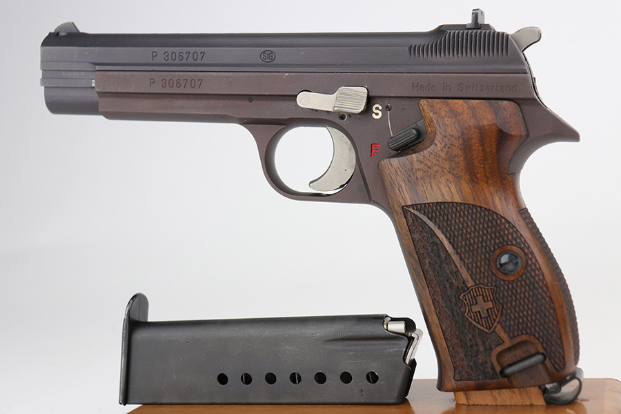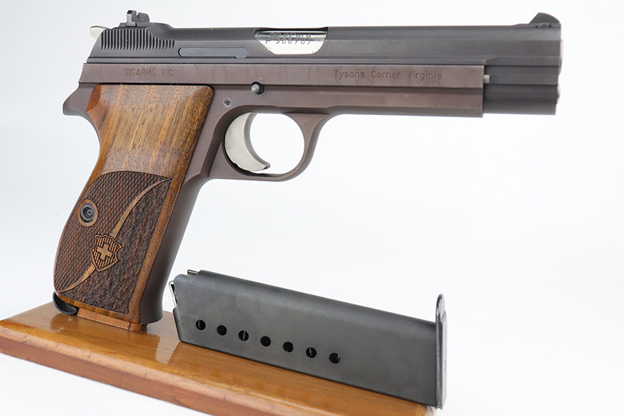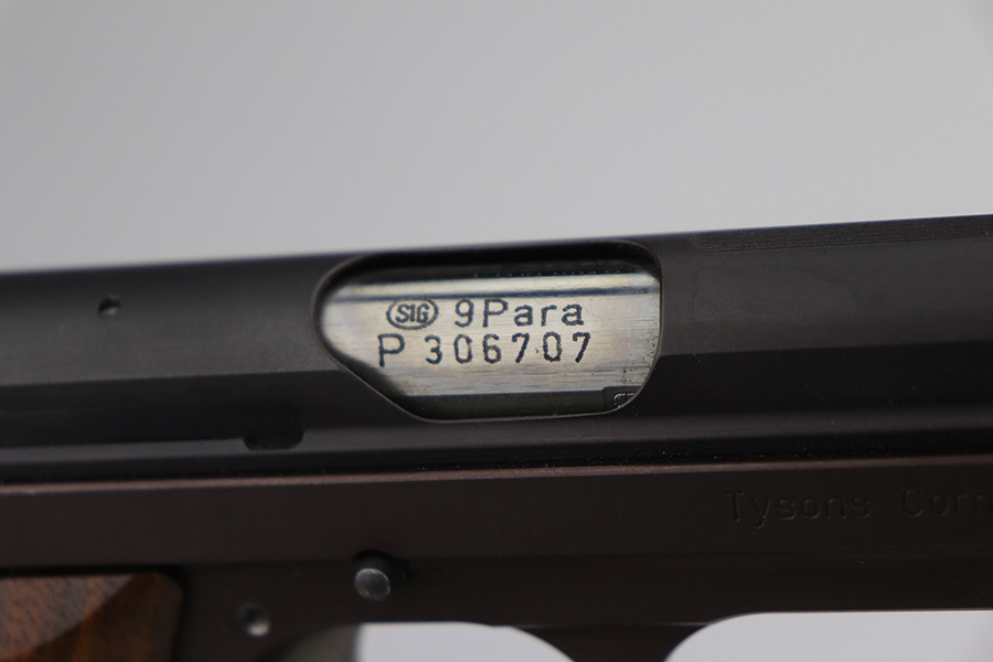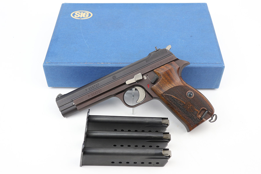 9/17/21 – This is a mint SIG P210-2 in its original box, with two spare magazines, after-market spare wood grips set, original paperwork, and matching test target. This is the P210-2 variation, made in 1985/86. It’s in stone mint condition, looks like it hasn’t been handled or fired at all. The P210-2 is the 9mm civilian version with fixed sights, bead blasted finish and plastic grips. This is probably the finest such example we’ve encountered. FFL required.
