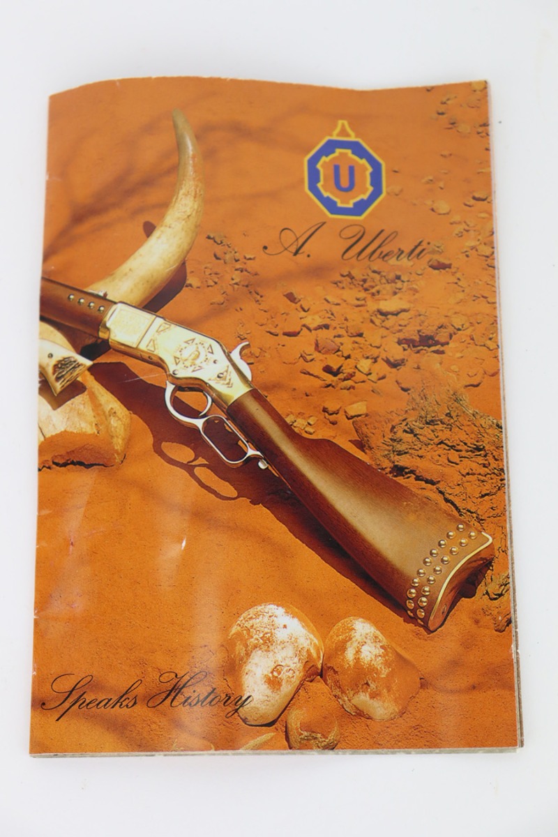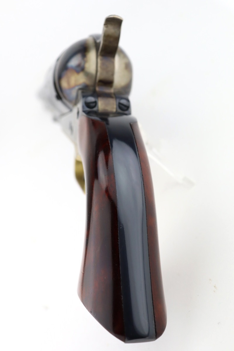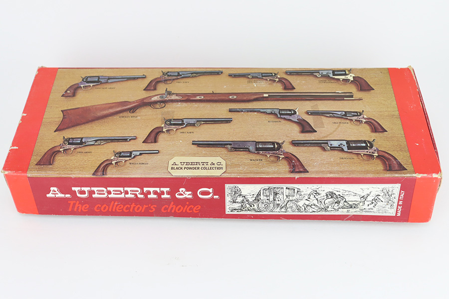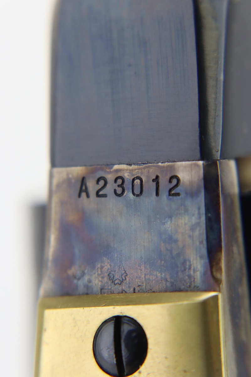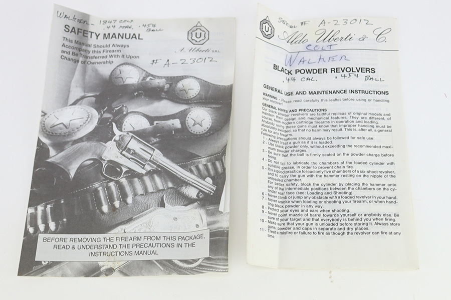 1/16/24 – This is a like-new Uberti 1847 Walker Black Powder Revolver, chambered in .44 Caliber. It comes with a period-correct but mismatched box, owners manual, and sales papers. The gun is mint with no signs of wear. Beautiful case-hardening on the ejector and on the frame. Fitted with excellent Walnut grips. Bore is mint.