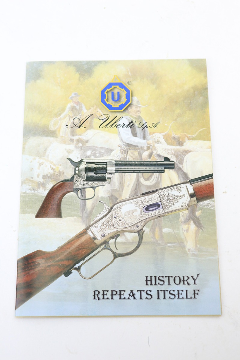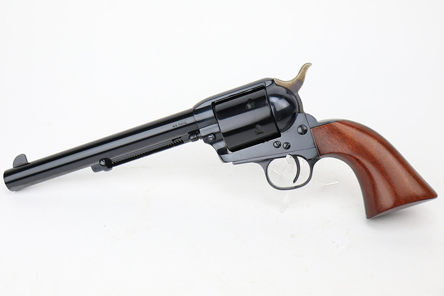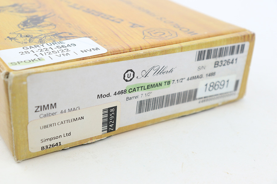 1/4/24 – This is a like-new Uberti Model 1873 Single Action Cattleman revolver, chambered in .44 Magnum with a 7.5″ barrel. Comes with its original matching-numbered box and owners manual. The gun shows no sings of wear or use – likely unfired. There isn’t even a roll mark on the cylinder. Excellent wood grips. Factory-new bore.