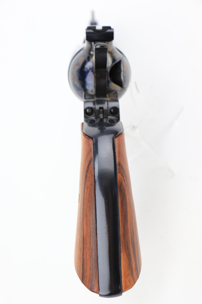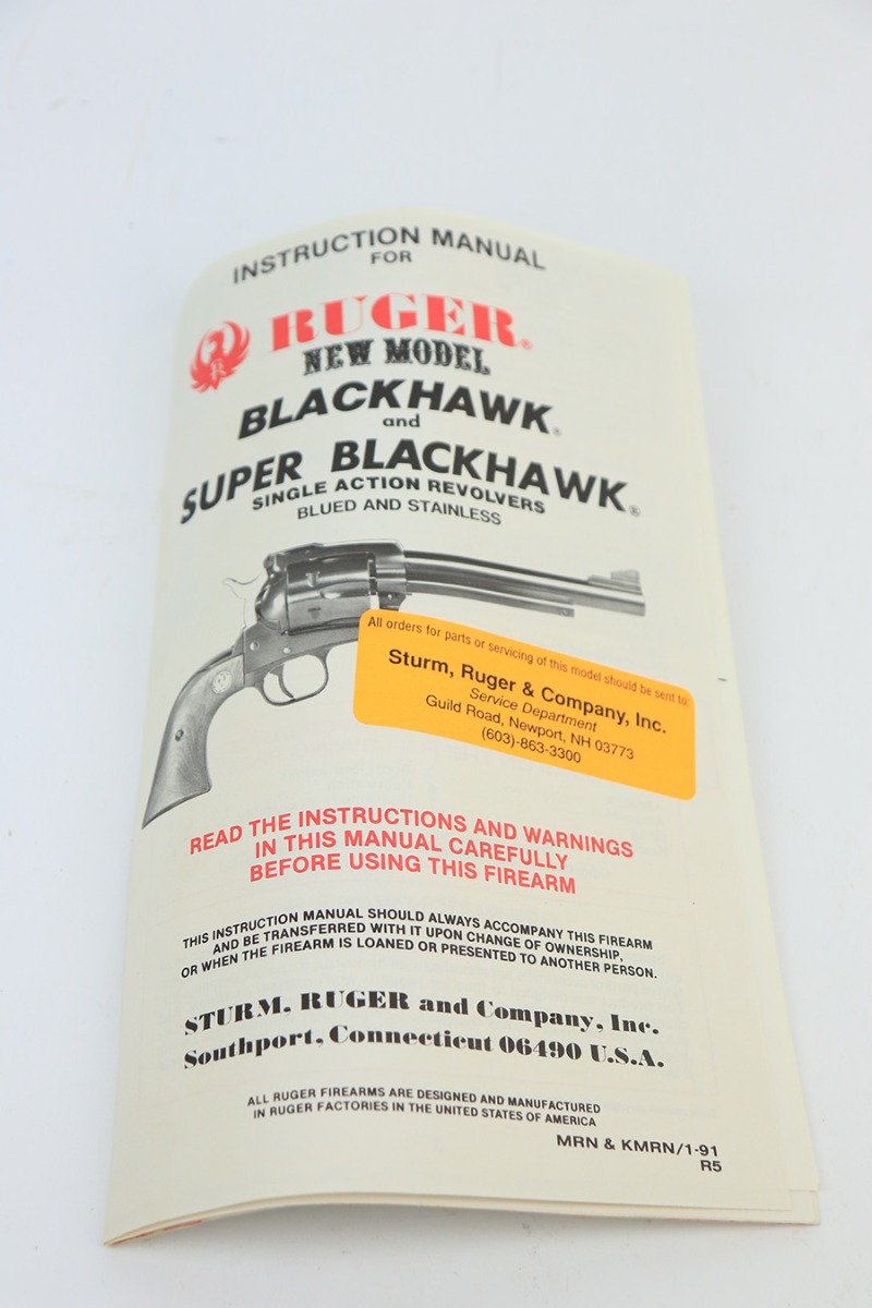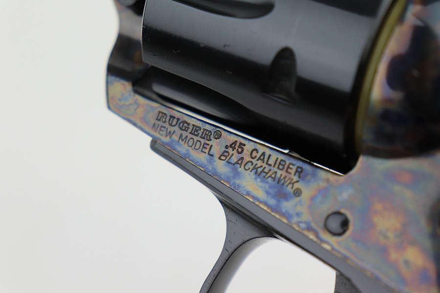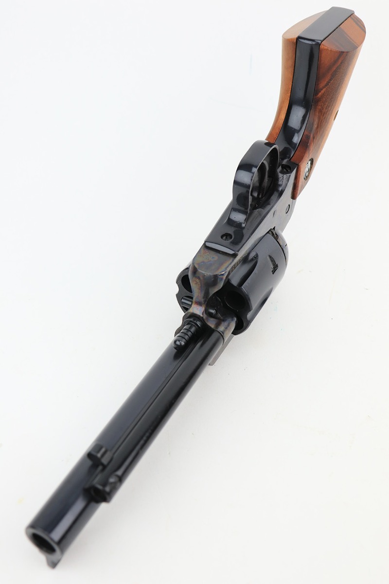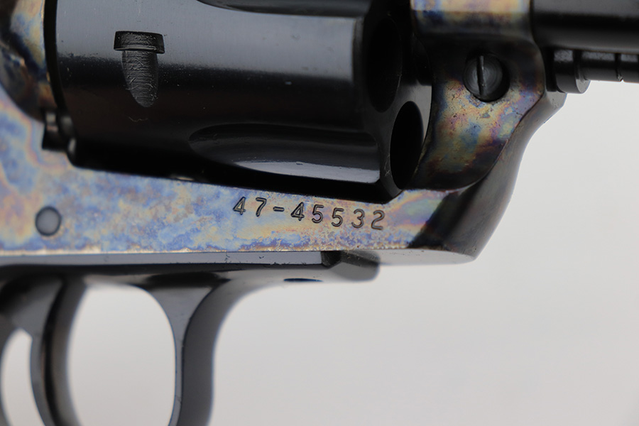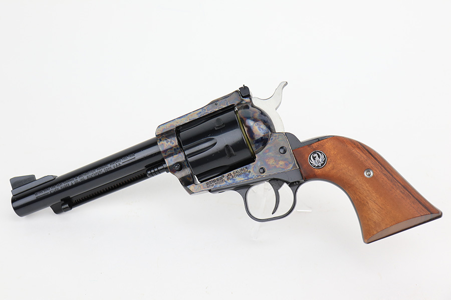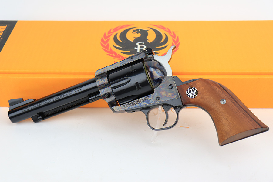 4/13/23 – This is a like-new example of an ultra rare factory prototype Ruger Blackhawk revolver. This one is the only known example of a Blackhawk that is chambered in .45 Colt and has the beautiful case colors on the receiver. This comes from the Tom Rodensheim collection, a Ruger employee who was given the opportunity to purchase factory prototypes. The gun comes with its original outer and inner shipping boxes, packing materials, and owners manual. The outer box is numbered and matching. The gun is in mint condition. There are essentially no signs of wear with just the slightest hint of a roll mark on the cylinder. Beautiful wood grips. Mint bore.