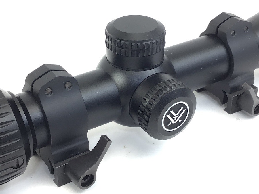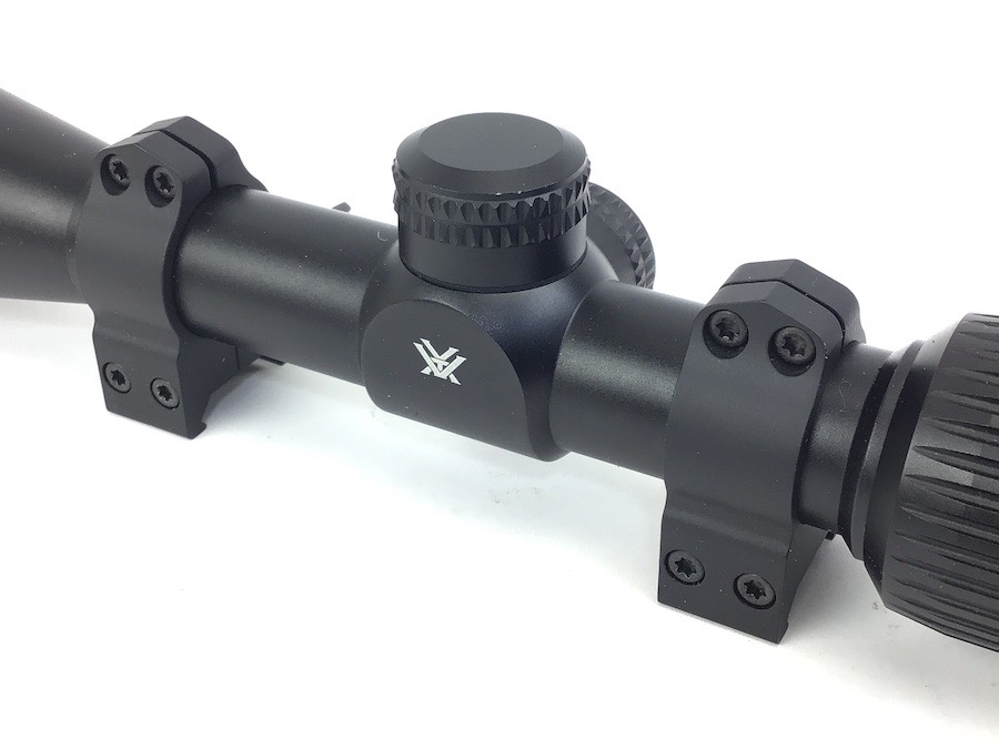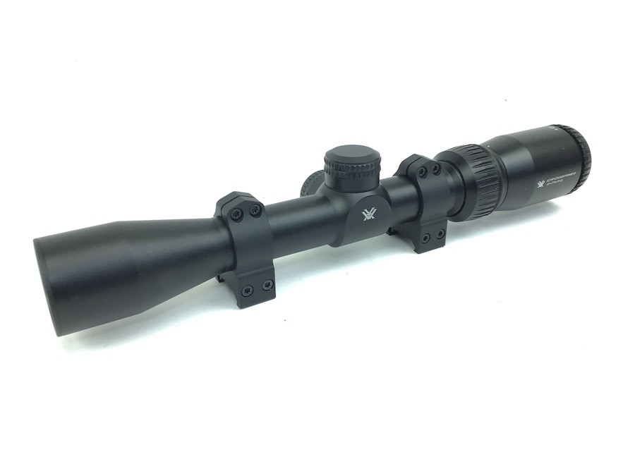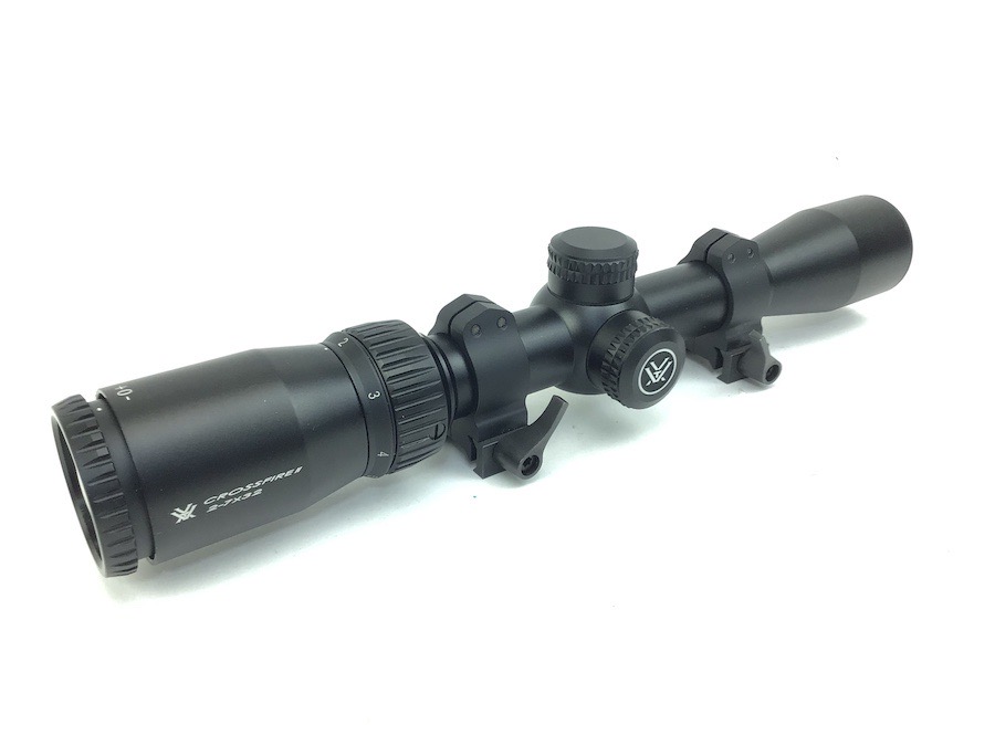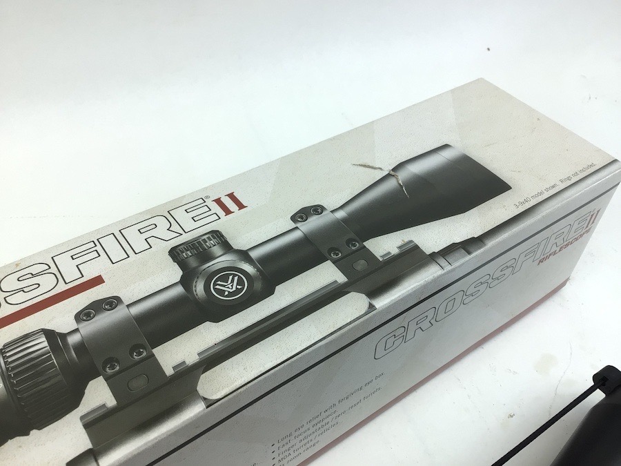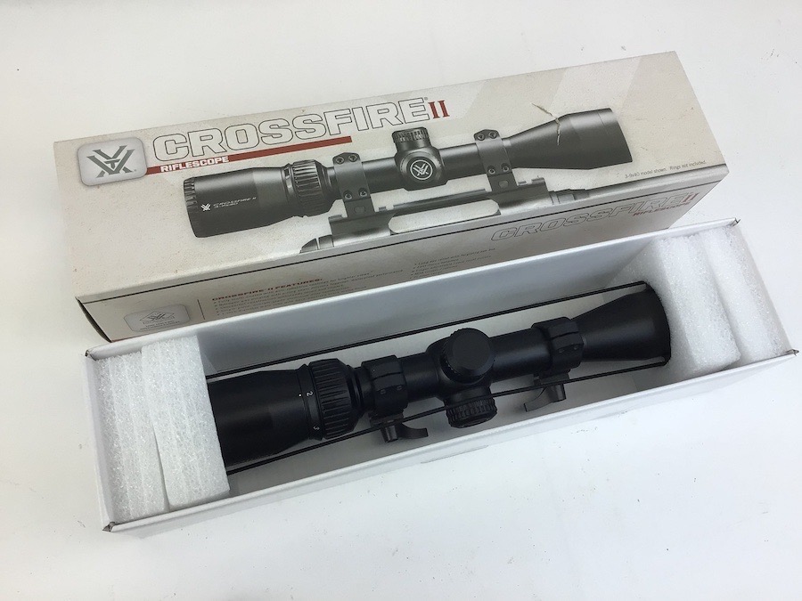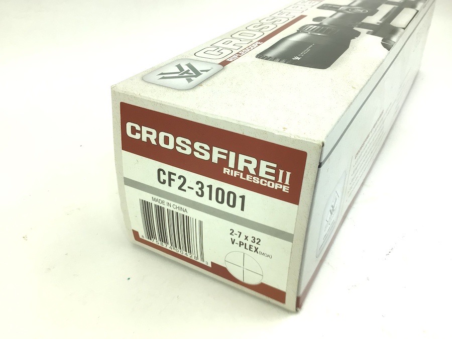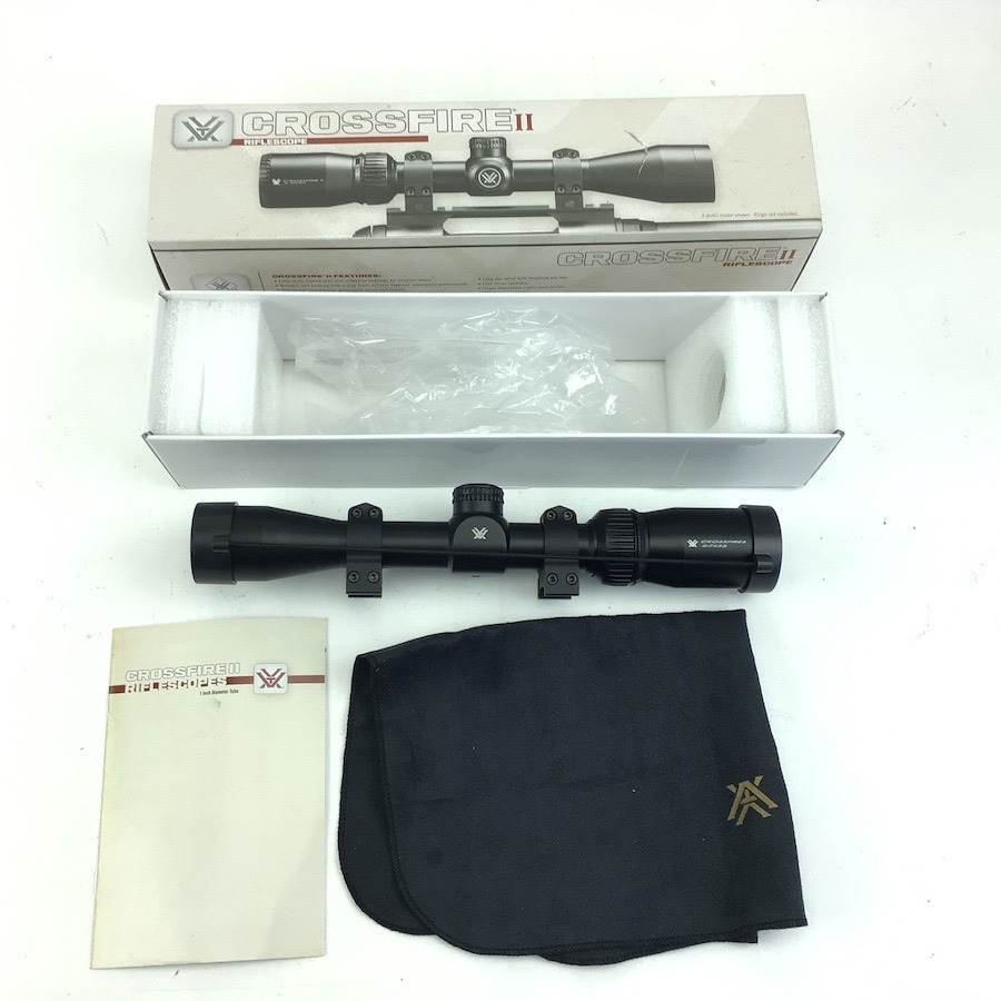 6/7/23 – Excellent, as new condition. Vortex Crossfire II 2-7×32 Riflescope with mounts. Includes box, manual, cleaning cloth and lens covers. Does not appear to have been used, but mount rings have been installed. No visible wear. Crystal clear optics. Features Adjustment Graduation in 1/4 MOA. Travel Per Rotation: 15 MOA Max Elevation Adjustment: 60 MOA Max Windage Adjustment: 60 MOA. Box has a small tear in the top.