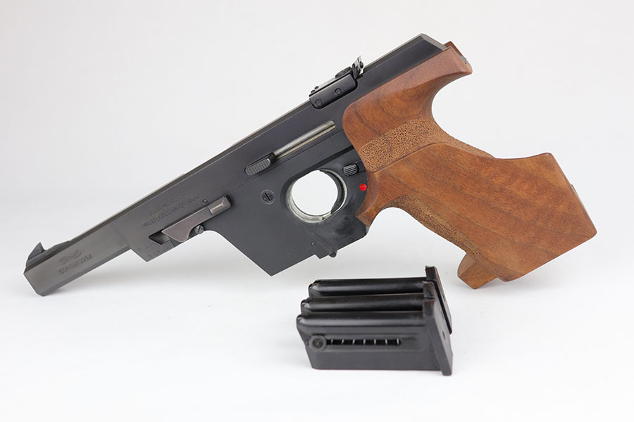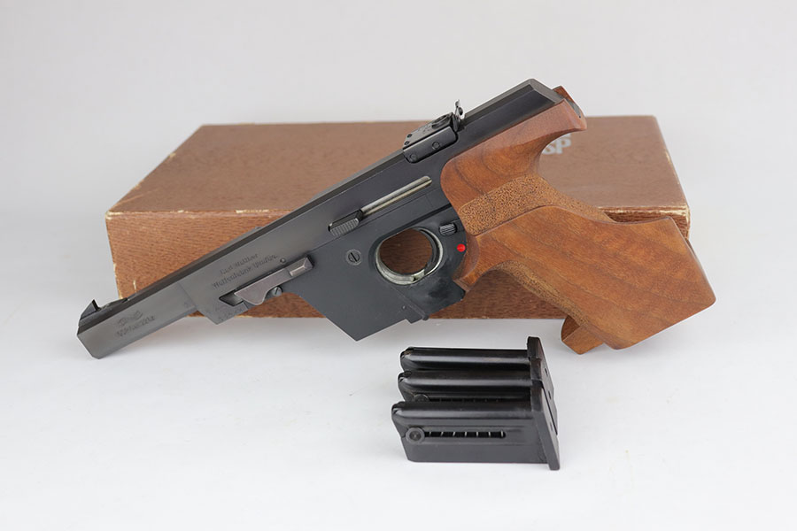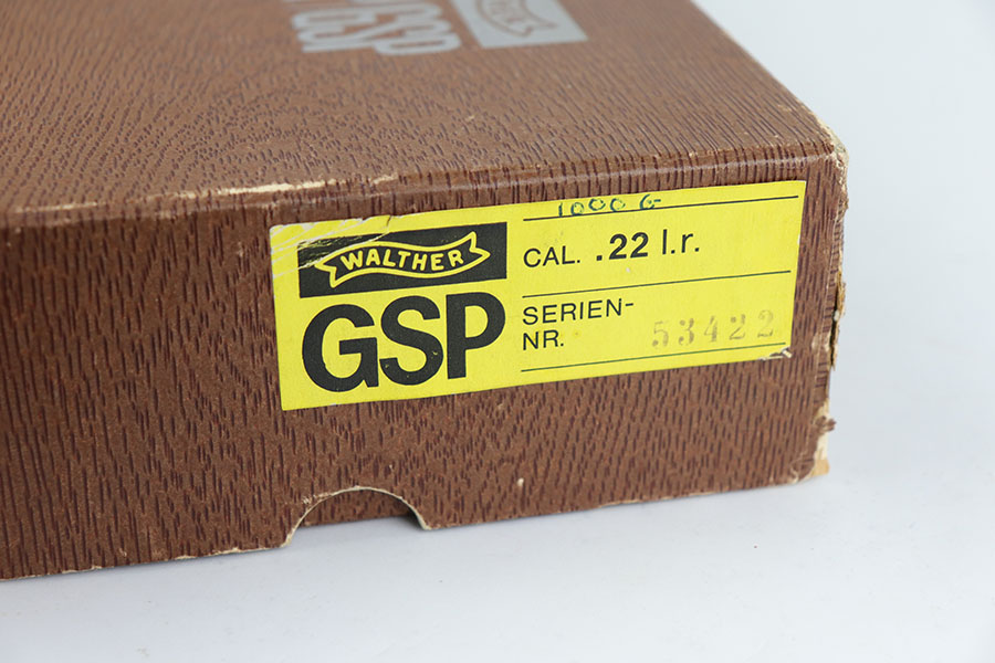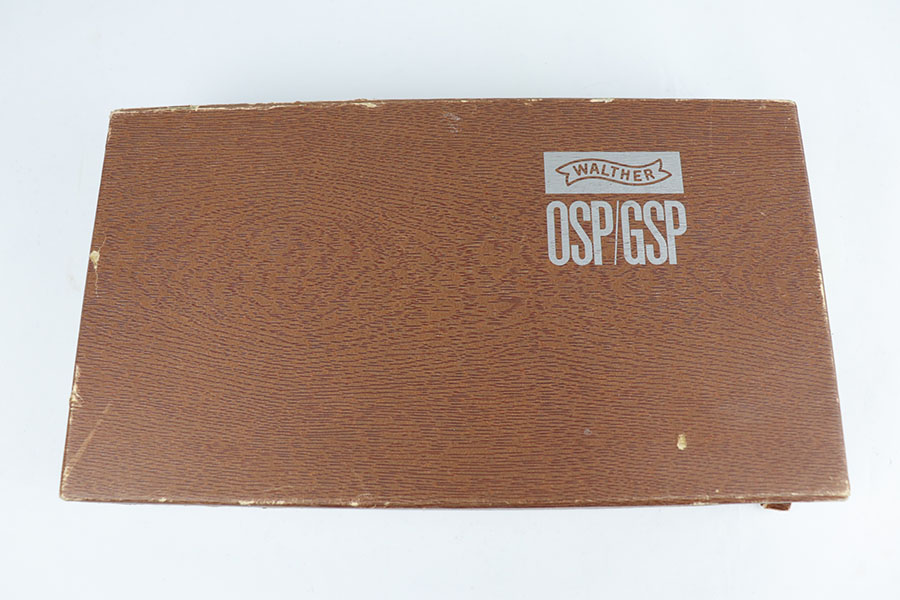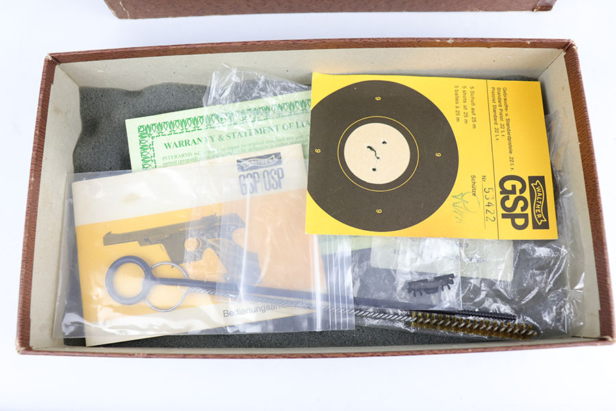 6/17/20 – Made in 1972, this is a mint Walther GSP in the original matching box, which includes the matching test target, a manual and two spare magazines. The pistol has 99+% of the original finish with just a hint of “box wear” on the high edges. Fully adjustable rear sight with competition style wood grip. Original cleaning rod and a spare rear sight are included, as well.