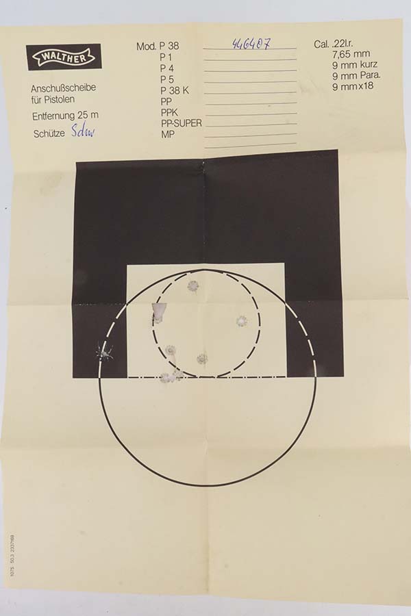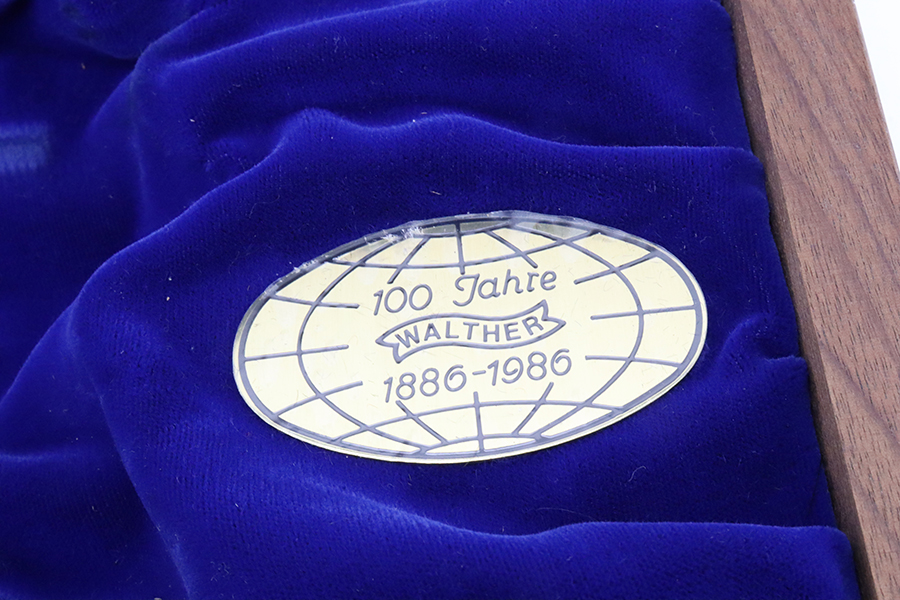 3/5/24 – This is a like-new example of a Walther P.38 manufactured in 1986. This one is a special issue gun to commemorate the 100th year of the Walther factory. It is all matching and has the proper German proofs. “Made in Germany” export proof. The gun comes with the original matching box, matching test target, owners manual, and two proper magazines. It also comes with a really nice 100 year anniversary wood presentation case. The gun is in mint, like-new condition with no signs of wear. The bore is mint. De-cocker is functional.