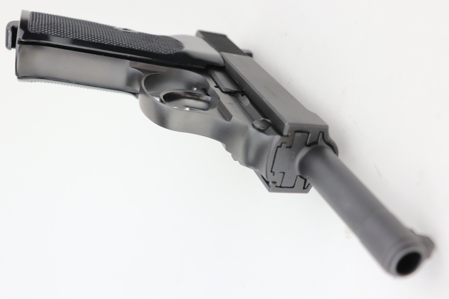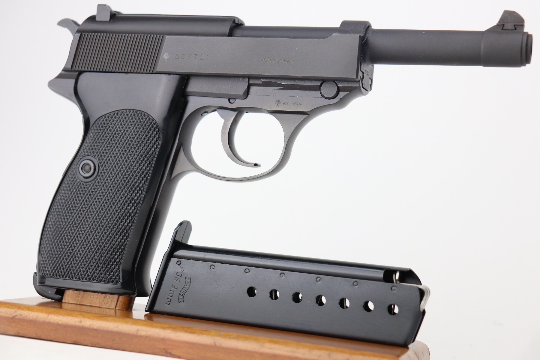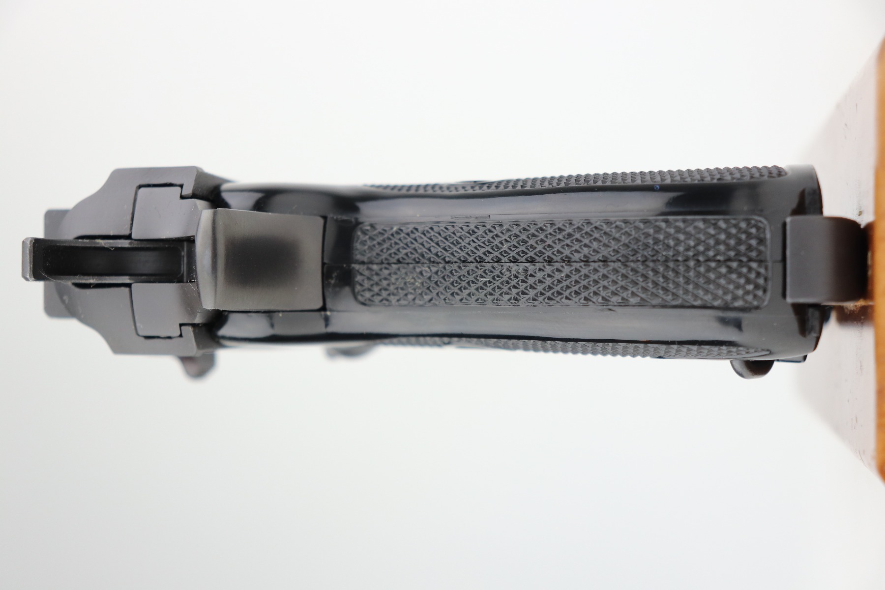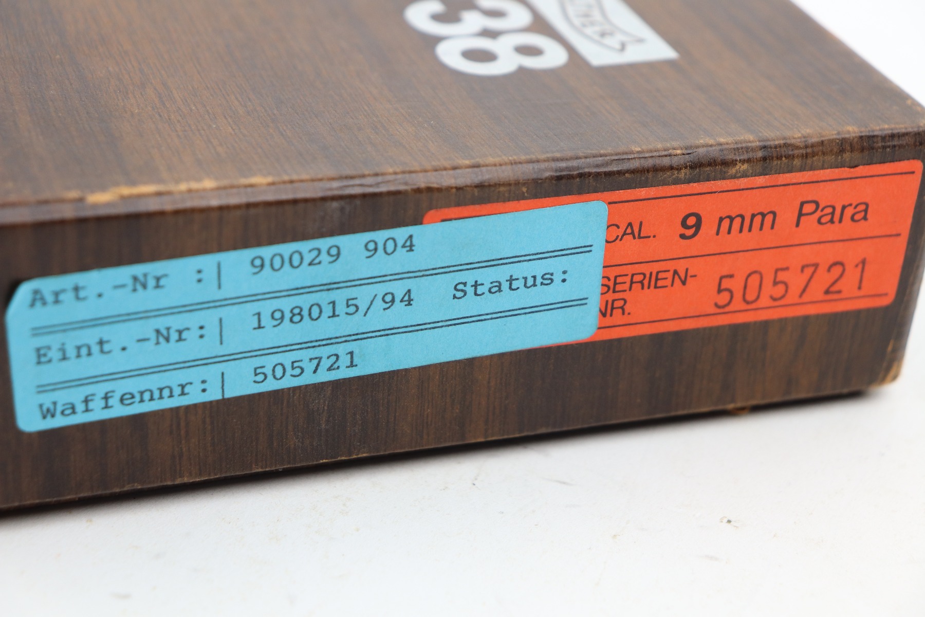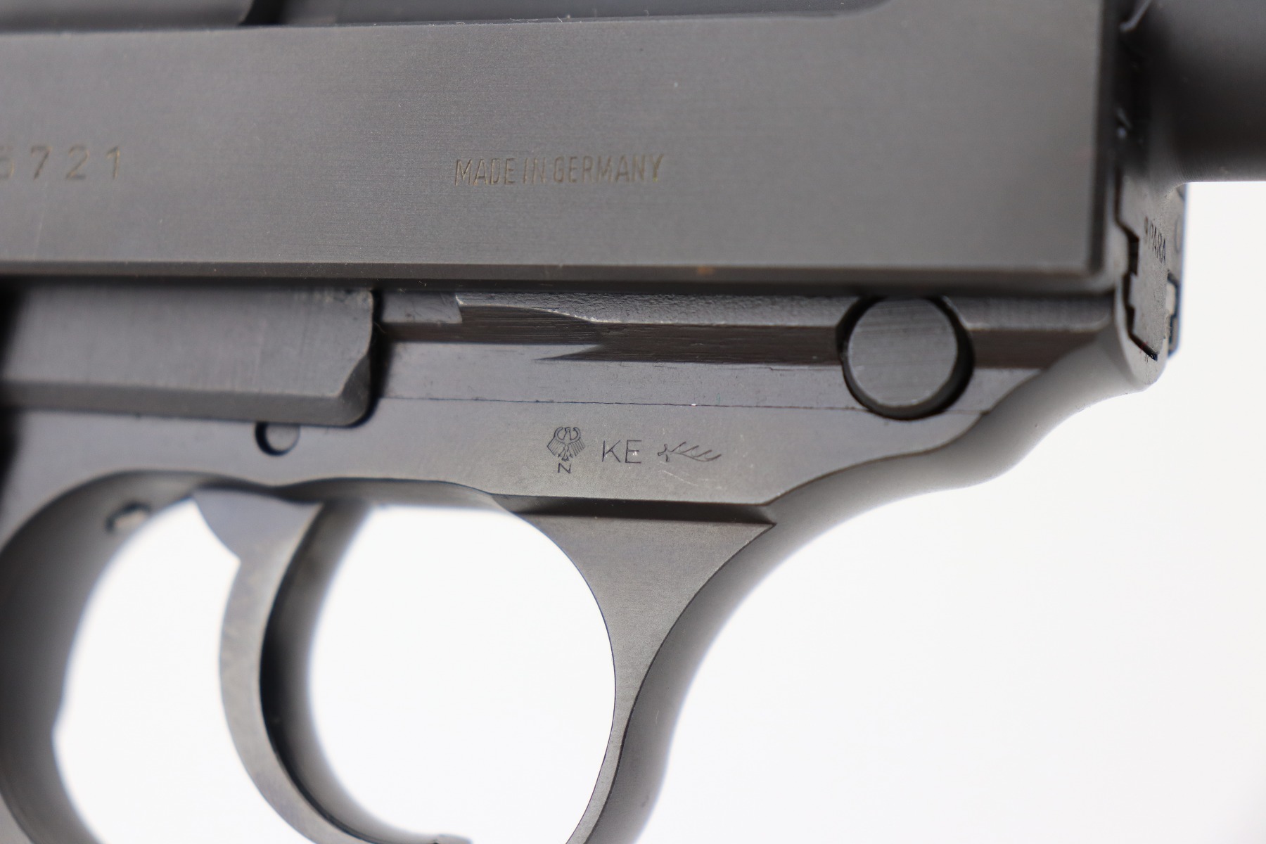 4/5/21 – This is a rare, like-new example of a Walther P.38 manufactured in 1994. What makes it rare is the steel frame, as only ~1,540 post-war steel frame P.38s were produced, and it’s one of the last such examples ever made. The gun is all matching and has the proper German proofs. “Made in Germany” export mark. No import proofs. It comes with the original matching box, matching test target, cleaning rod, and two proper magazines. The gun is in mint, like-new condition with no signs of wear. The bore is mint. De-cocker is functional.