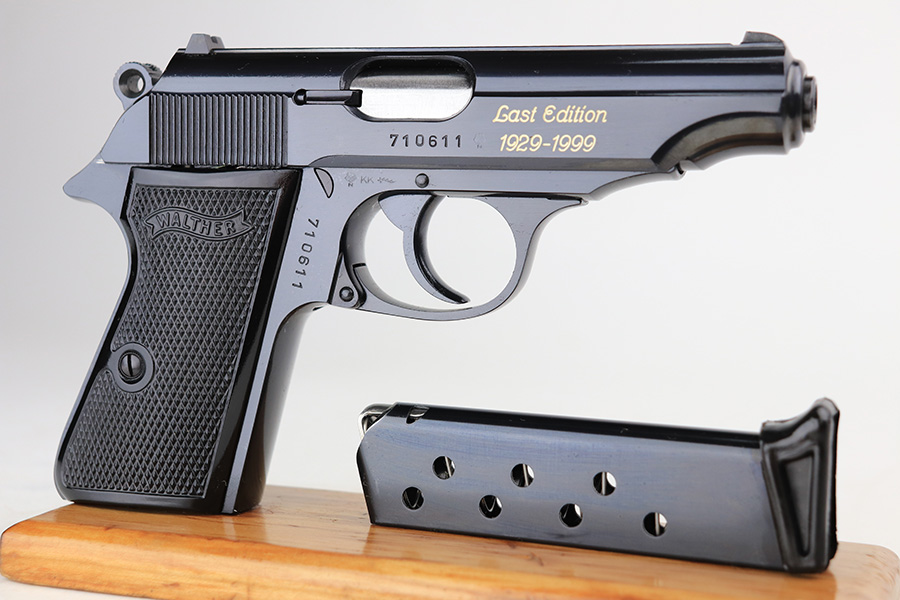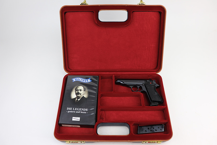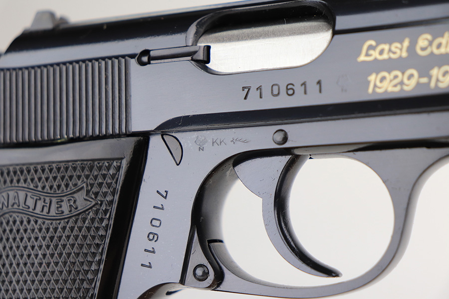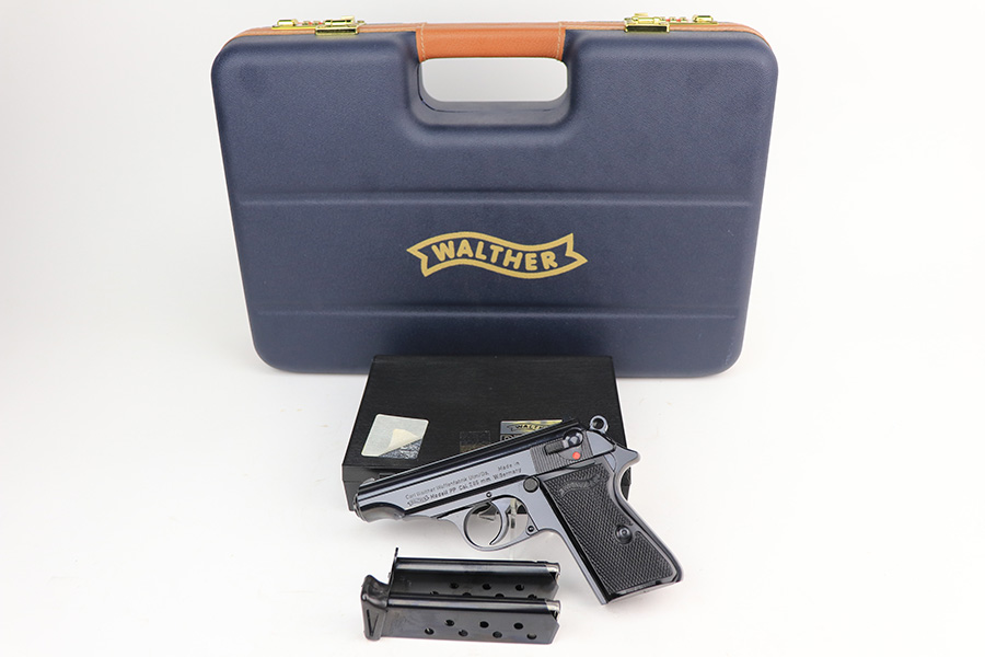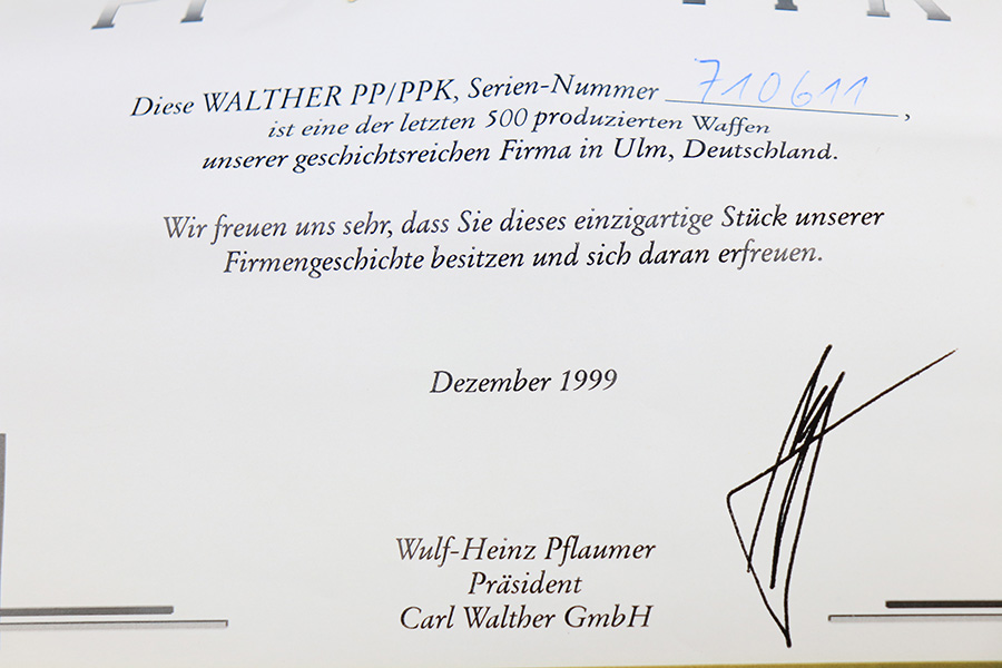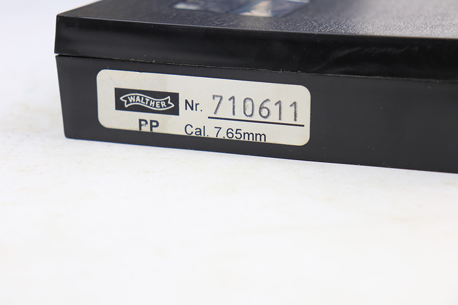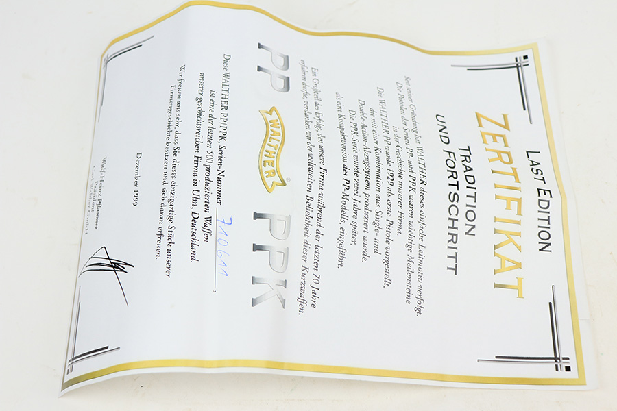 1/12/22 – Produced in 1999, as part of the final German production run in Ulm of the PP/PPK Walther pistols. This pistol has the beautiful Walther high polish blue finish and the legend “Last Edition/1929-1999” roll marked on the right side of the slide that has been highlighted with white fill. It has standard commercial markings with the post-war “eagle/ N” proofs. Ring hammer, smooth trigger and checkered black plastic grips with the walther logo on each side. In a blue faux-leather case with papers, authenticity certificate, cable lock, extra magazine and historical video of Carl Walther and the Walther factory. It’s in mint, unfired condition. Comes with the original test target and hard plastic case, as well.