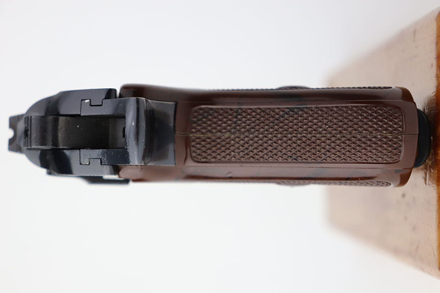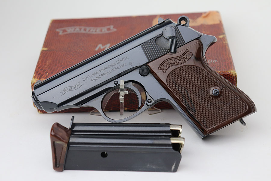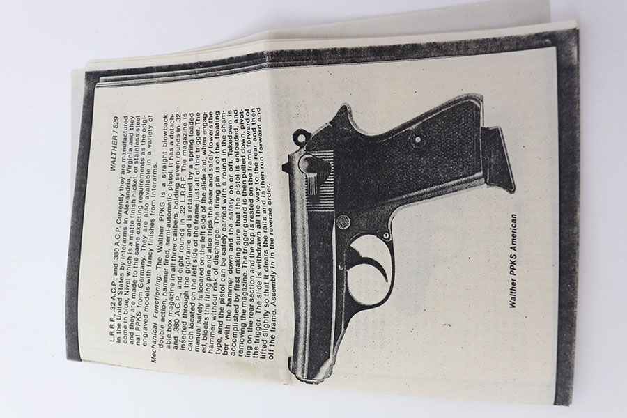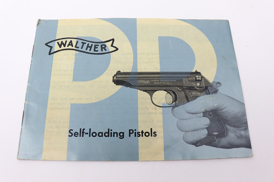 4/23/21 – This is a mint Walther PPK in the original, matching box with spare magazine, manual and cleaning rod. The pistol is in mint condition with a mint bore. It was made in 1965 in West Germany and has no import marks. Beautiful grip with matching colored finger extension magazine. Spare flat bottom mag. C&R eligible.
