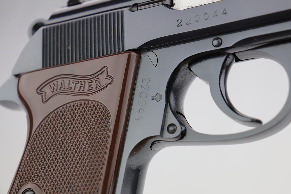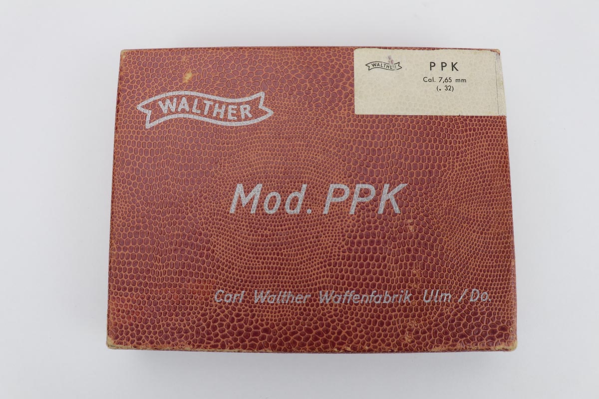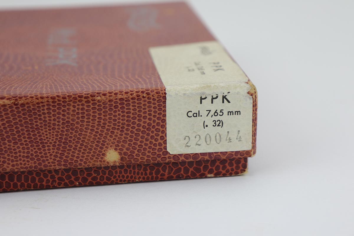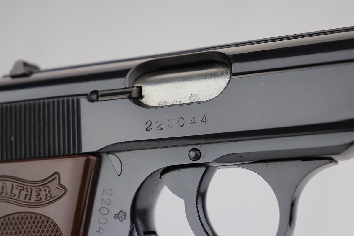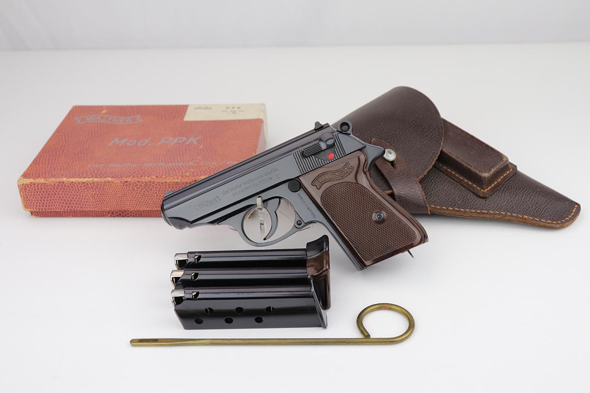 8/14/19 – This is a mint condition Walther PPK with the original matching box, matching test target, manual, cleaning rod, holster and three total magazines. The pistol was made in 1967 and is chambered for the less common 7.65mm. It is a West German production and is not import marked. The gun shows no finish loss and hardly any sign of use and cannot be upgraded. The box and test target have the matching serial of the pistol on them. The grouping includes two magazines with finger extensions, one brown and one black. It also has a third magazine with flat-bottom. The holster is also a postwar production. It’s unmarked but in near-new condition.