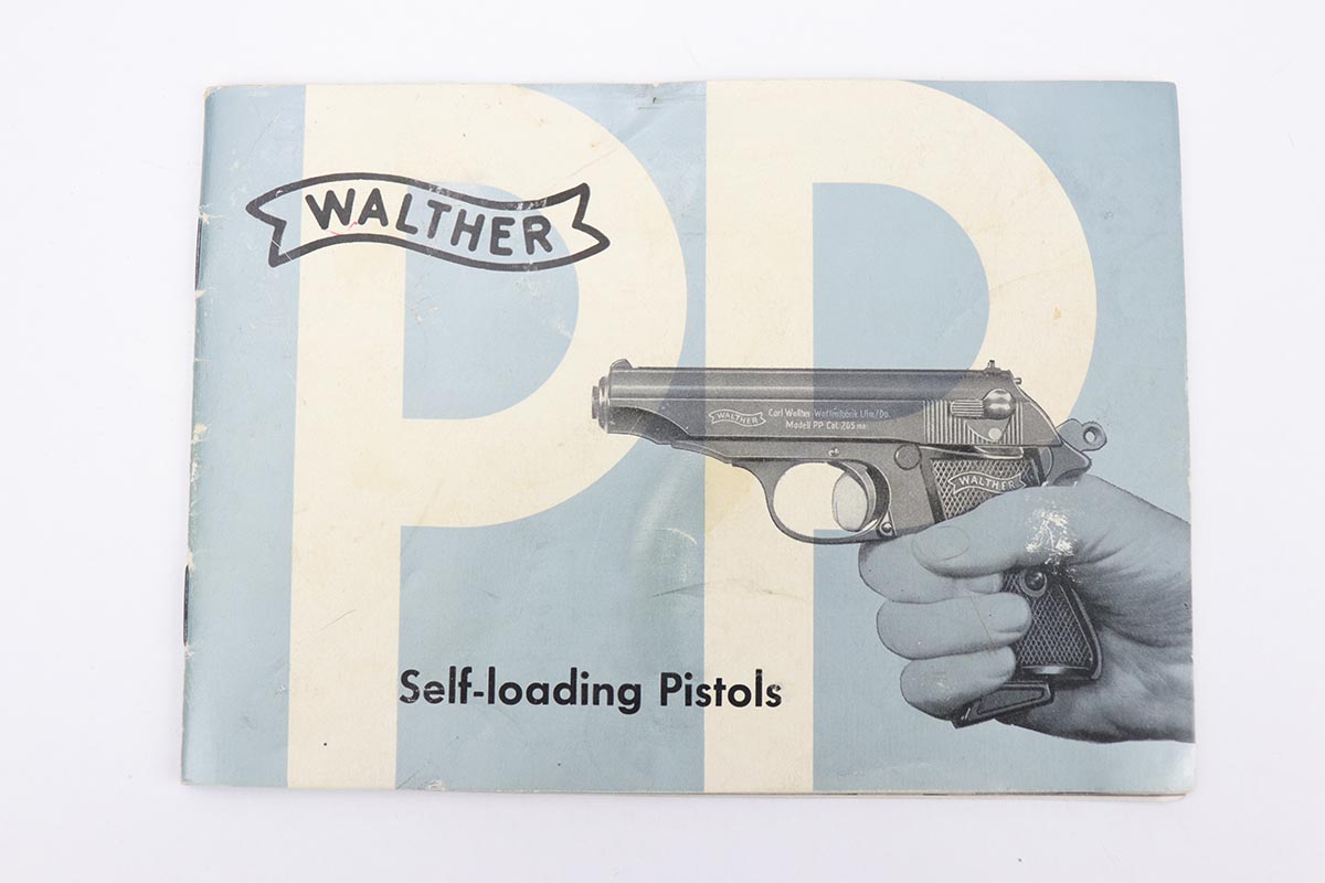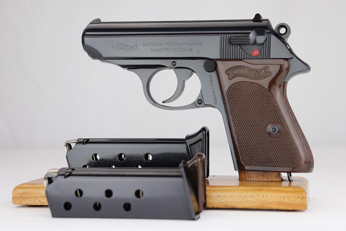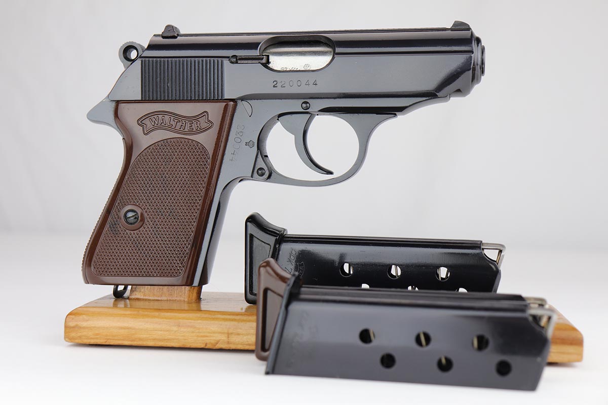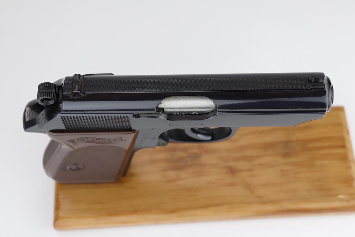8/14/19 – This is a mint condition Walther PPK with the original matching box, matching test target, manual, cleaning rod, holster and three total magazines. The pistol was made in 1967 and is chambered for the less common 7.65mm. It is a West German production and is not import marked. The gun shows no finish loss and hardly any sign of use and cannot be upgraded. The box and test target have the matching serial of the pistol on them. The grouping includes two magazines with finger extensions, one brown and one black. It also has a third magazine with flat-bottom. The holster is also a postwar production. It’s unmarked but in near-new condition.