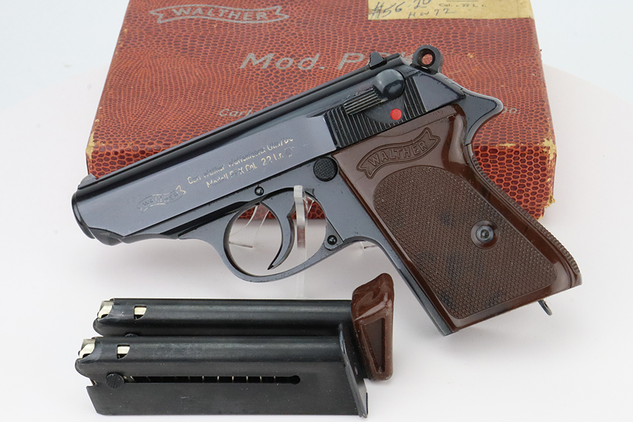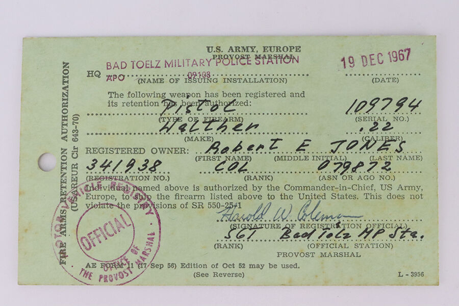 2/8/24 This is an ANIB Walther PPK, chambered in .22LR and manufactured in 1967. It belonged to Colonel Robert Jones who was stationed at the Bad Toelz U.S. military police station. This listing includes Col. Jones’ official firearms retention authorization form. The gun itself is nearly flawless, though there is some very minor pin pricking on the front grip strap, but zero actual finish loss. Mint bore and grips. Comes with original matching box and test target, two total magazines, and owner’s manual. Desirable example with no import mark.