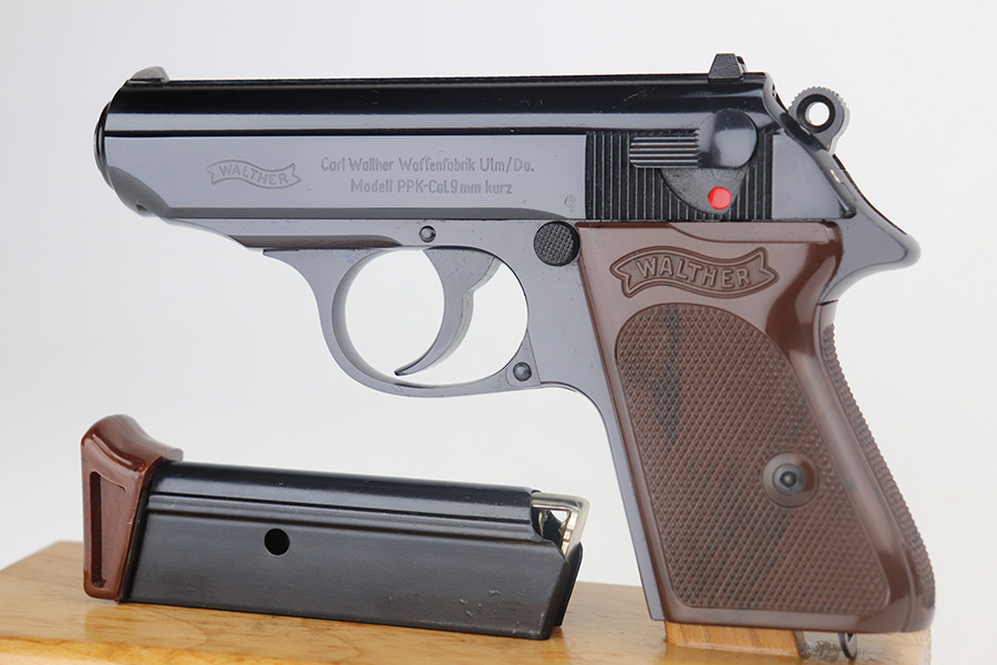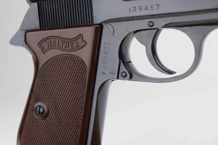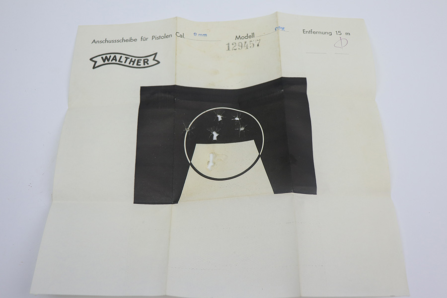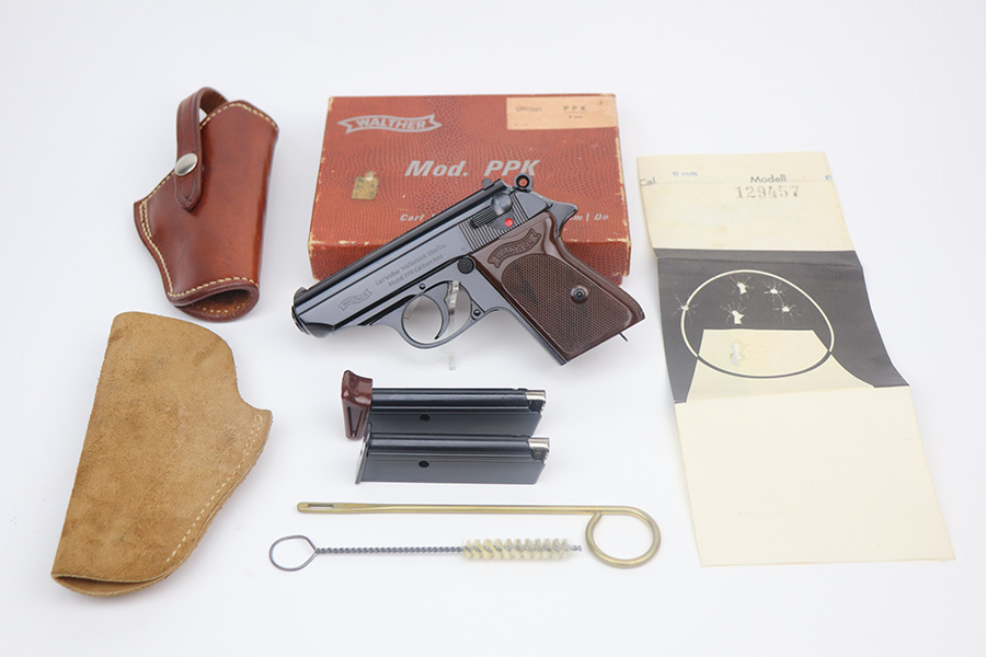 5/18/21 – This is a like-new example of a Walther PPK manufactured in 1968. No import marks. The gun comes with the original matching box, matching test target, owners manual, cleaning rod, cleaning brush, one flat bottom magazine, one finger extension magazine, and two leather holsters. The gun is matching and in like-new condition with no obvious signs of wear. Excellent grips. The bore is mint.