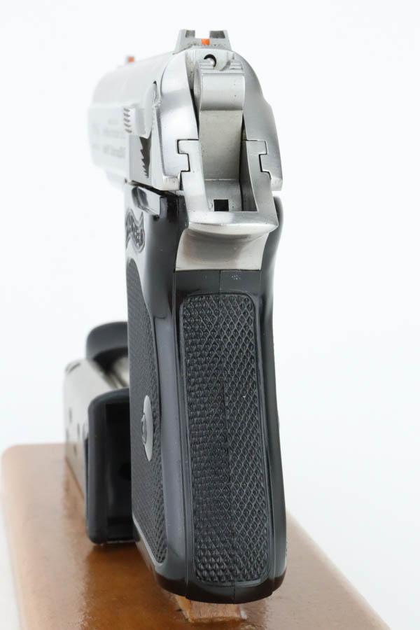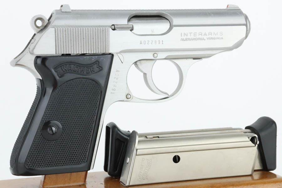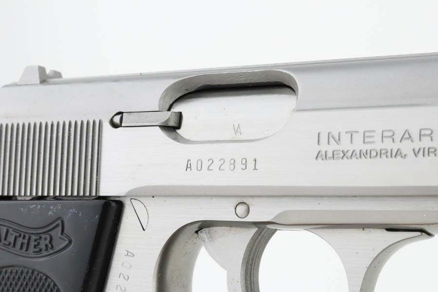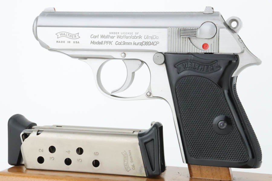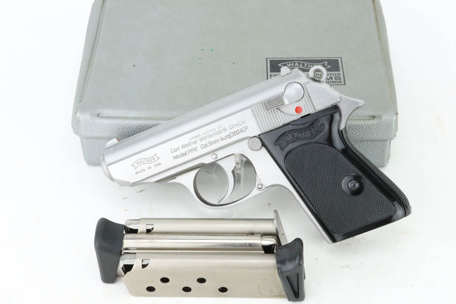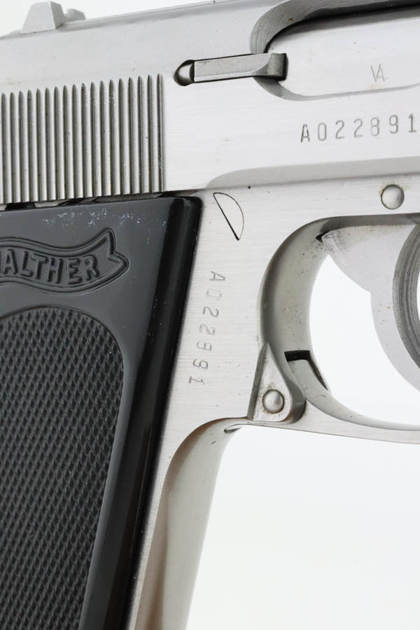 7/9/24 – This is a mint example of a Walther PPK, manufactured in 1987 and chambered in 9mm kurz or .380 ACP. It comes with its original box (not numbered), matching-numbered test target, owners manual, and two spare magazines. The gun has a nice stainless finish and shows no obvious signs of wear or use. Fitted with black plastic grips. Mint bore.