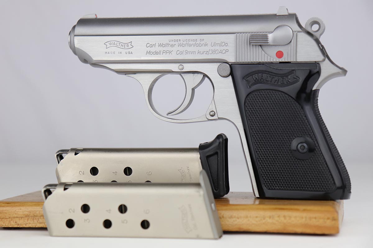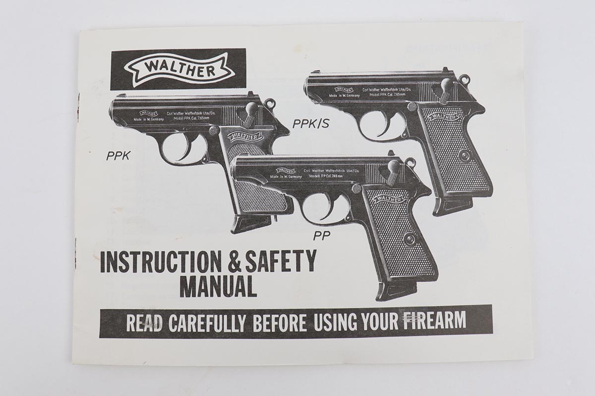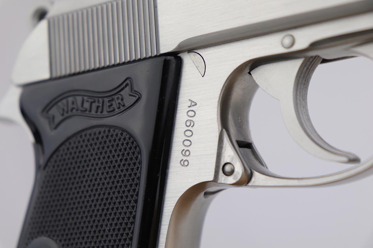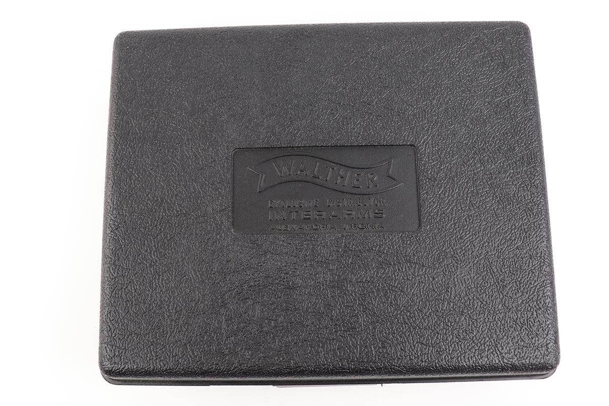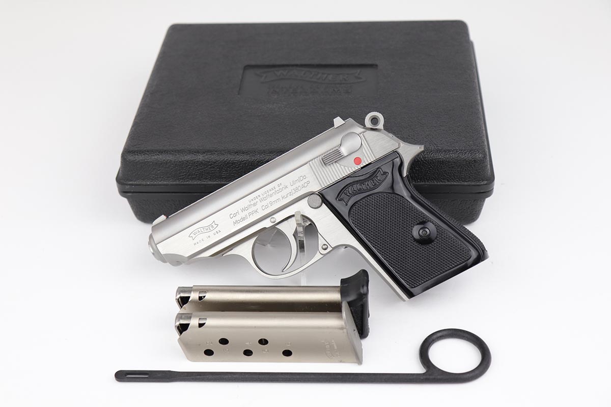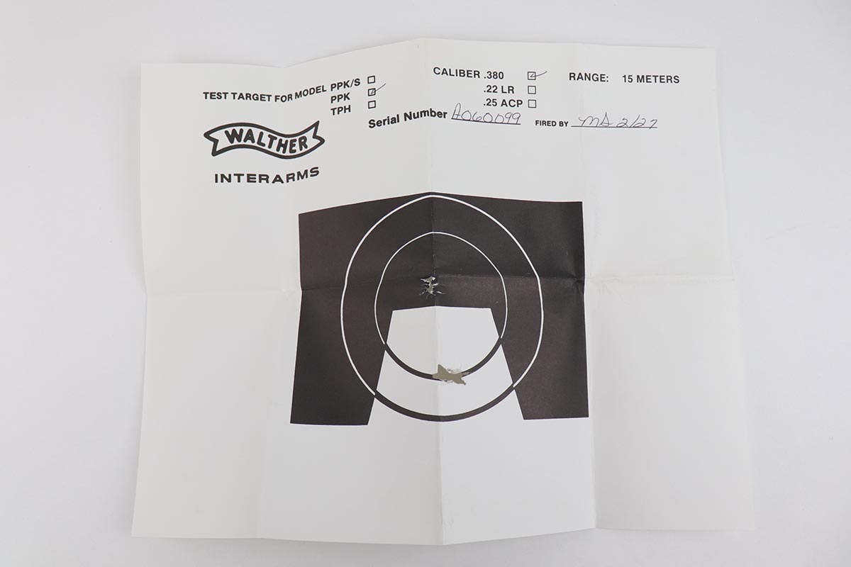 5/21/19 – This is a mint Walther PPK in the original matching box. It includes the original cleaning rod, spare magazine, matching numbered test target, and original manuals. The pistol is virtually mint, with one or two small scratches from shifting inside the box. Very minimally used with a mint bore. Modern example that was made in the United States. FFL required.