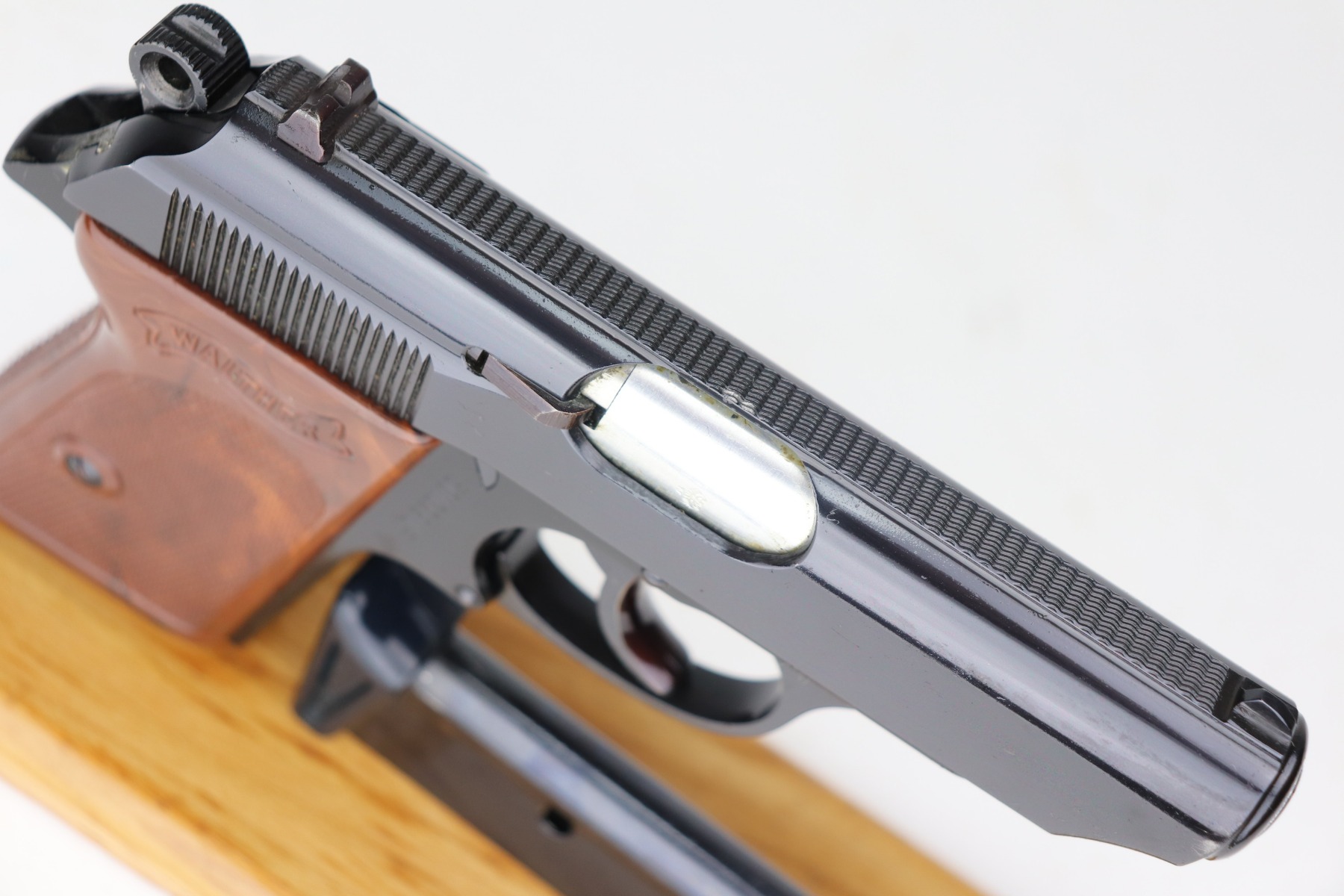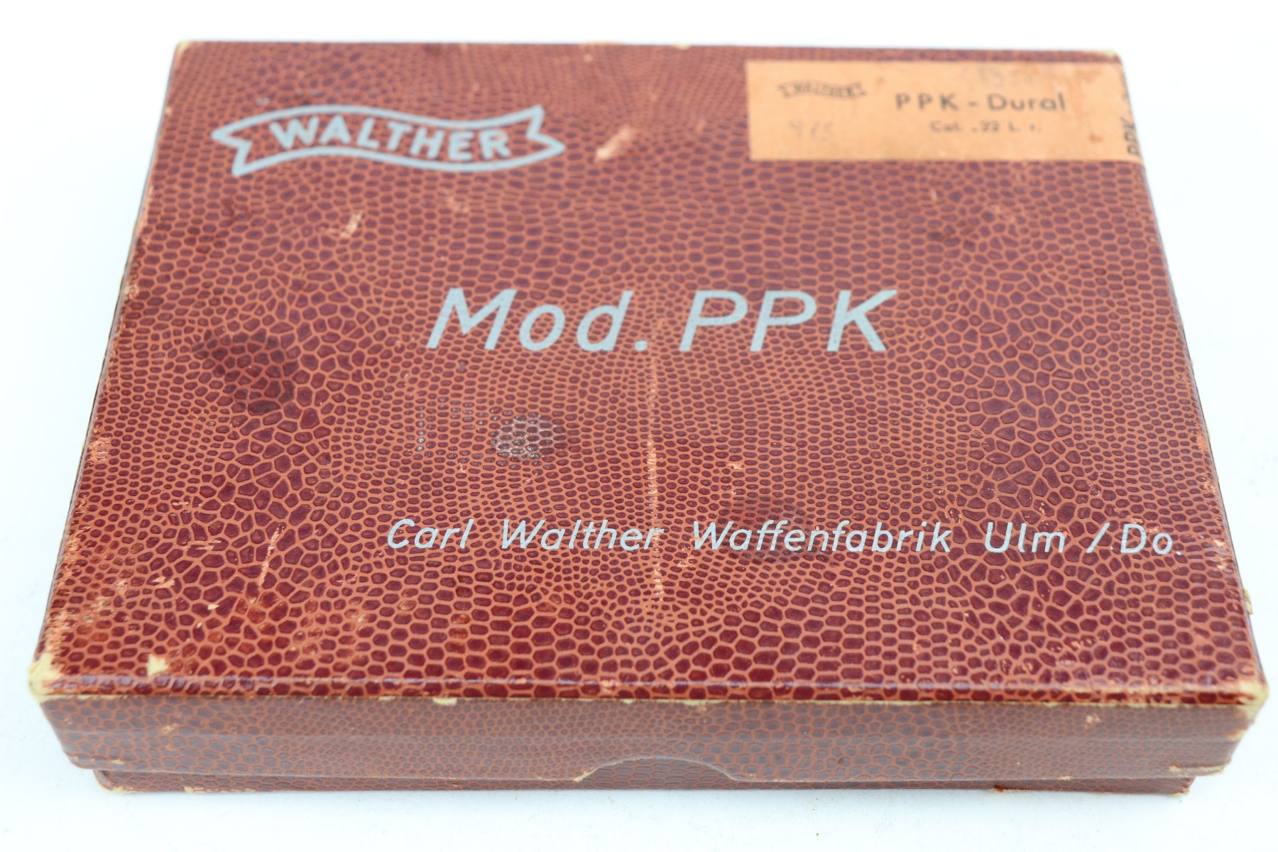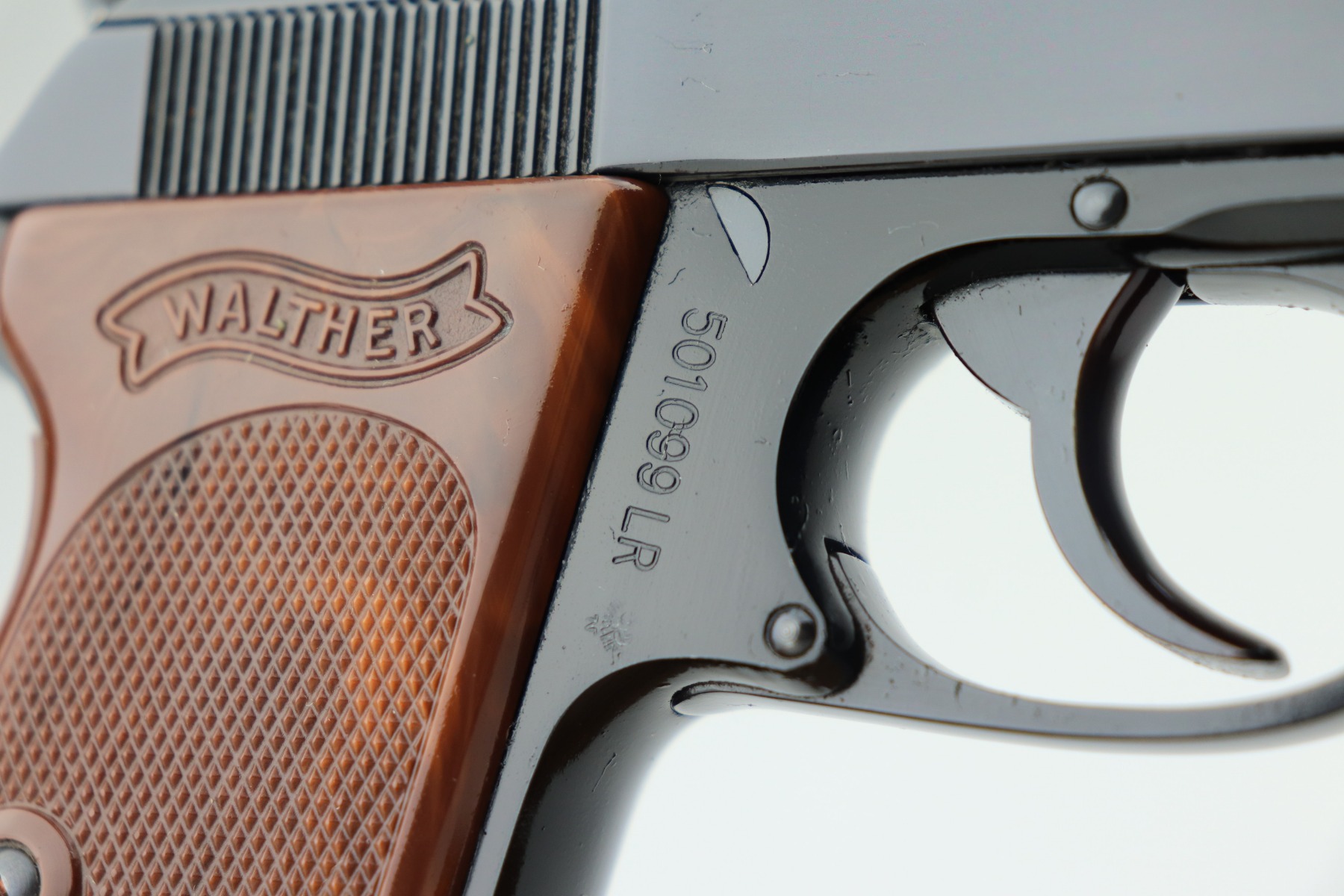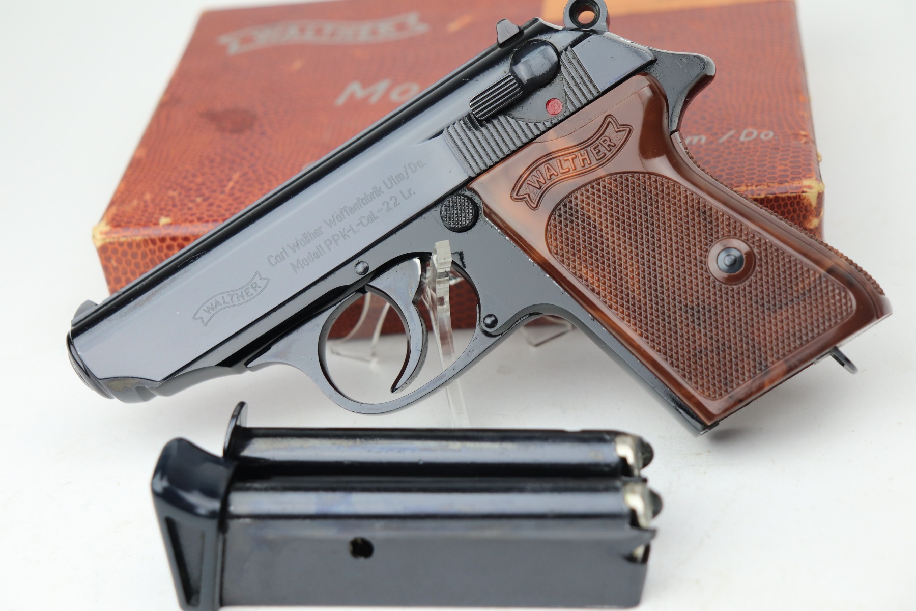 3/3/21 – This is a stone-mint example of a Walther PPK manufactured around 1961. Chambered in .22LR. This one has a duraluminum frame and is an early model before they started adding date codes to these guns. No import marks. The gun comes with the original box (serialized to the gun), cleaning rod, flat bottom magazine, and a finger extension magazine. The gun is in mint, like-new condition with no obvious signs of wear. Mint bore. Mint grip.
