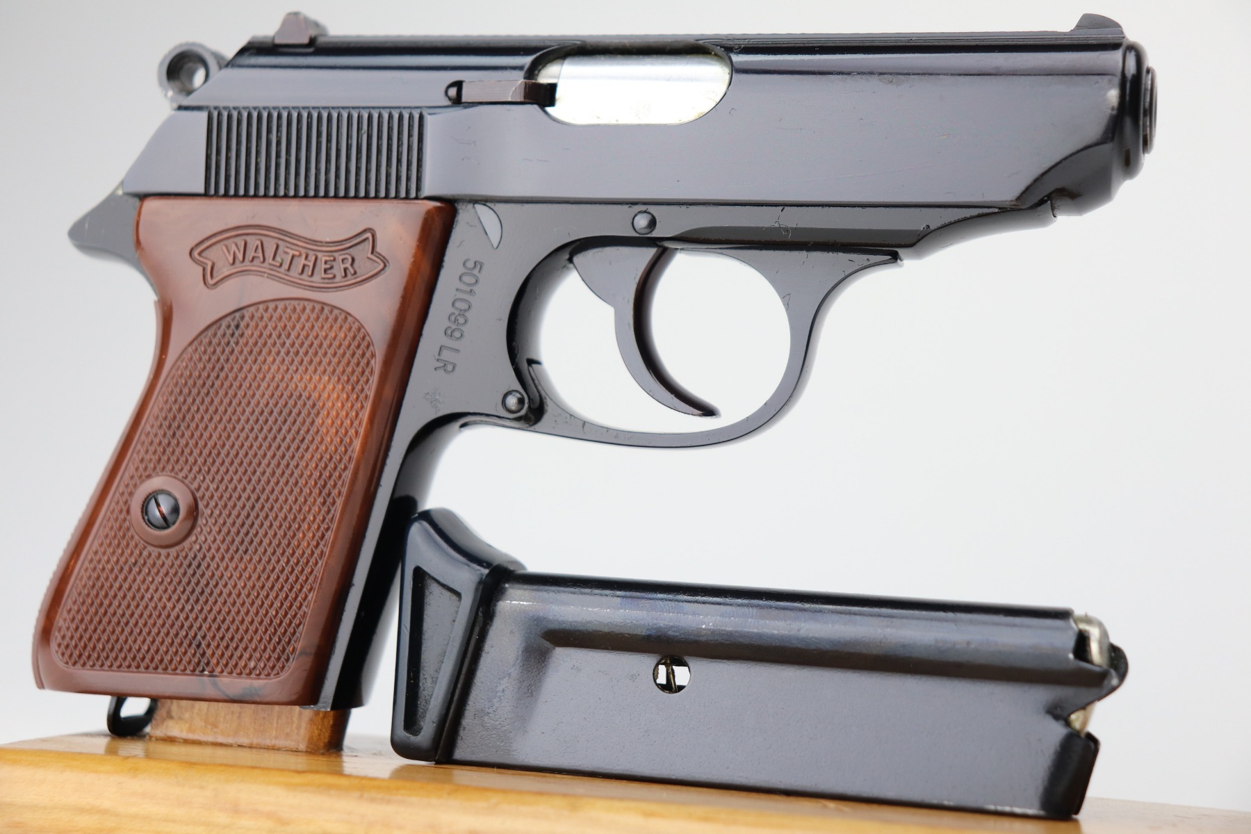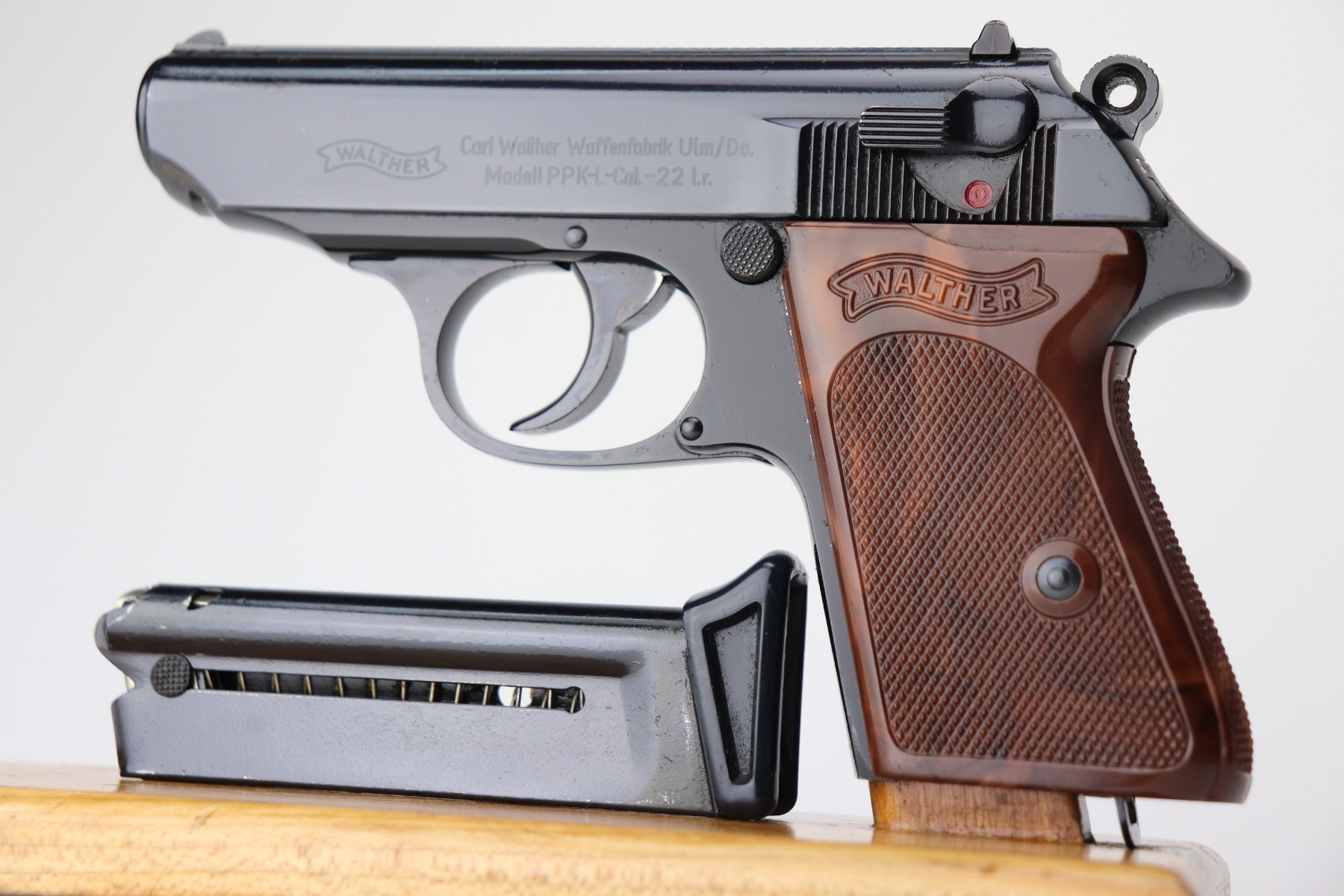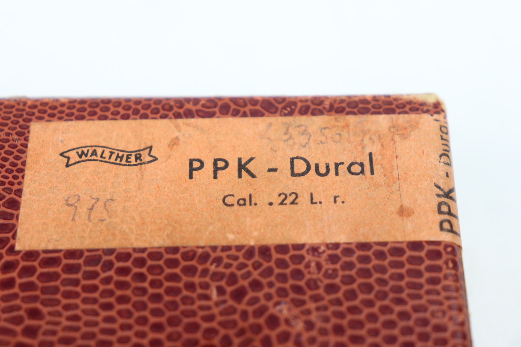 3/3/21 – This is a stone-mint example of a Walther PPK manufactured around 1961. Chambered in .22LR. This one has a duraluminum frame and is an early model before they started adding date codes to these guns. No import marks. The gun comes with the original box (serialized to the gun), cleaning rod, flat bottom magazine, and a finger extension magazine. The gun is in mint, like-new condition with no obvious signs of wear. Mint bore. Mint grip.