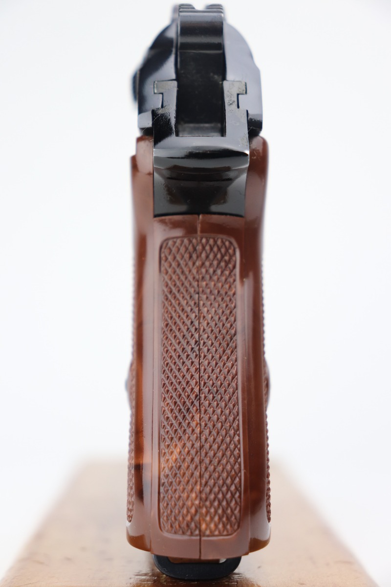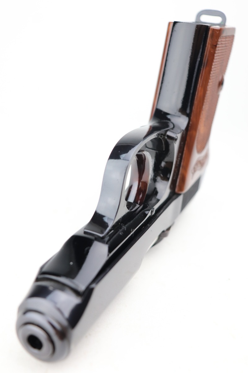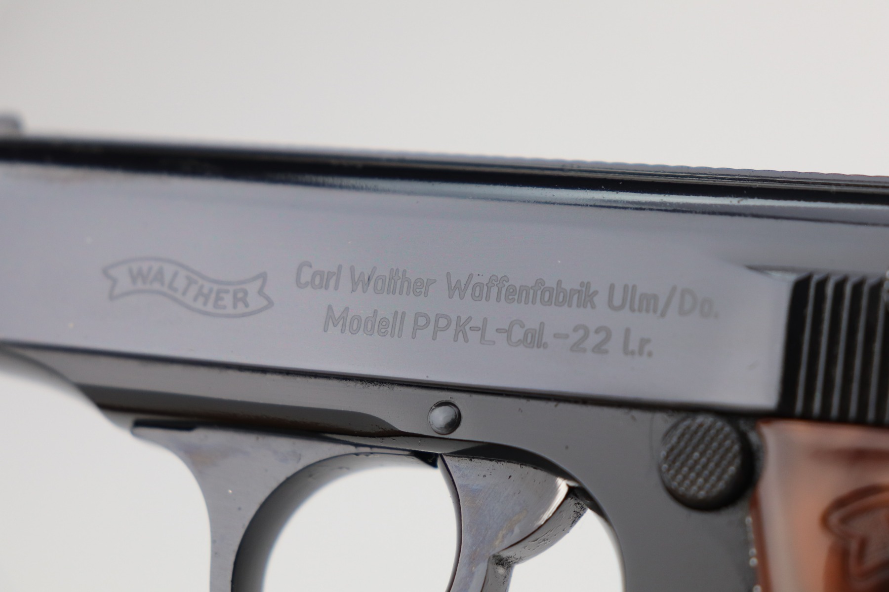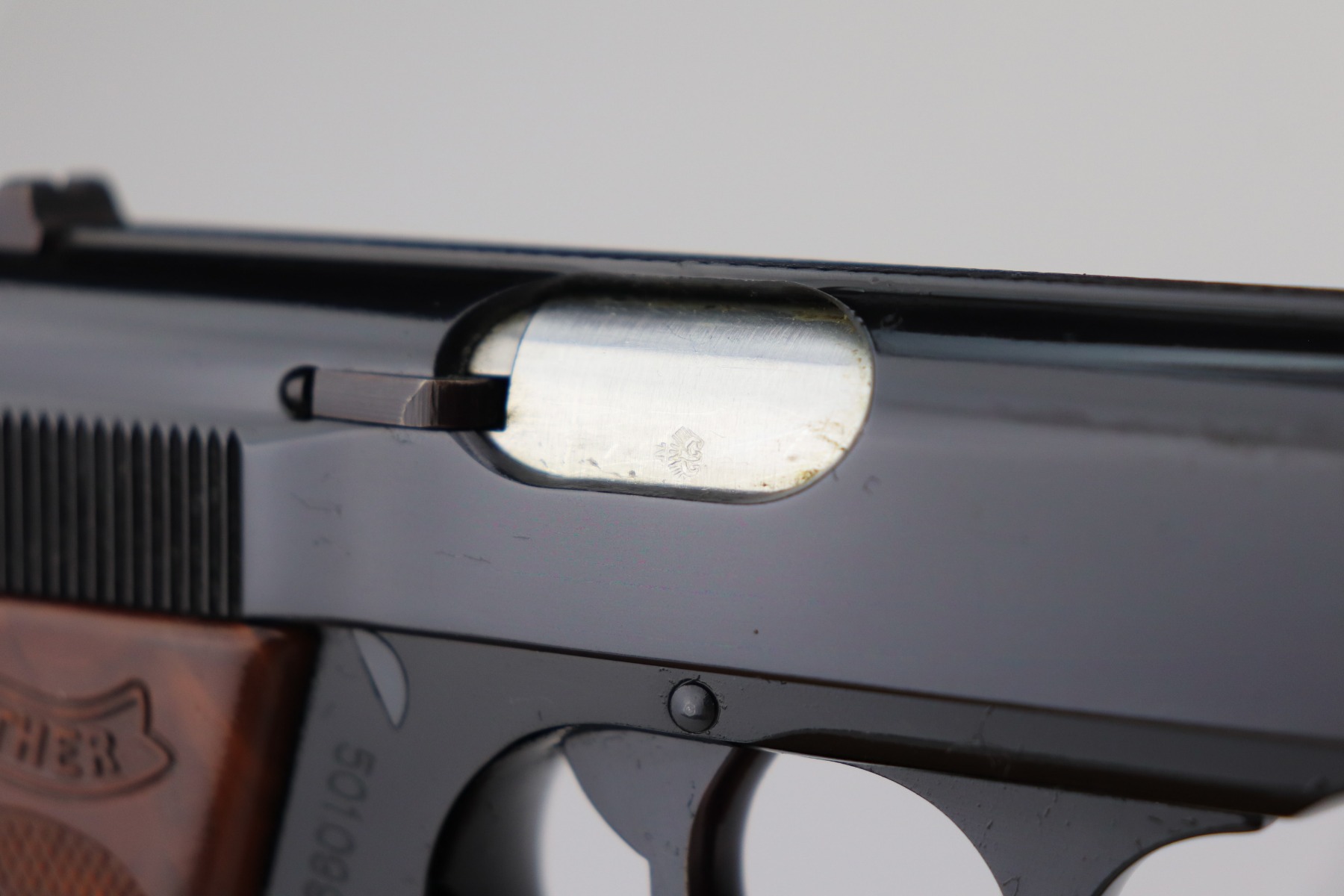 3/3/21 – This is a stone-mint example of a Walther PPK manufactured around 1961. Chambered in .22LR. This one has a duraluminum frame and is an early model before they started adding date codes to these guns. No import marks. The gun comes with the original box (serialized to the gun), cleaning rod, flat bottom magazine, and a finger extension magazine. The gun is in mint, like-new condition with no obvious signs of wear. Mint bore. Mint grip.