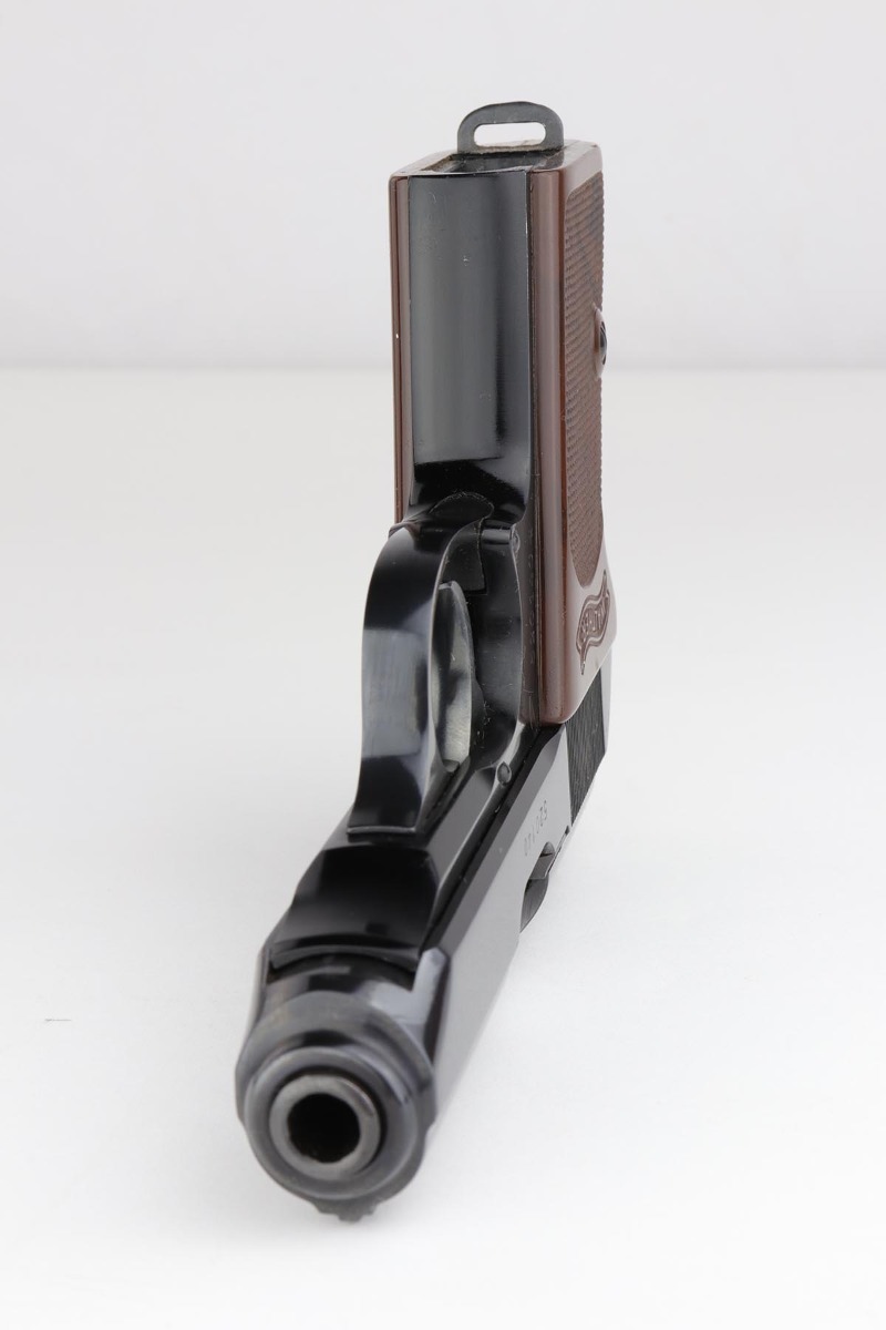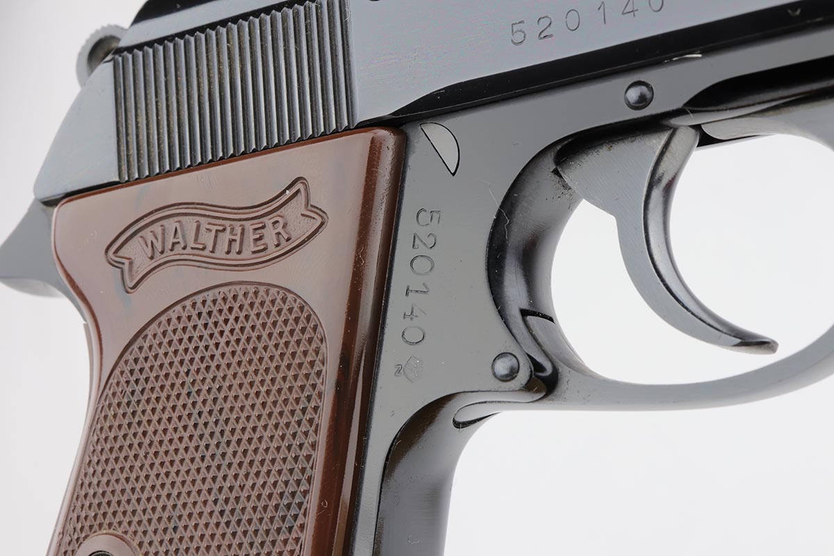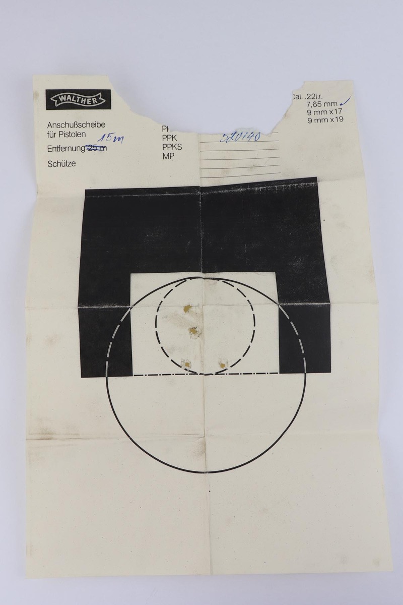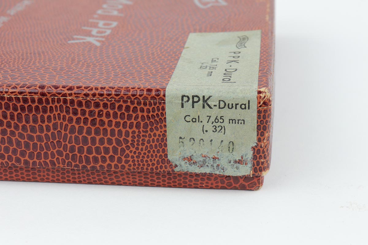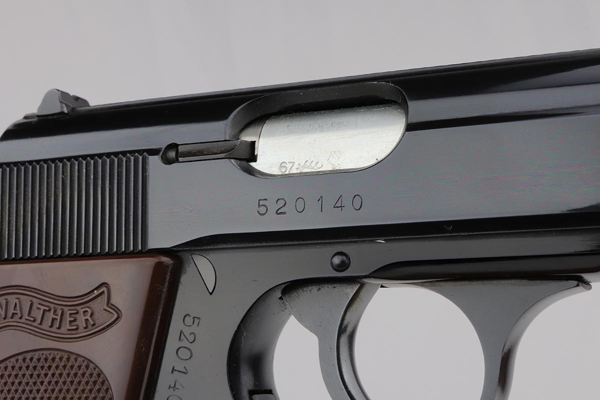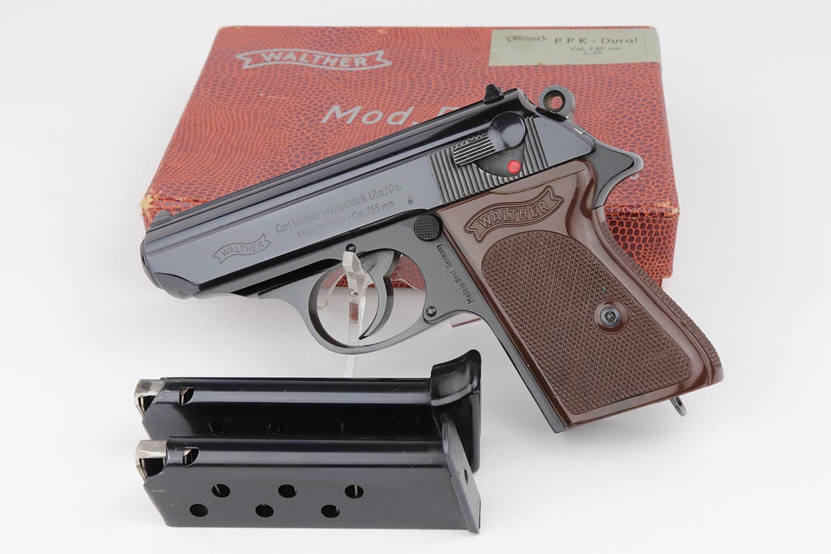 7/12/19 – Arguably the rarest variation of the post-war Walther PPK pistols, this Dural model was made in 1967 and chambered in 7.65mm(.32 ACP). It is ‘as new in the box’ and appears unfired, except for a couple of minuscule spots on the tang from shifting inside the box for over 50 years. It is complete with a matching box, a matching test target, manual, and a spare magazine. The bluing is otherwise without defects and is considered by many to be the best blue that Walther produced over the last 100 years. The frame is light weight aluminum, as evidenced by PPK-L designation on the left side of the slide. Mint, impossible to upgrade example with no import or “Interarms” markings.
