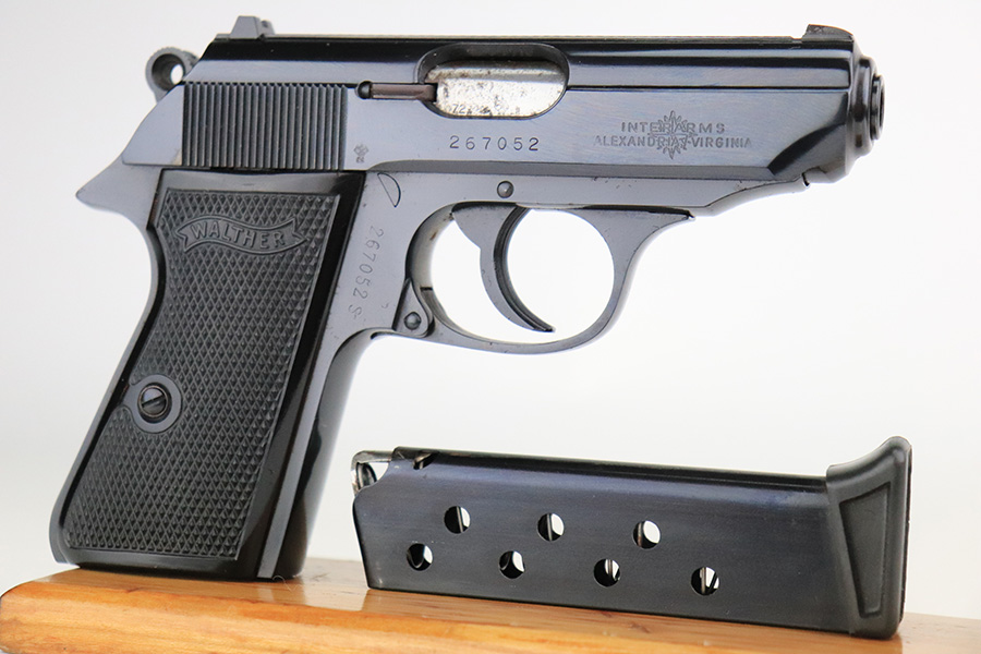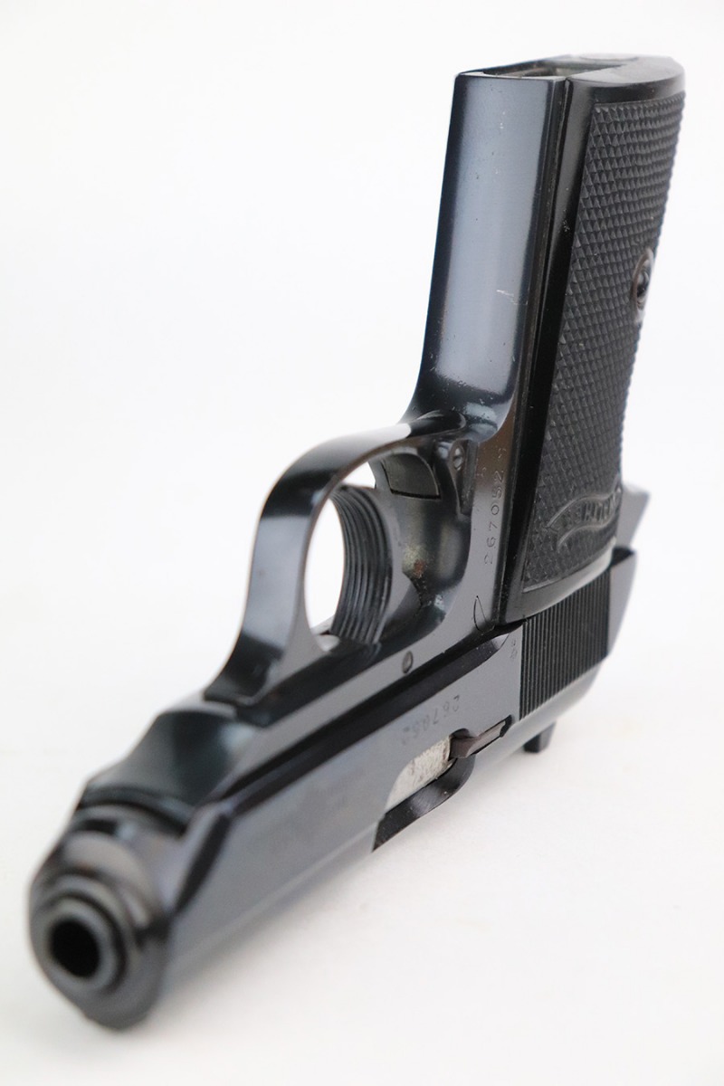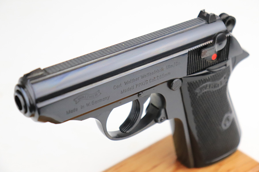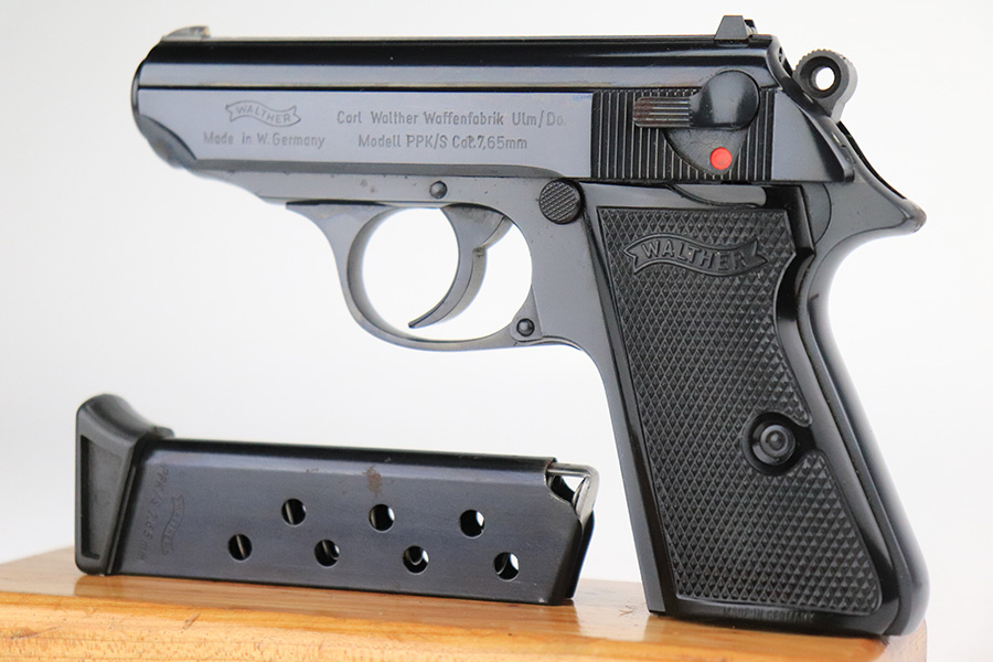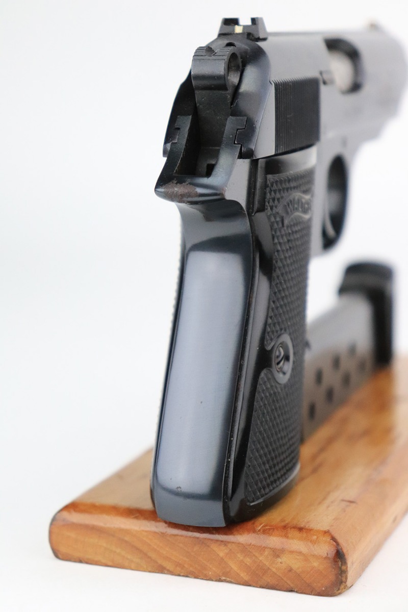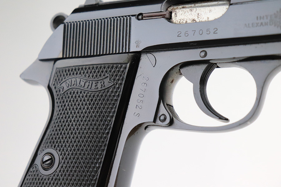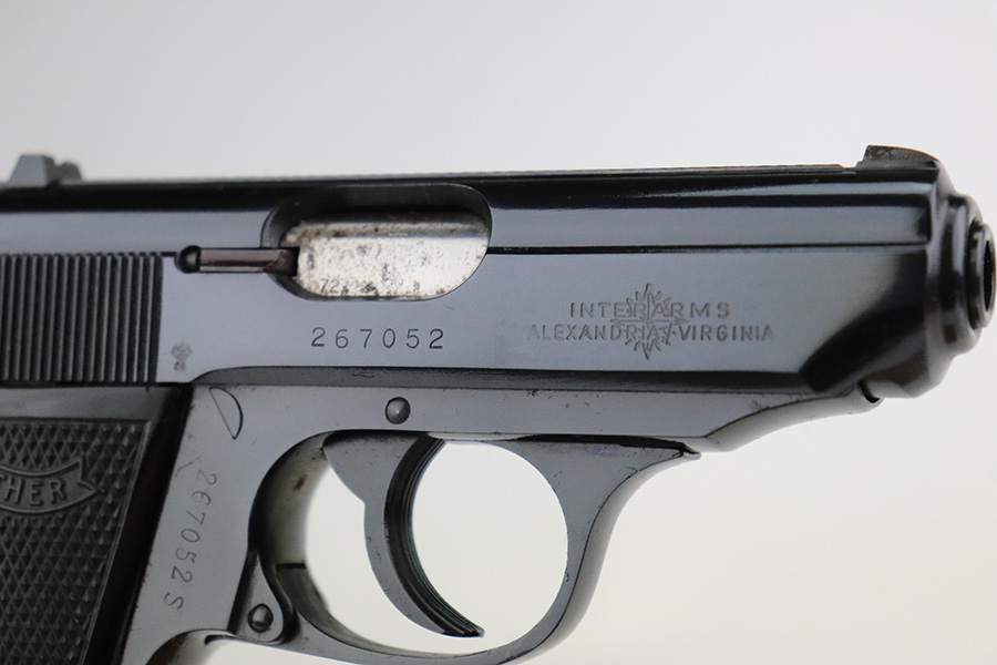 7/28/22 – This is a mint example of a Walther PPK/S manufactured in 1972. It is all matching and has the proper West German proofs. Interarms marking on the right side of the slide. The gun comes with its original matching-numbered box, owners manual, cleaning rod, one finger extension magazine, and one flat bottom magazine. It has retained virtually all of its high polish finish. There are just two small dots of oxidation on the left side of the frame and some light spotty oxidation on the barrel through the ejection port. Comes with excellent black plastic grips. Mint bore.