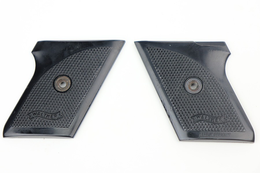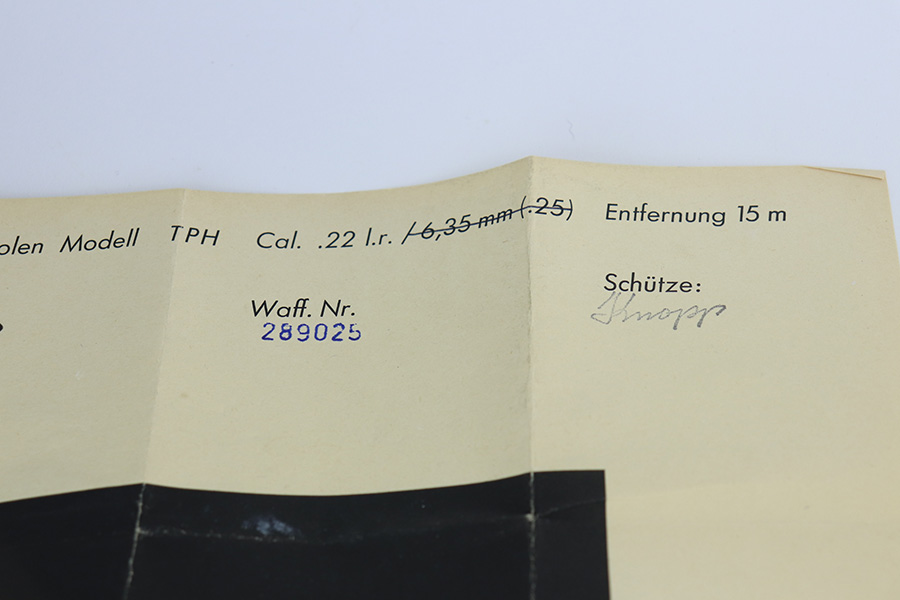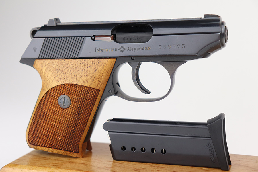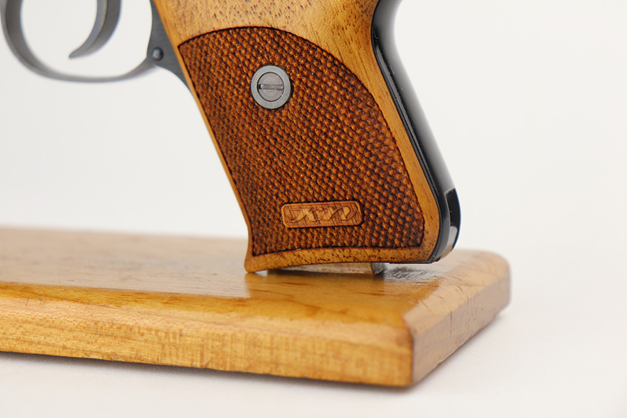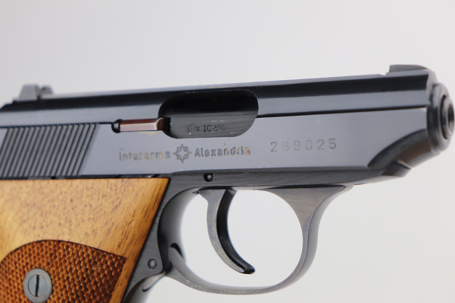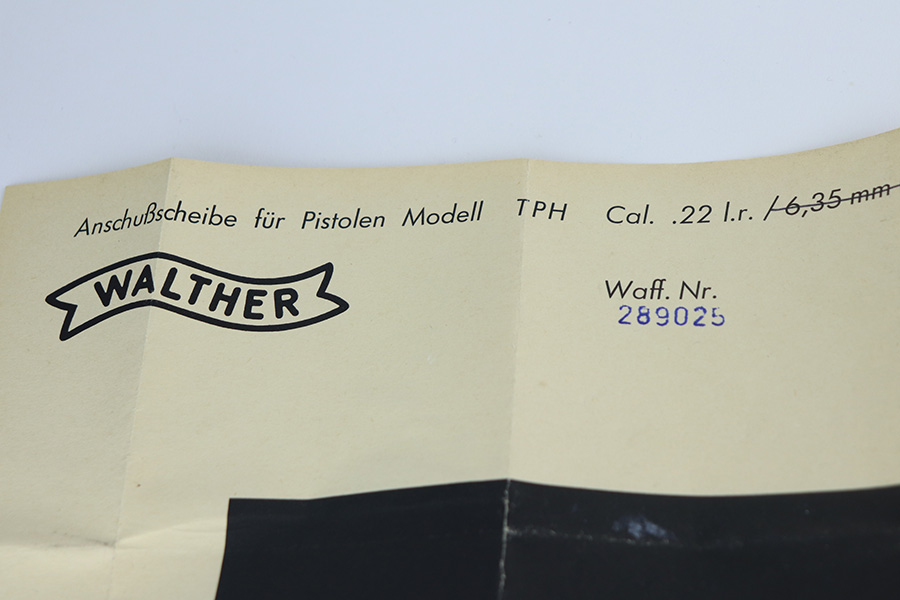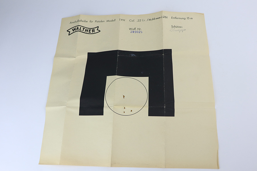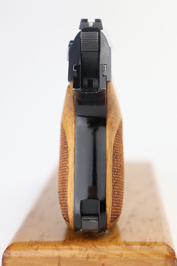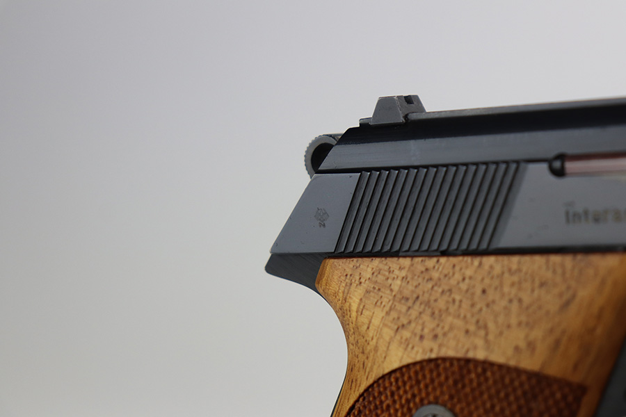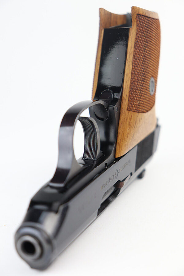 6/16/21 – This is a like-new example of a Walther THP manufactured in 1982. It comes with the original matching box, matching test target, owners manual, 3 magazines, and a spare set of black bakelite grips. The gun is matching, has the proper German proofs, and has an Interarms marking on the right side of the slide. The gun is in like-new, mint condition with just the tiniest hint of wear around the muzzle. Comes with excellent wood grips. Mint bore.