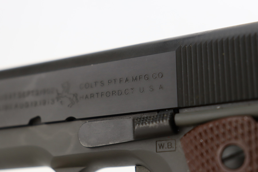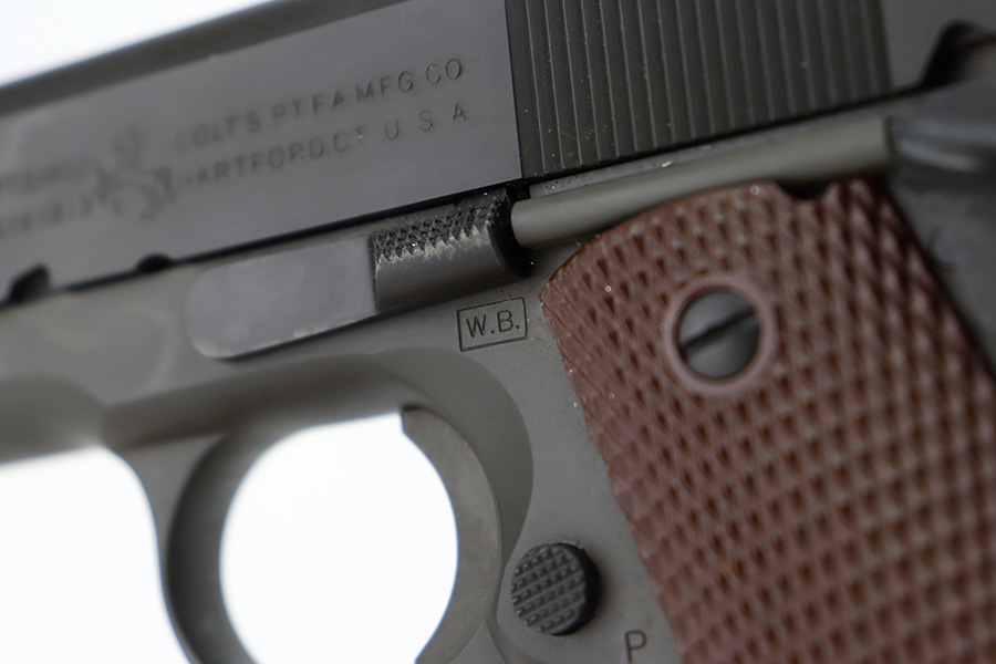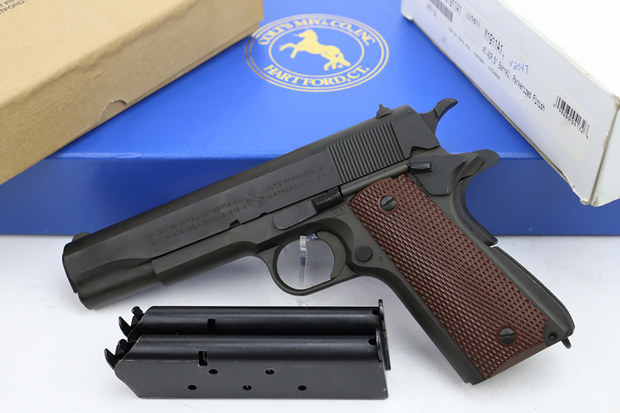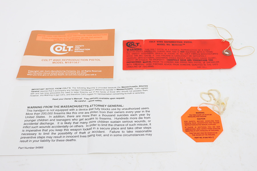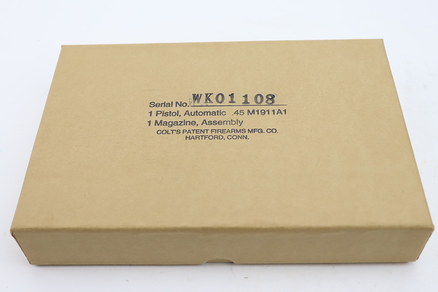12/6/23 – This is an ANIB Colt M1911A1 that was part of a limited (4,000 guns) reproduction run of military style pistols that Colt did in the early 2000s. The gun is designed completely to WWII specs, including the markings such as the WB inspectors mark on frame. They were given special serial numbers, with the first batch receiving a “WK” prefix, which represented then-CEO of Colt, William Keyes. This gun is like-new with no signs of wear or use. Comes with its original outer cardboard boxes, “kraft box”, two magazines, owners manual, and gun lock. Like-new bore.