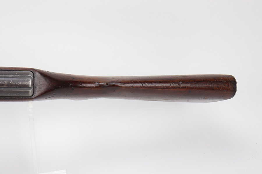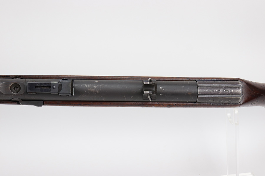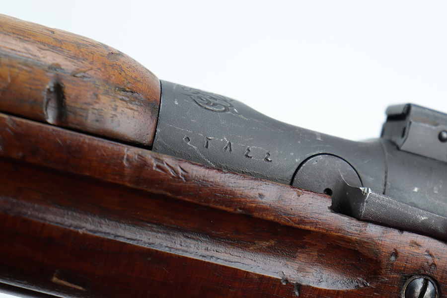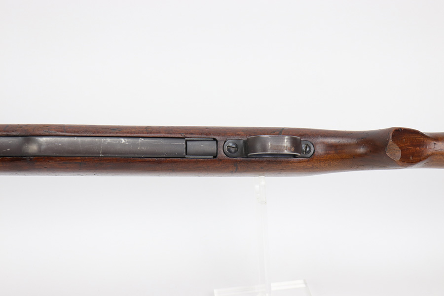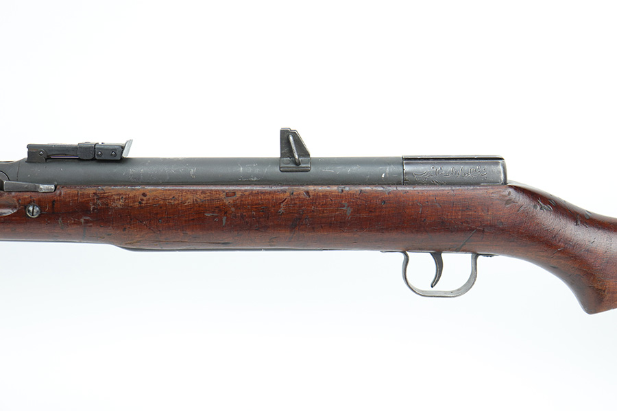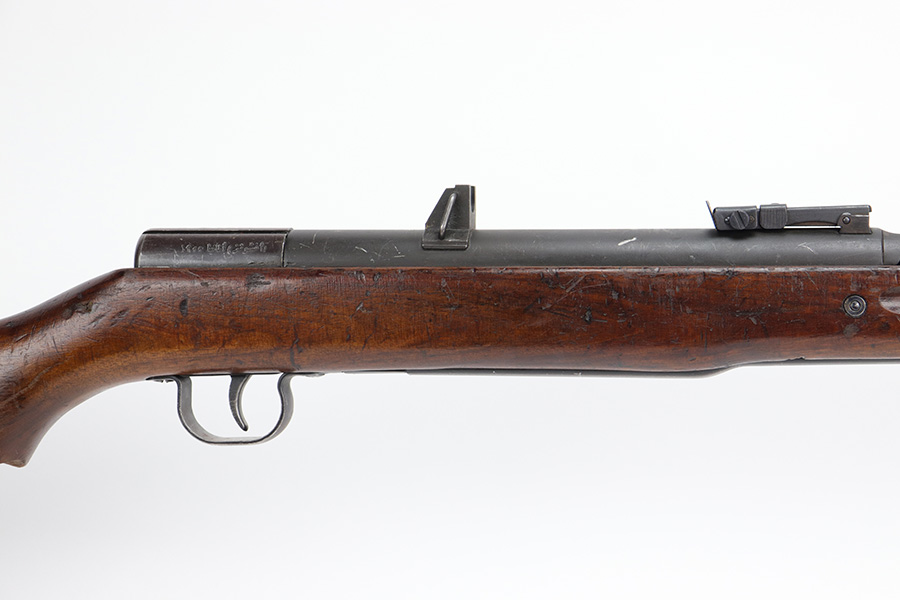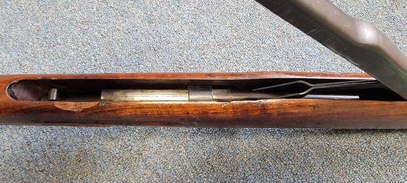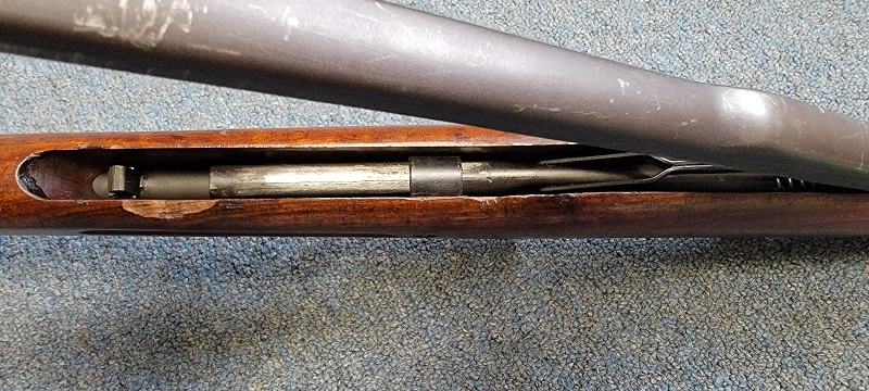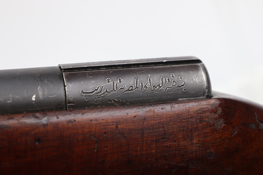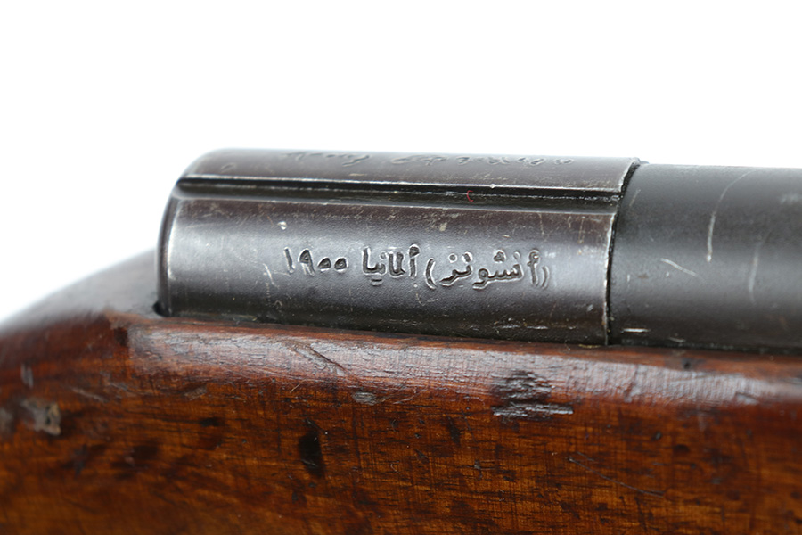 6/16/23 – This is an Egyptian Hakim Air Training Rifle made by Anschutz in the 1950’s. The air rifle has an underlever single action based on the BSA Airsporter of 1947. The action is smooth and fully functional, with the loading tap in the top of the receiver automatically opening when the lever is fully cocked. However, due to this style of action it’s very difficult to get a good look down the bore, and we therefore have no bore rating. We assume the condition (and from what little we can see) is very good overall and similar to the exterior condition. The metal rates around 85% with a dull parkerized finish that shows mild surface patina and typical edge wear from use and handling. The wood stock has a few mild bumps and bruises and two minor chips in the wood. The first is along the edge of the channel in the underside for the cocking lever. The second is at the base of the pistol grip or neck of the rifle. Both chips are minor and shouldn’t affect functionality. Based on our research we found this takes a .22 caliber pellet.
