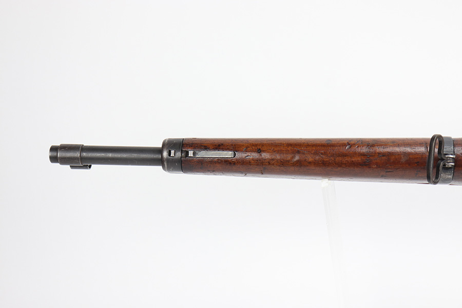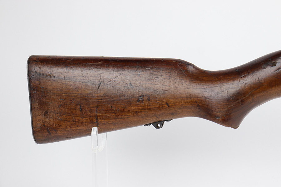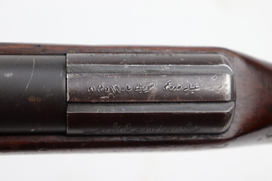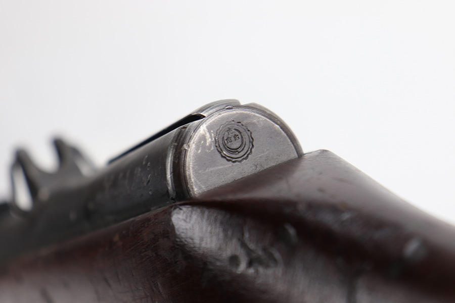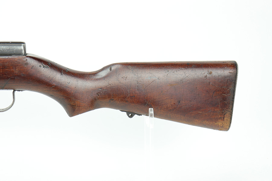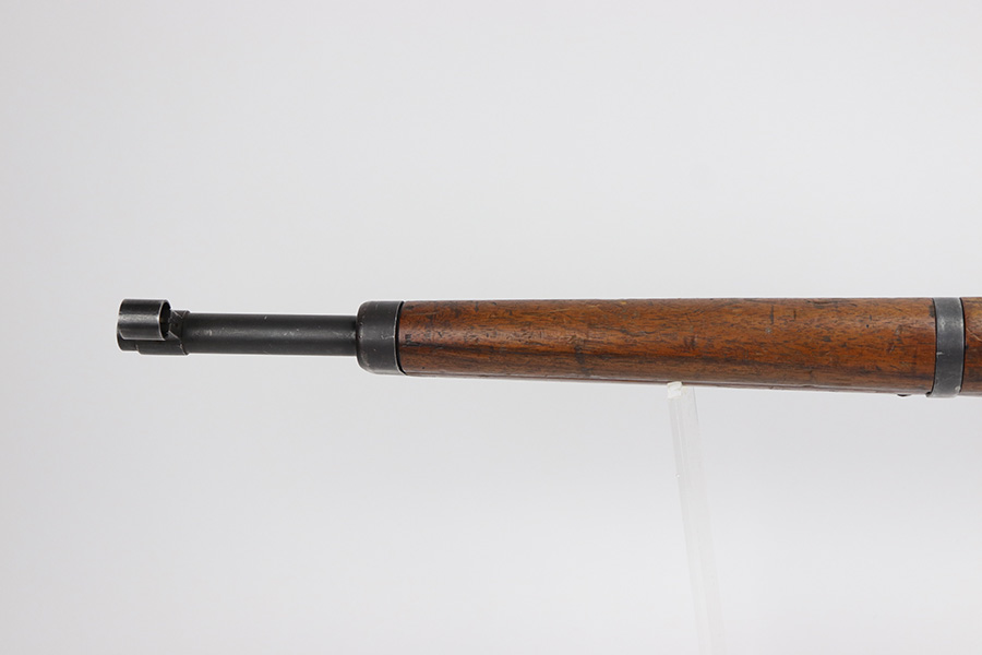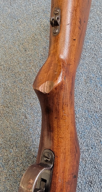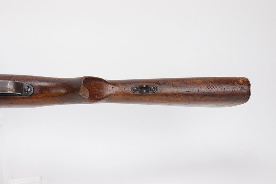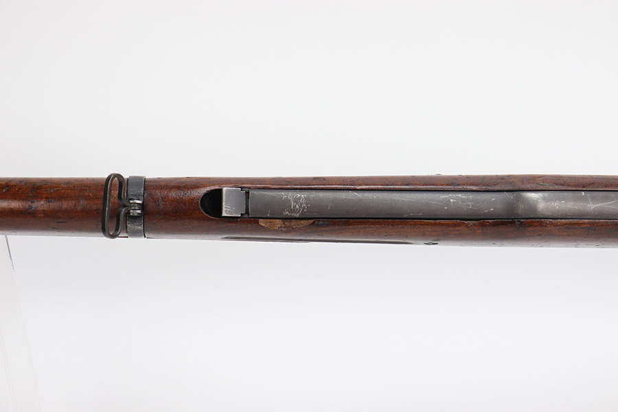 6/16/23 – This is an Egyptian Hakim Air Training Rifle made by Anschutz in the 1950’s. The air rifle has an underlever single action based on the BSA Airsporter of 1947. The action is smooth and fully functional, with the loading tap in the top of the receiver automatically opening when the lever is fully cocked. However, due to this style of action it’s very difficult to get a good look down the bore, and we therefore have no bore rating. We assume the condition (and from what little we can see) is very good overall and similar to the exterior condition. The metal rates around 85% with a dull parkerized finish that shows mild surface patina and typical edge wear from use and handling. The wood stock has a few mild bumps and bruises and two minor chips in the wood. The first is along the edge of the channel in the underside for the cocking lever. The second is at the base of the pistol grip or neck of the rifle. Both chips are minor and shouldn’t affect functionality. Based on our research we found this takes a .22 caliber pellet.