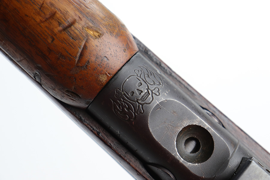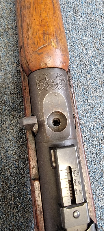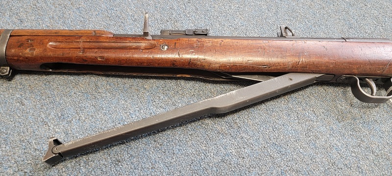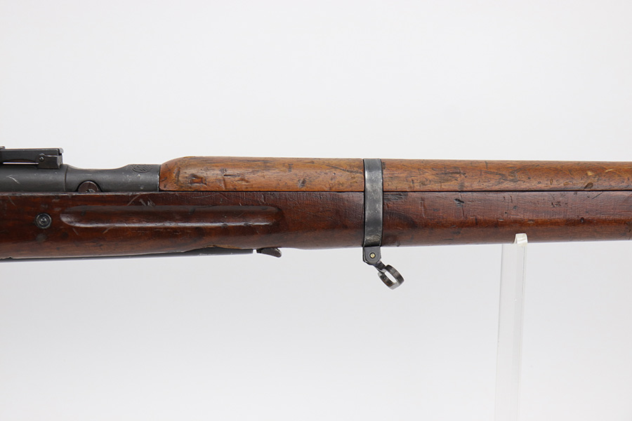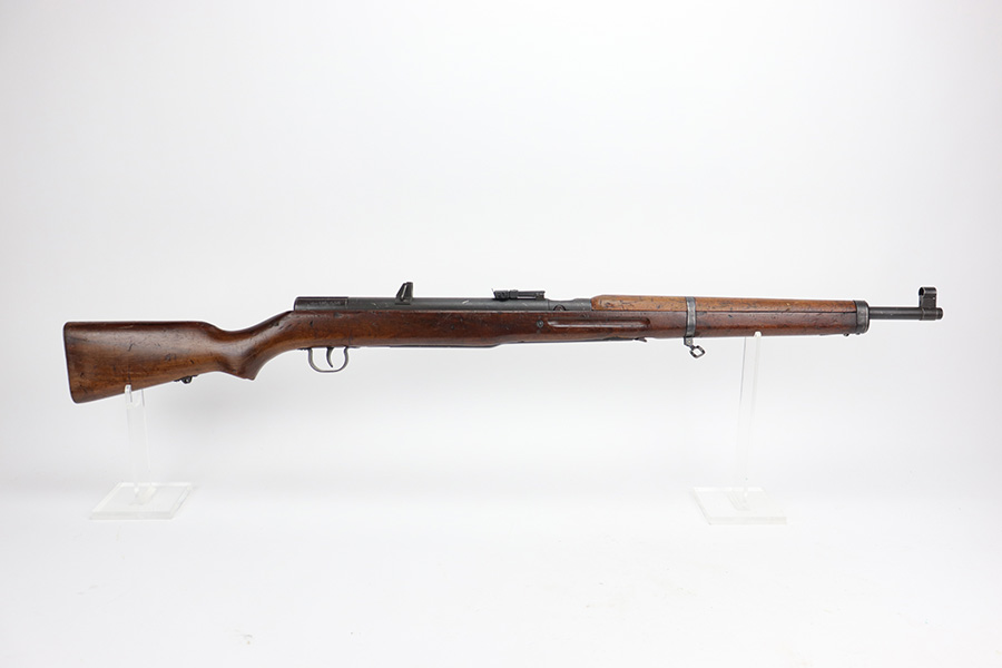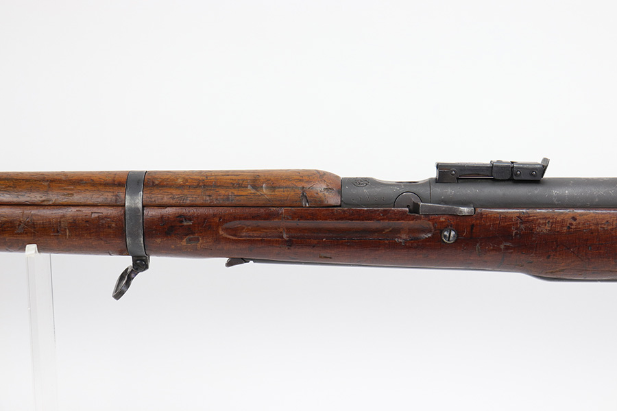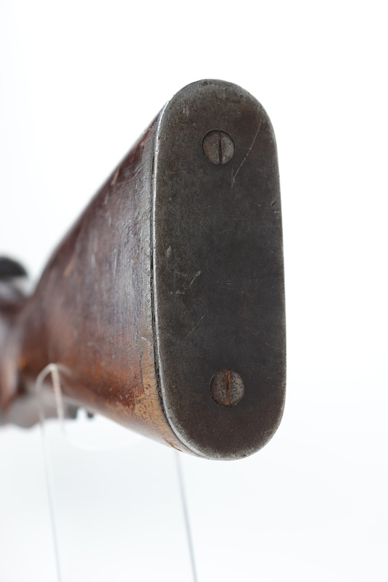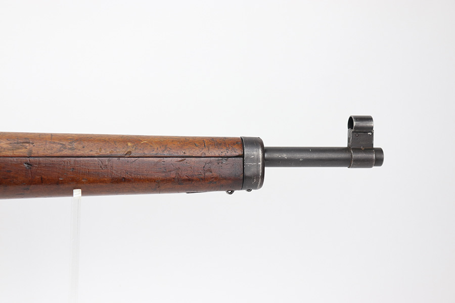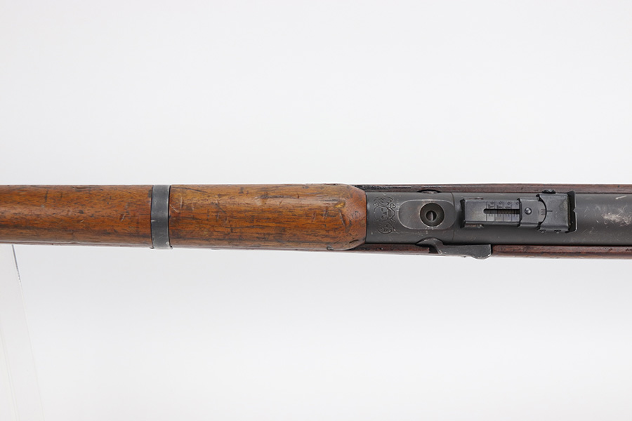 6/16/23 – This is an Egyptian Hakim Air Training Rifle made by Anschutz in the 1950’s. The air rifle has an underlever single action based on the BSA Airsporter of 1947. The action is smooth and fully functional, with the loading tap in the top of the receiver automatically opening when the lever is fully cocked. However, due to this style of action it’s very difficult to get a good look down the bore, and we therefore have no bore rating. We assume the condition (and from what little we can see) is very good overall and similar to the exterior condition. The metal rates around 85% with a dull parkerized finish that shows mild surface patina and typical edge wear from use and handling. The wood stock has a few mild bumps and bruises and two minor chips in the wood. The first is along the edge of the channel in the underside for the cocking lever. The second is at the base of the pistol grip or neck of the rifle. Both chips are minor and shouldn’t affect functionality. Based on our research we found this takes a .22 caliber pellet.
