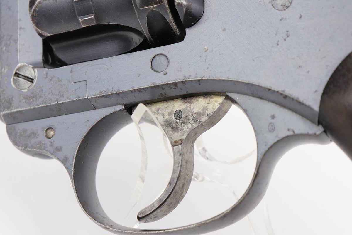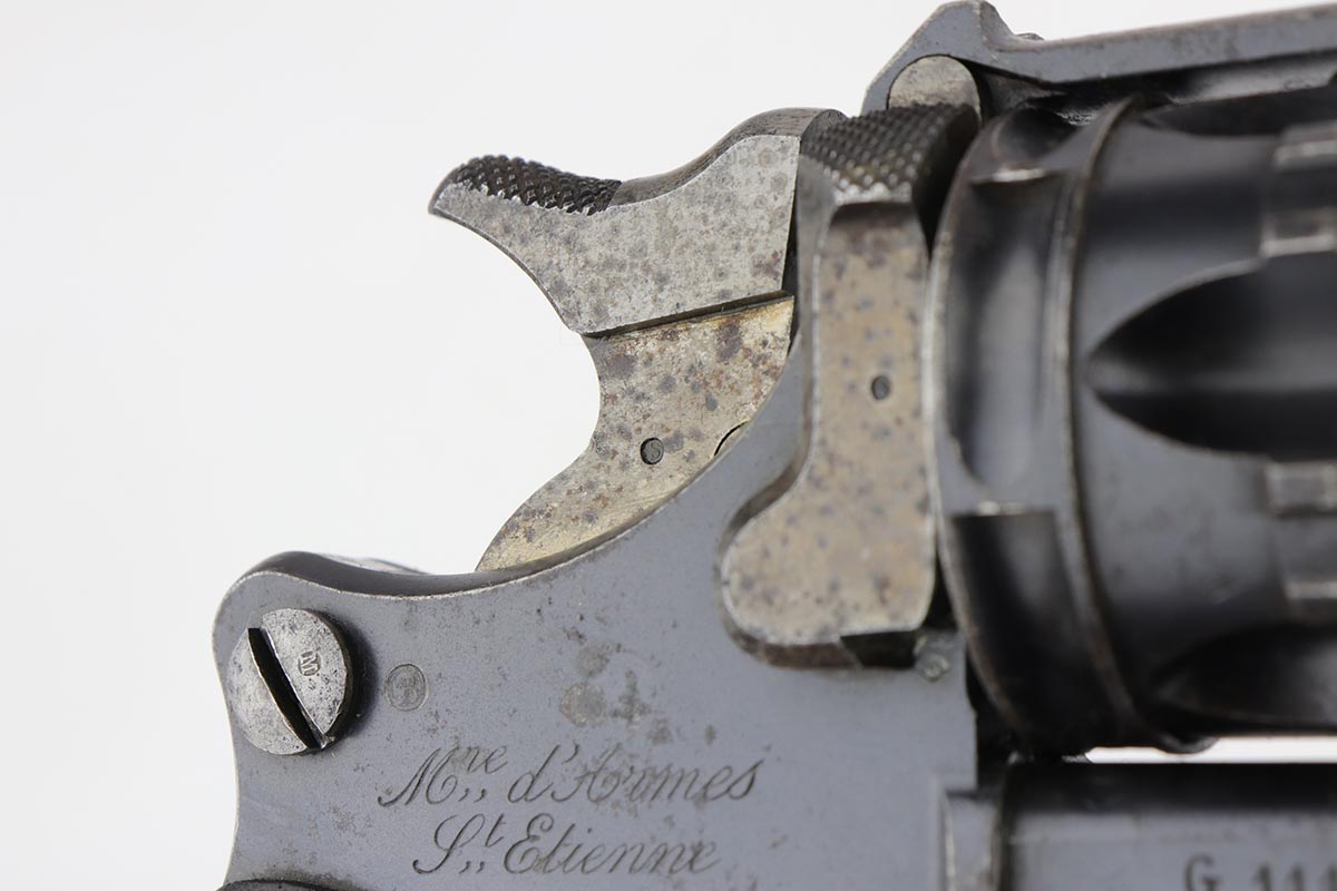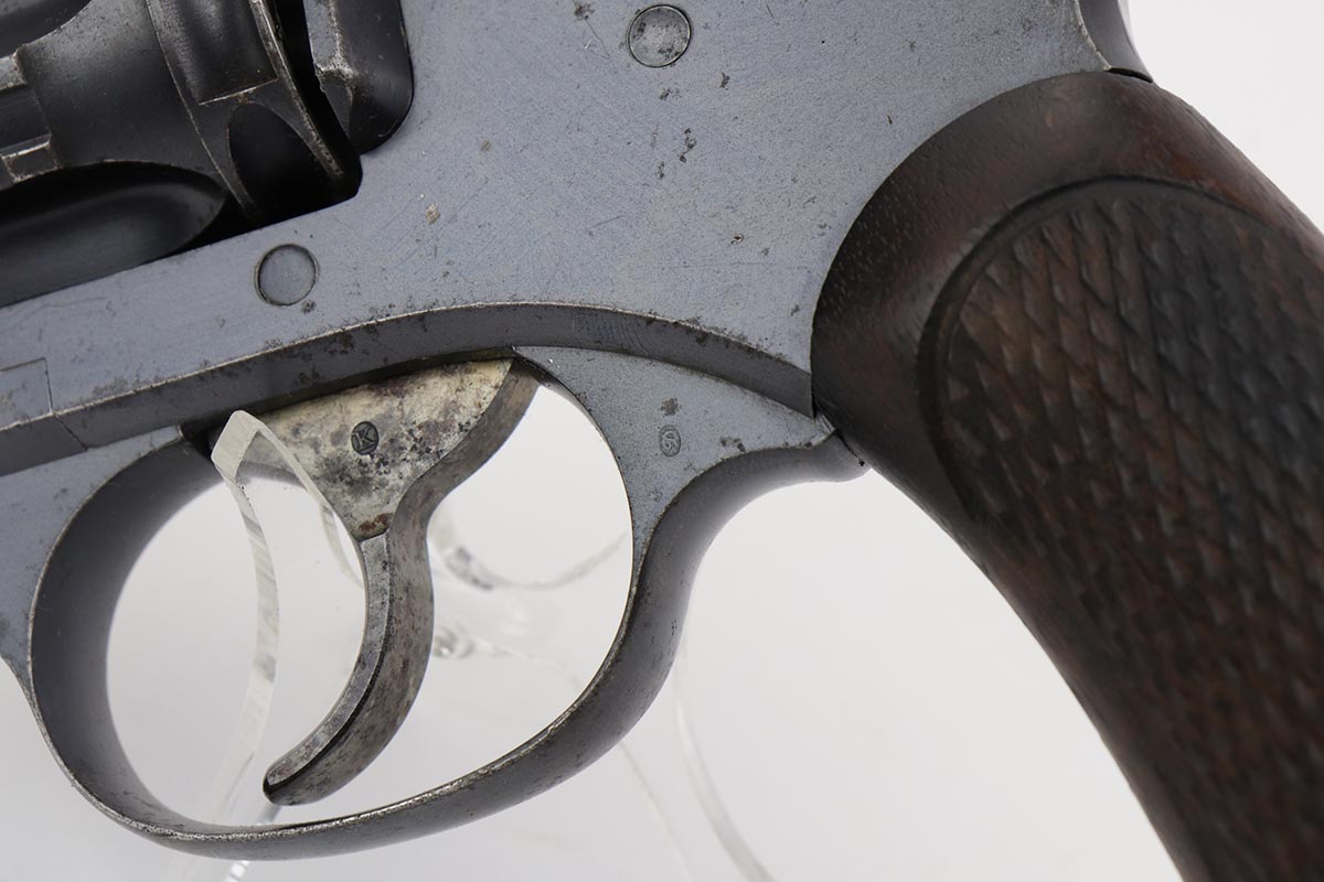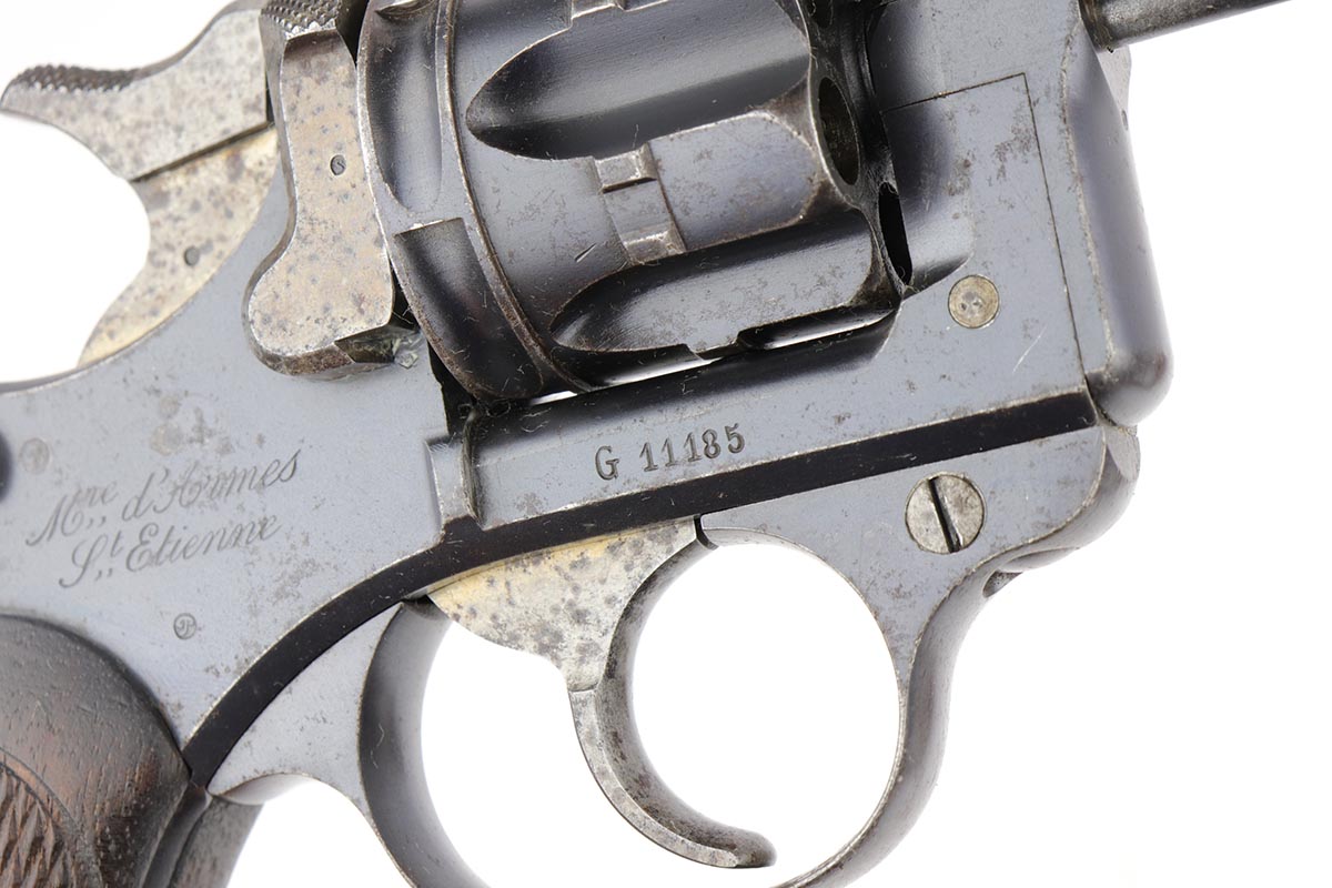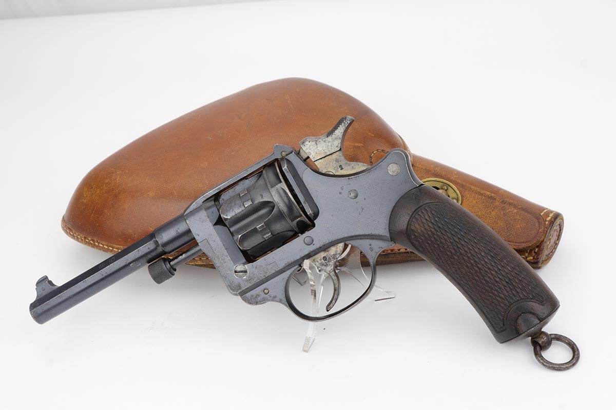 11/25/19 – This is a very nice French “St. Etienne” revolver, made in 1897. While there isn’t much actual finish loss, mostly just on the trigger guard, there is some oxidation and/or freckling on most of the blued surfaces. The gun is all matching, and comes with a capture document from 1945 that states the gun was brought back with a few German arms of the period, and has the serial of the revolver on it. Grips are in great shape and the bore is mint, barely even looks fired. Listing includes an excellent, scarce holster that is dated to 1937 and is correct for a French M1892.
