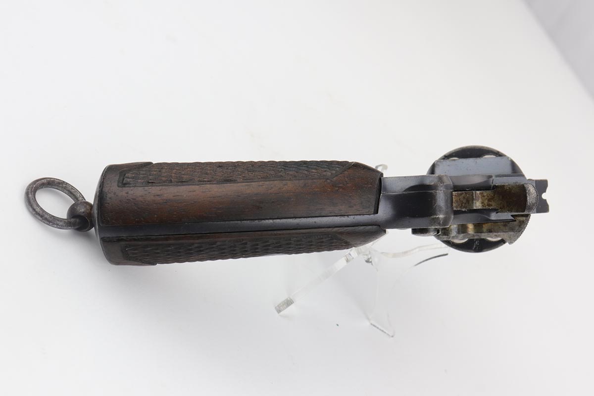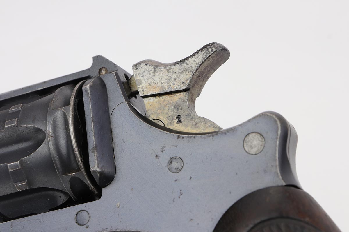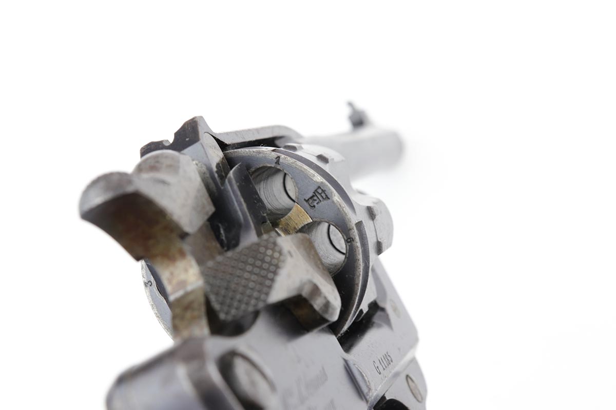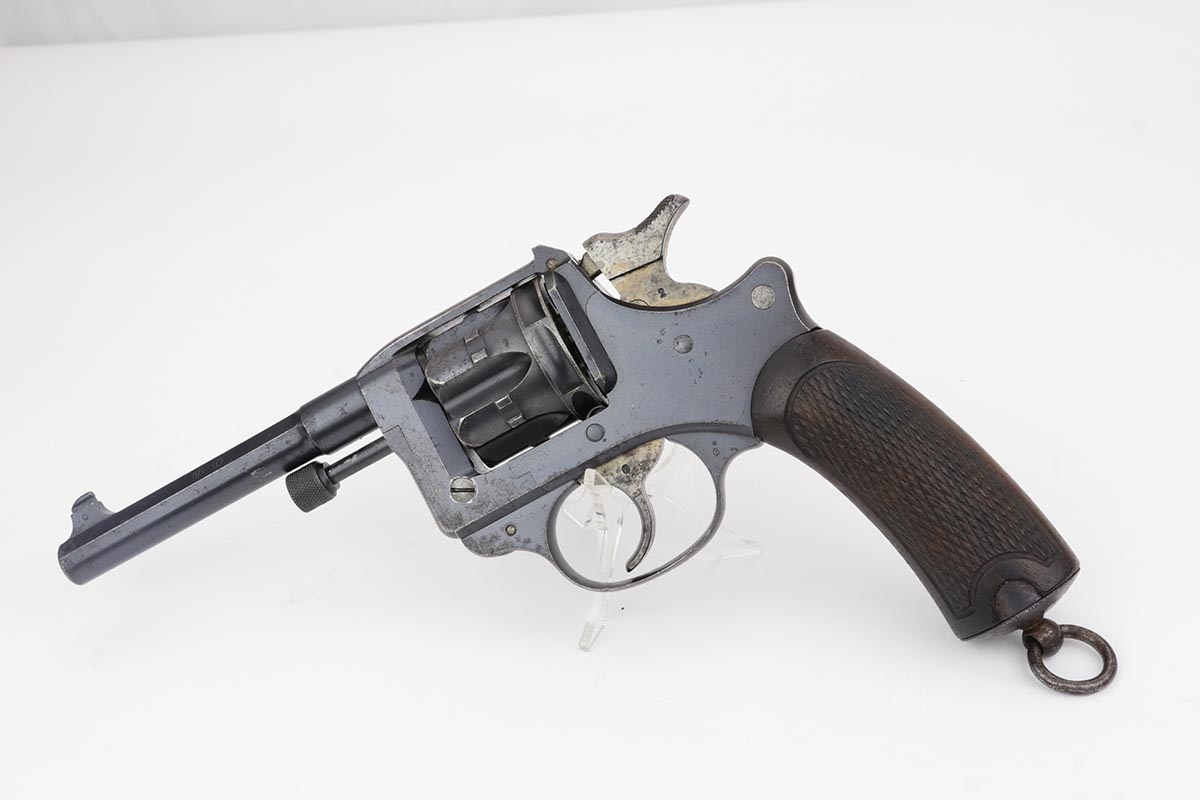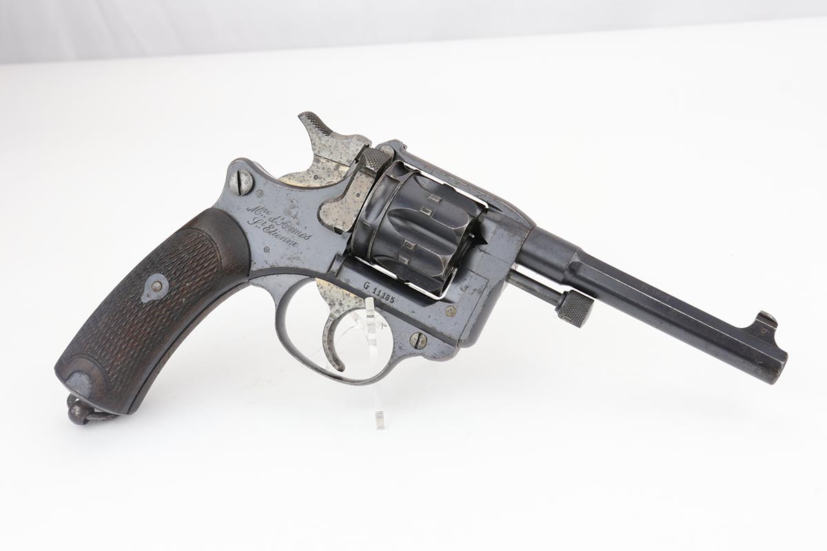 11/25/19 – This is a very nice French “St. Etienne” revolver, made in 1897. While there isn’t much actual finish loss, mostly just on the trigger guard, there is some oxidation and/or freckling on most of the blued surfaces. The gun is all matching, and comes with a capture document from 1945 that states the gun was brought back with a few German arms of the period, and has the serial of the revolver on it. Grips are in great shape and the bore is mint, barely even looks fired. Listing includes an excellent, scarce holster that is dated to 1937 and is correct for a French M1892.