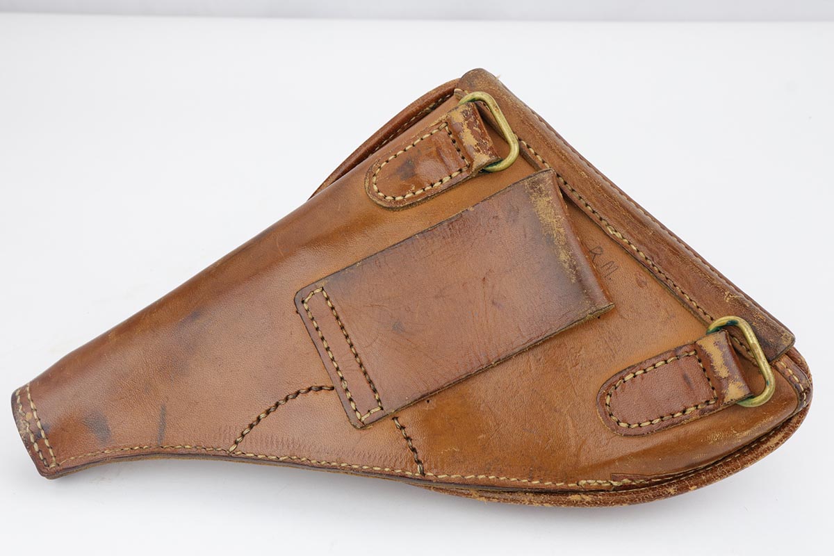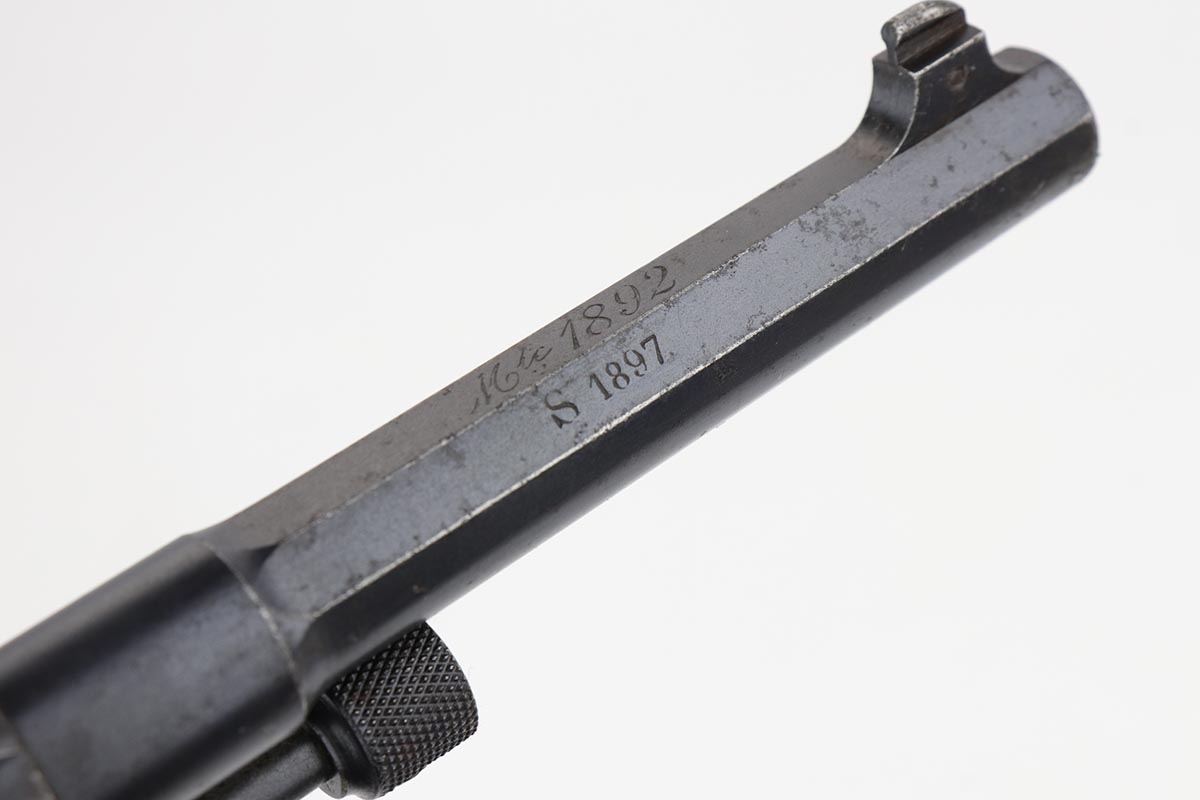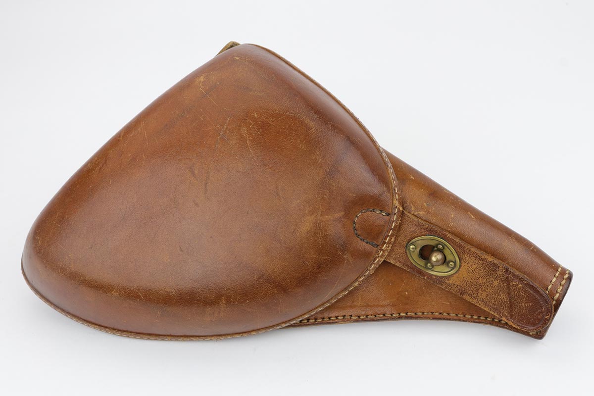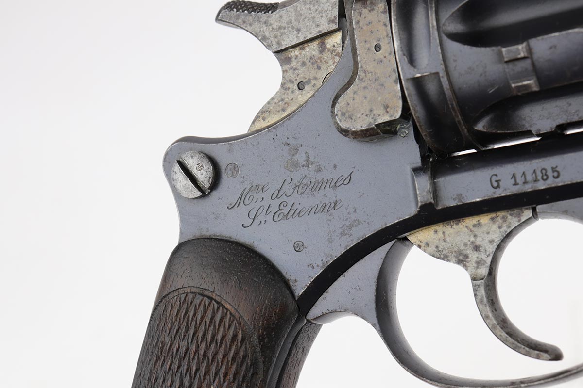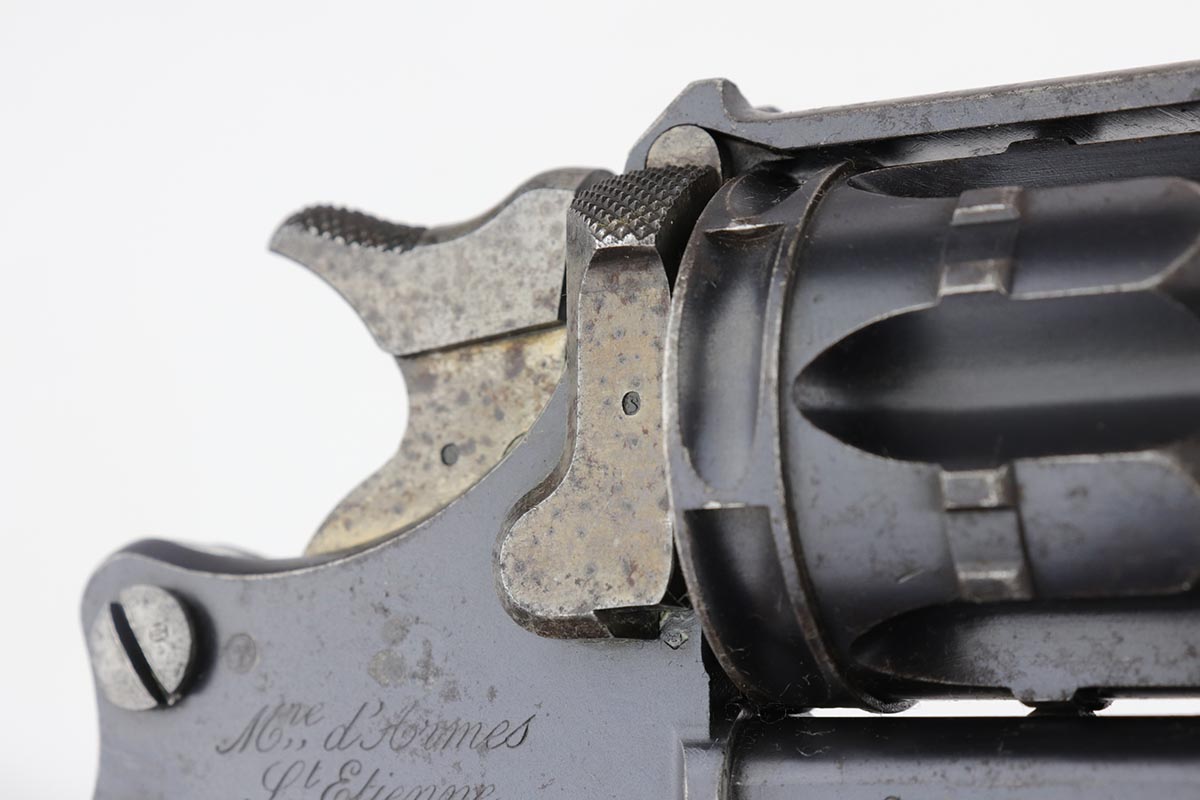11/25/19 – This is a very nice French “St. Etienne” revolver, made in 1897. While there isn’t much actual finish loss, mostly just on the trigger guard, there is some oxidation and/or freckling on most of the blued surfaces. The gun is all matching, and comes with a capture document from 1945 that states the gun was brought back with a few German arms of the period, and has the serial of the revolver on it. Grips are in great shape and the bore is mint, barely even looks fired. Listing includes an excellent, scarce holster that is dated to 1937 and is correct for a French M1892.