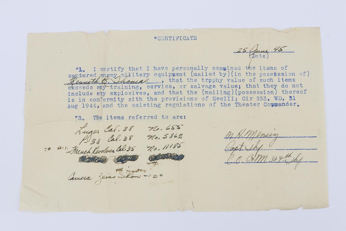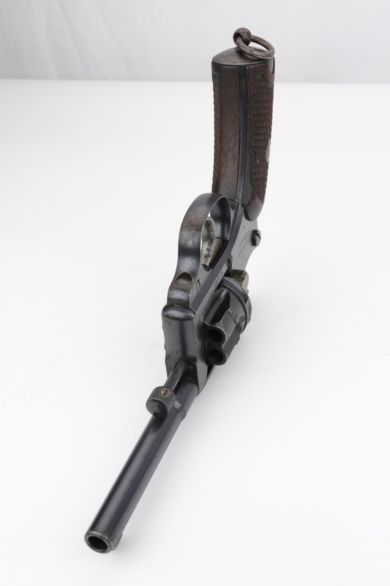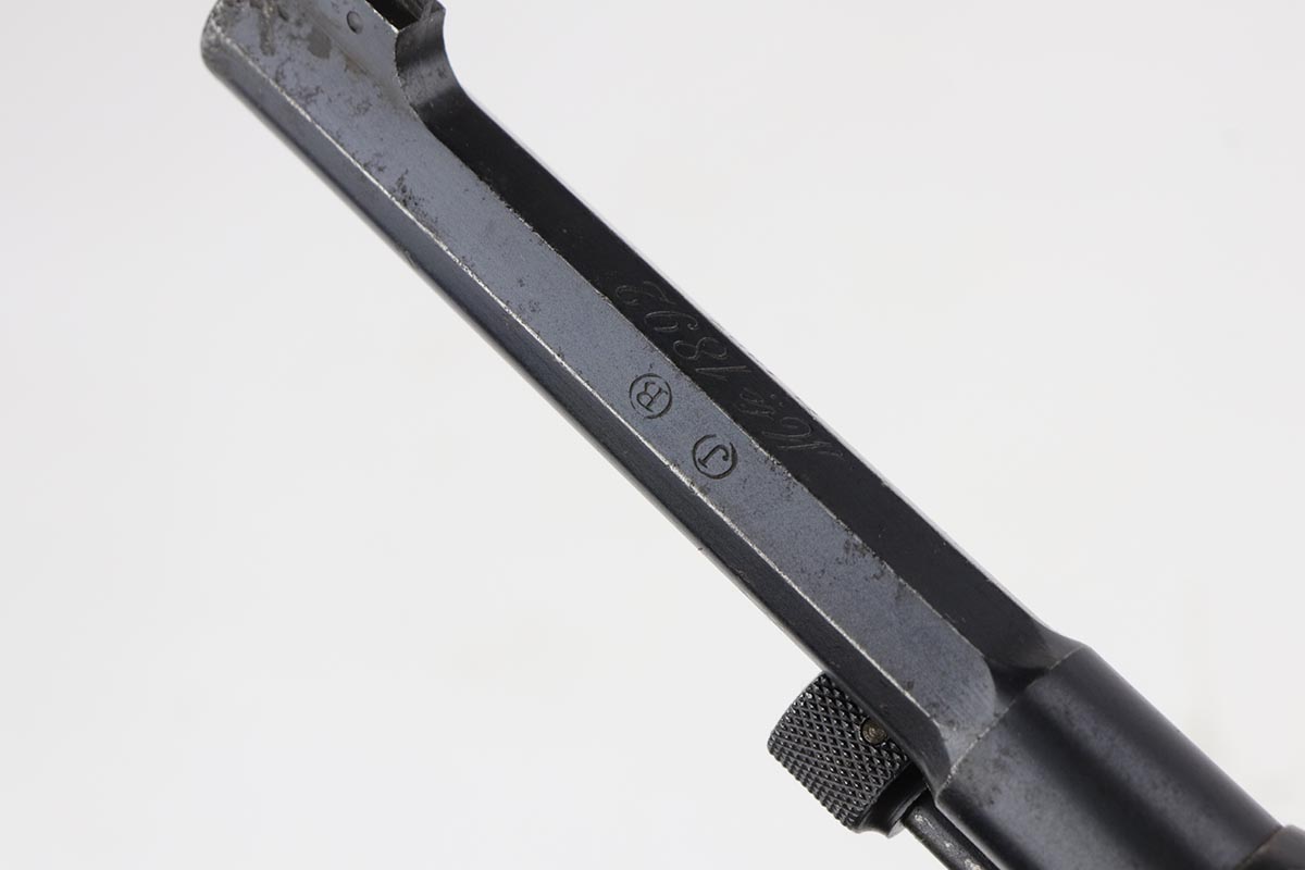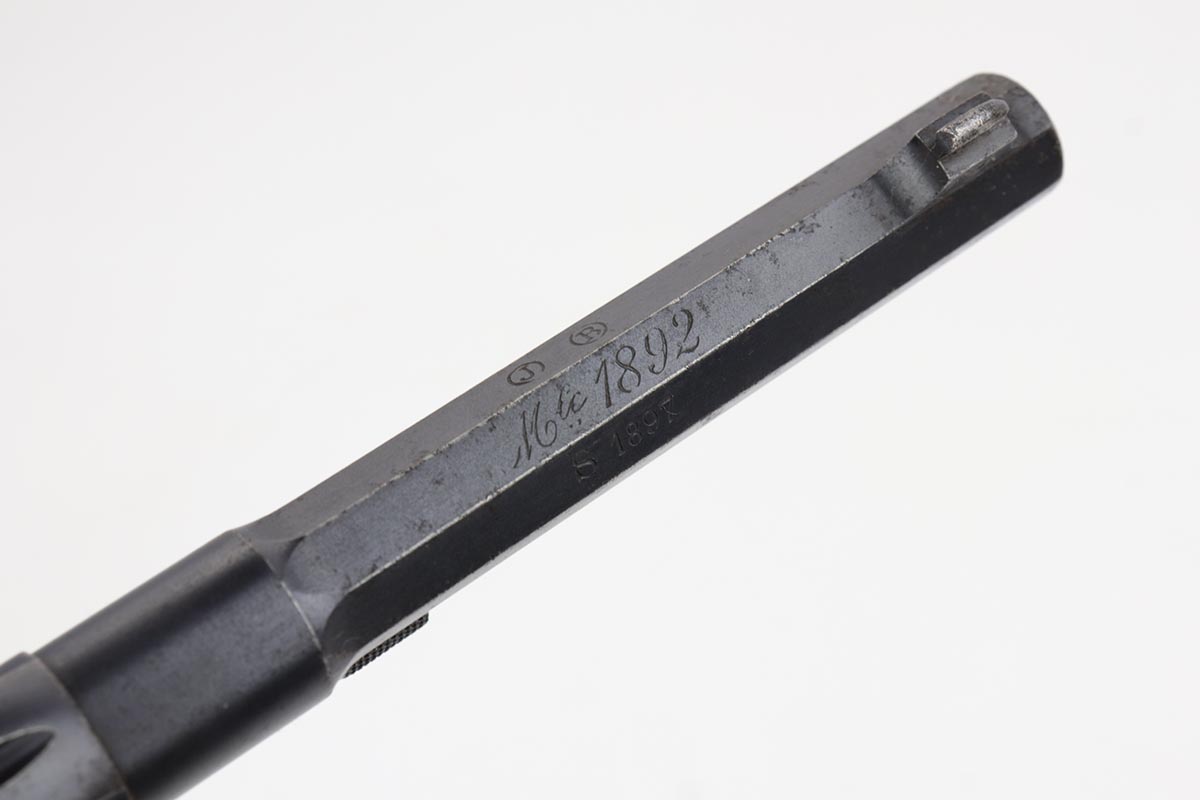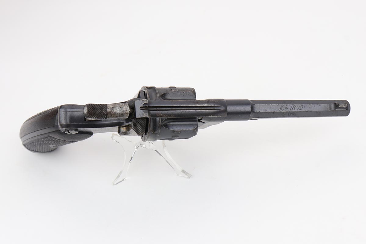 11/25/19 – This is a very nice French “St. Etienne” revolver, made in 1897. While there isn’t much actual finish loss, mostly just on the trigger guard, there is some oxidation and/or freckling on most of the blued surfaces. The gun is all matching, and comes with a capture document from 1945 that states the gun was brought back with a few German arms of the period, and has the serial of the revolver on it. Grips are in great shape and the bore is mint, barely even looks fired. Listing includes an excellent, scarce holster that is dated to 1937 and is correct for a French M1892.