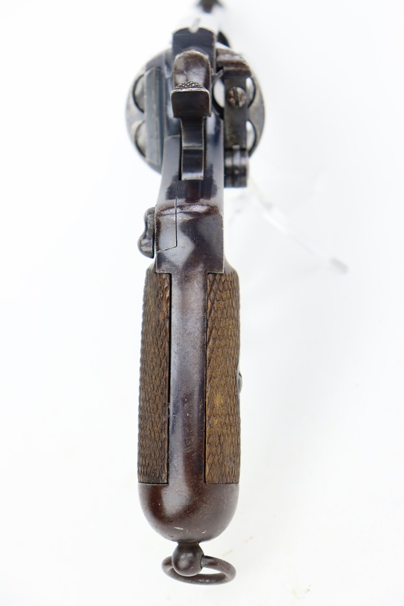 Internally no parts are missing. Side plate opens properly and retaining screws are all present. Correct finely checkered wooden grips. There is no looseness in the grips; they are fitted perfectly. Original lanyard ring present. Bore is shiny with strong rifling but does have pitting around the muzzle end.