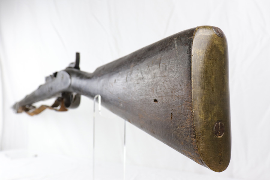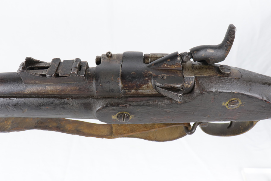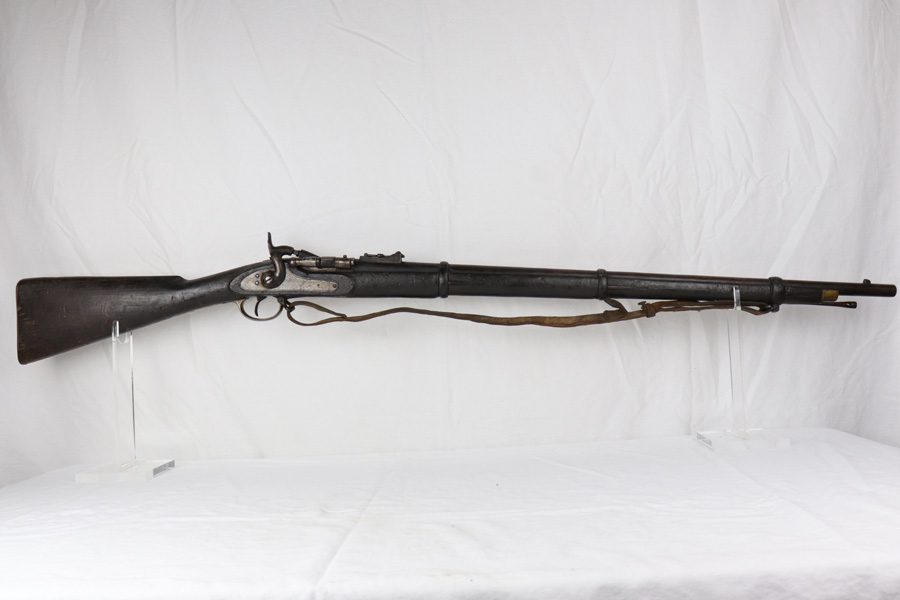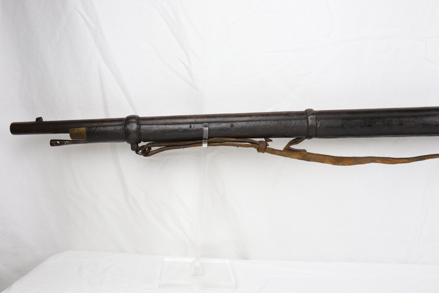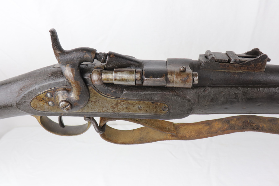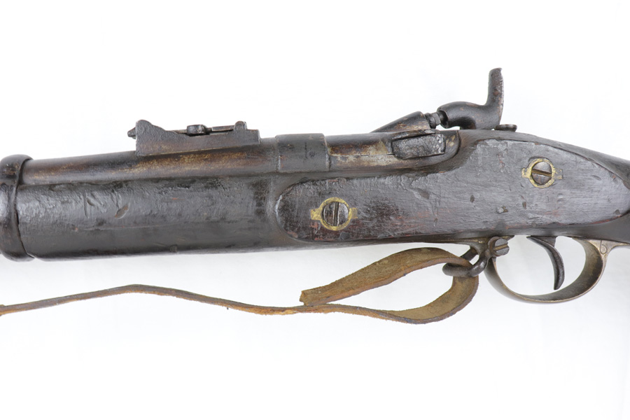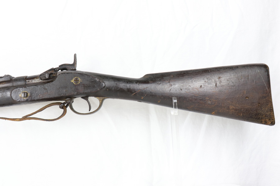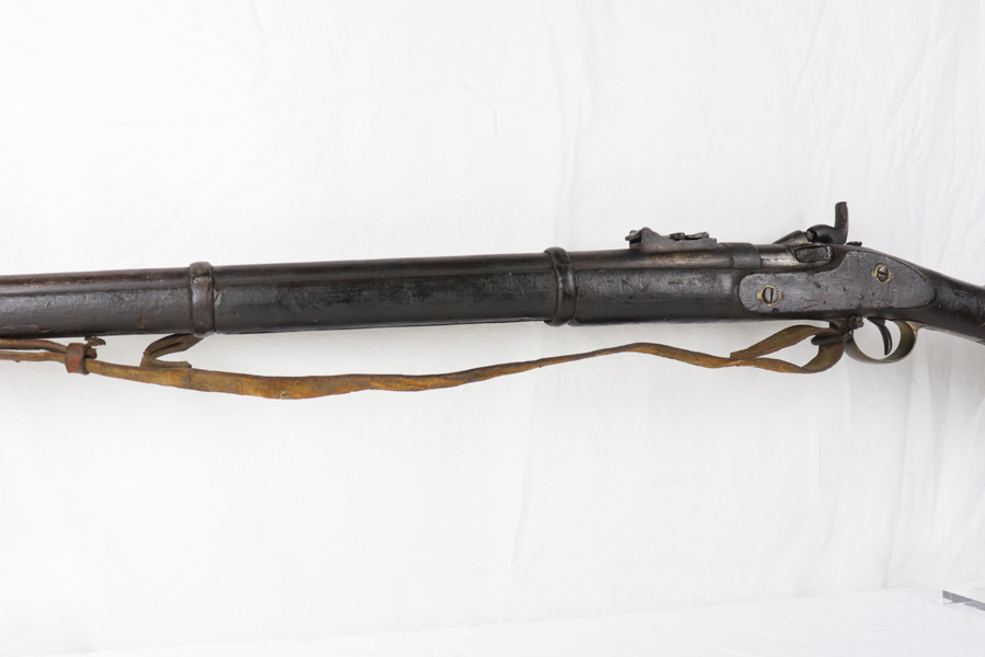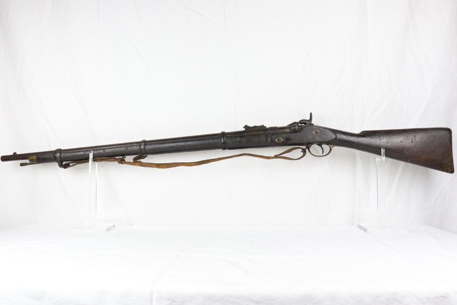 10/25/18 – This is a Pattern 53 rifle from the civil-war era. The rifle is clearly aged, but remains in solid condition for its age. Most collectors appreciate that the rifle is uncleaned and being presented “as-is”. There are minor scratches and small chips on the wood, and the metal parts have brown discoloration as shown. The bore is fairly shiny with some light frosting. The original sling, while petrified and worn, is fully intact and with the firearm even after all the years. The firing mechanism is functional and the previous owner has fired this rifle – so verified fully functional. The Pattern 1853 is known as one of the first firearms to be fitted with a rifled barrel, which is why it is categorized as a rifle-musket. Around 900,000 Pattern 1853’s were imported into the U.S. for use during the American Civil War by both the North and the South. The rifle-musket was particularly desired among the ranks of the confederacy as most of the troops were otherwise equipped with the older smoothbore muskets of the day. Guaranteed original and authentic.